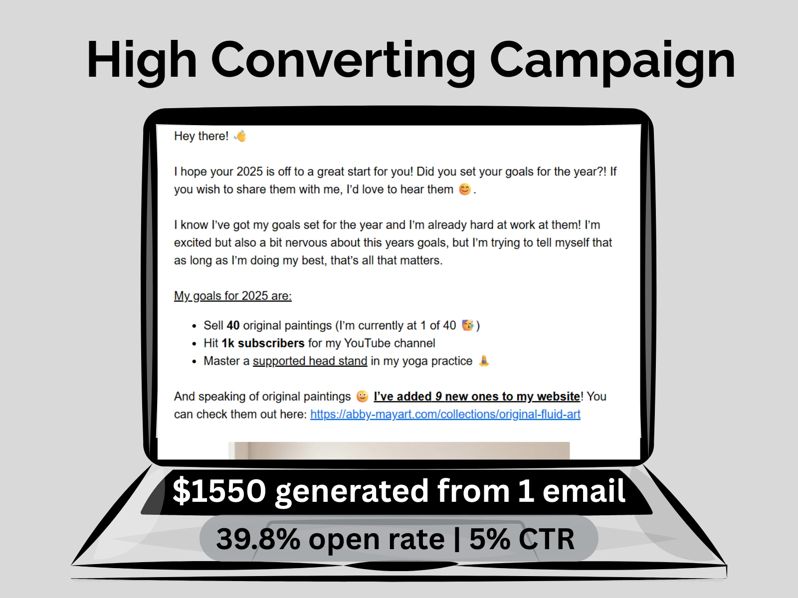Engaging, conversion-driven email campaigns that boost open rates, drive clicks, and increase revenue. Example shows $1550 generated from 1 email