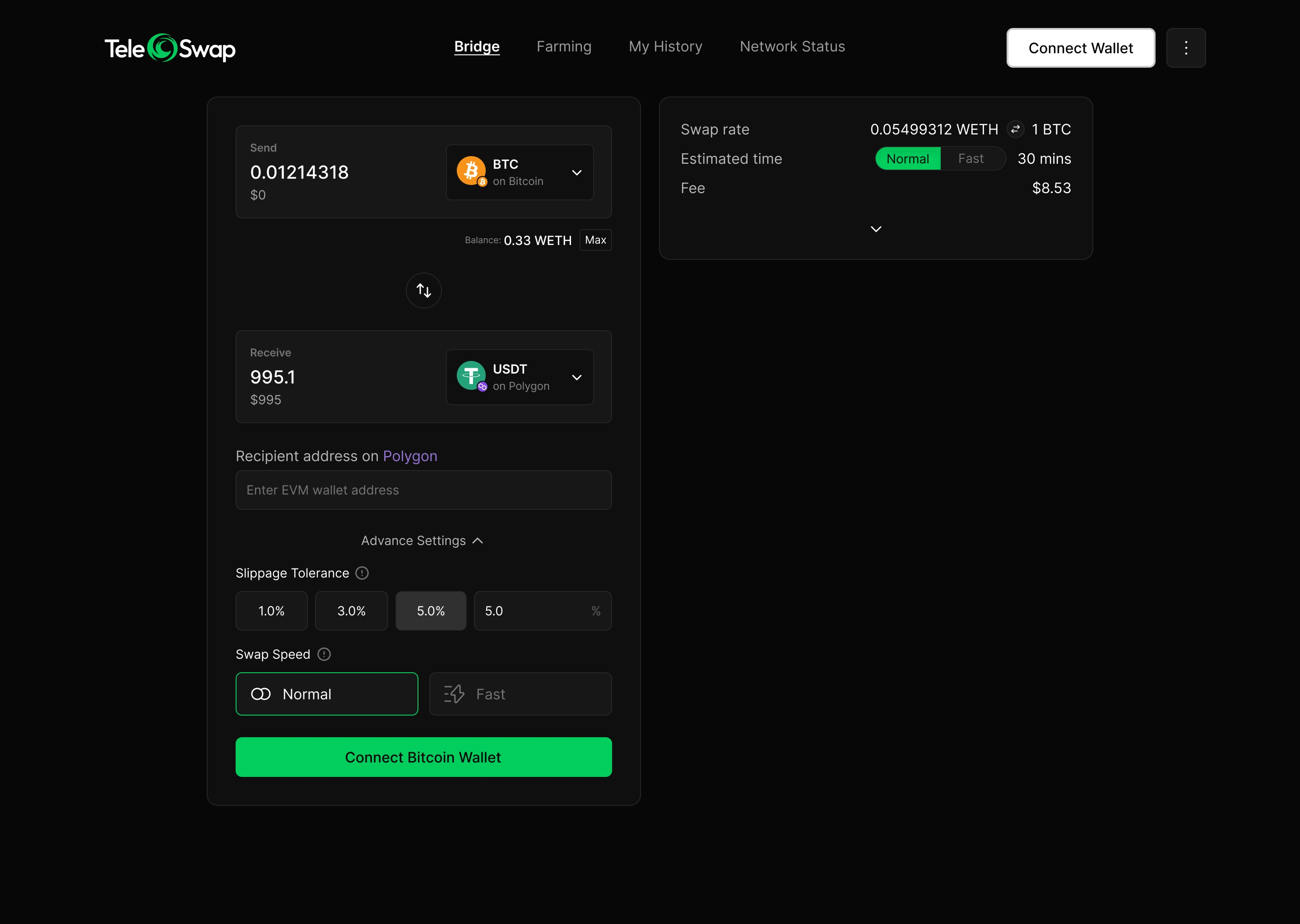 TeleSwap (formerly TeleportDAO) is a cross-chain swap and BTC bridging platform enabling users to wrap, unwrap, and trade Bitcoin across EVM chains like Polygon, without relying on centralized intermediaries.