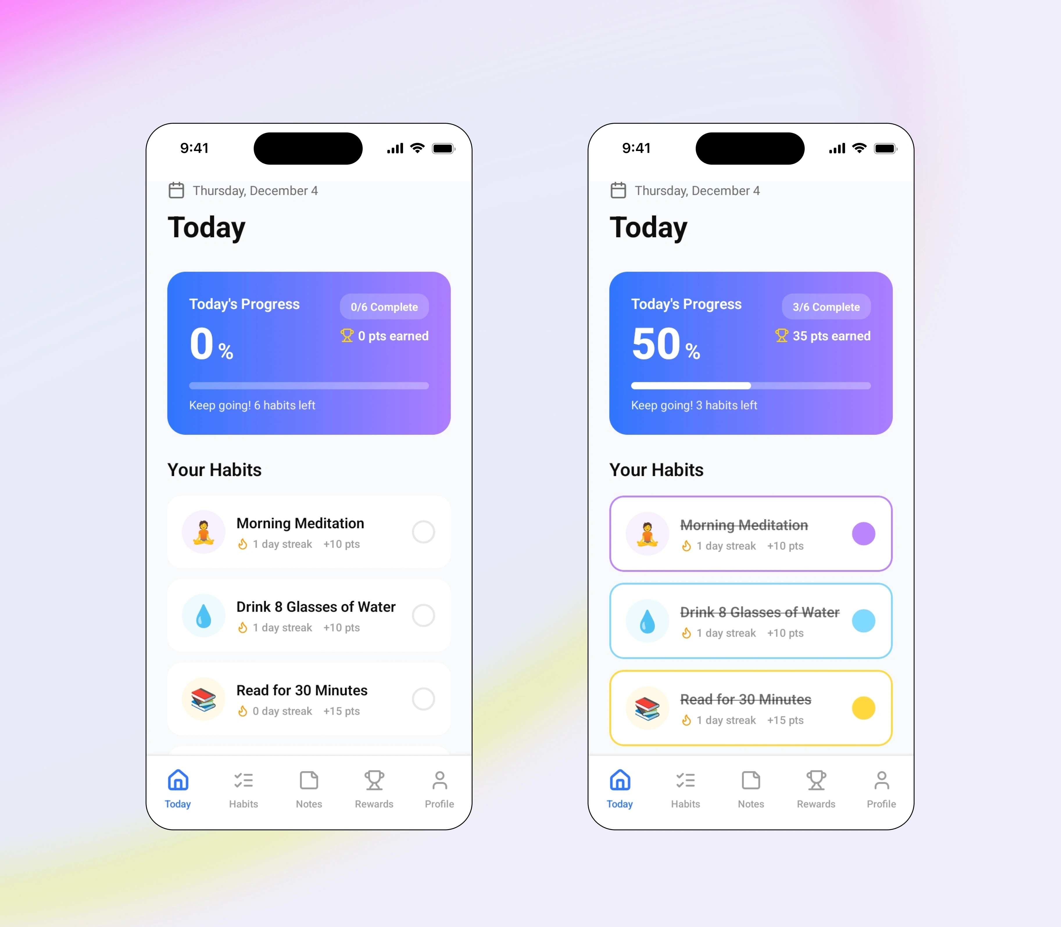 Every completed goal adds to the users progress score. This creates motivation and gives a clear measure of how steady their habits are.