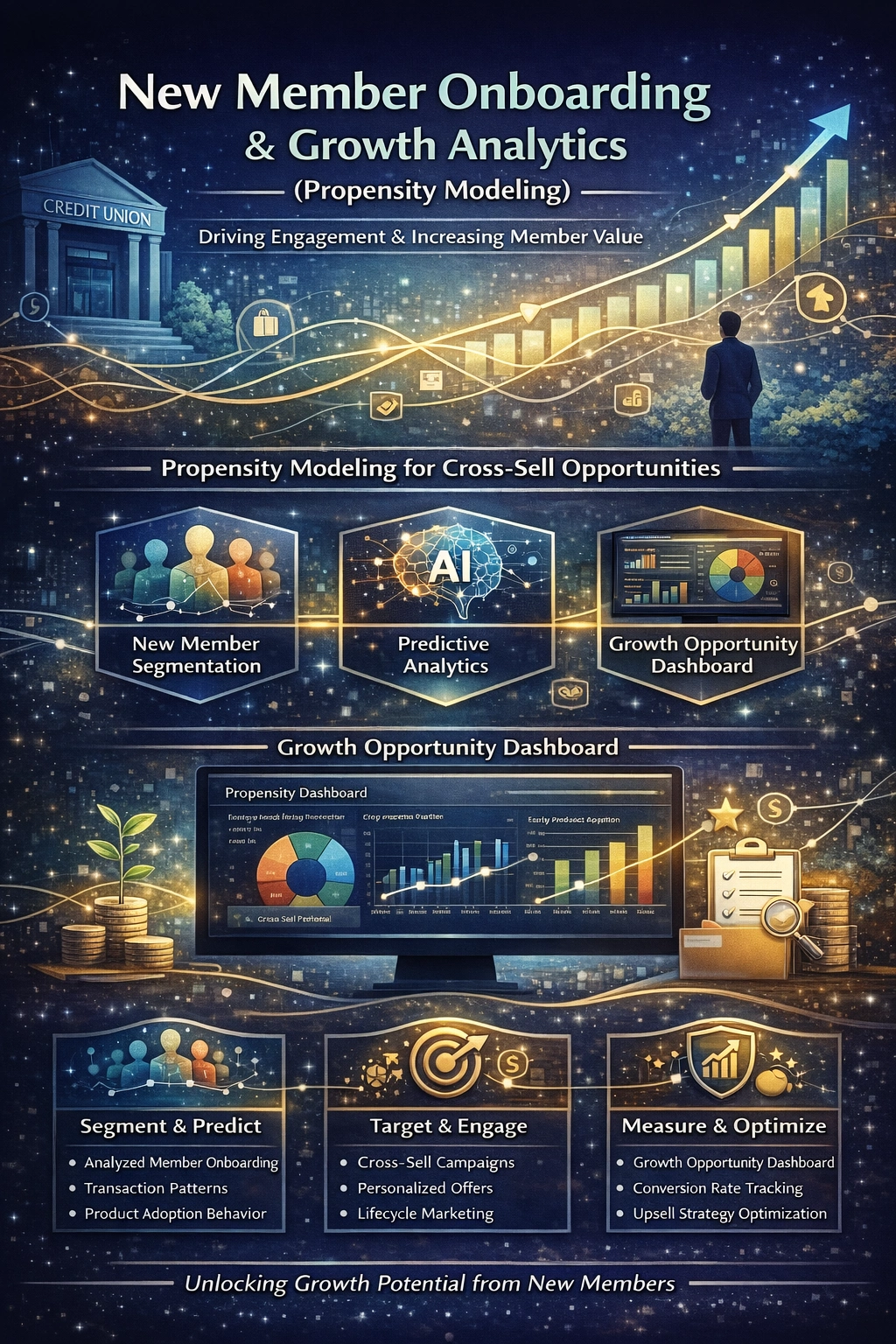 By analyzing onboarding behavior, early transaction activity, and initial product adoption patterns, the solution identified high-growth members and optimal timing for product engagement. This enabled credit unions to deliver the right product to the right member at the right time, improving engagement and long-term value.