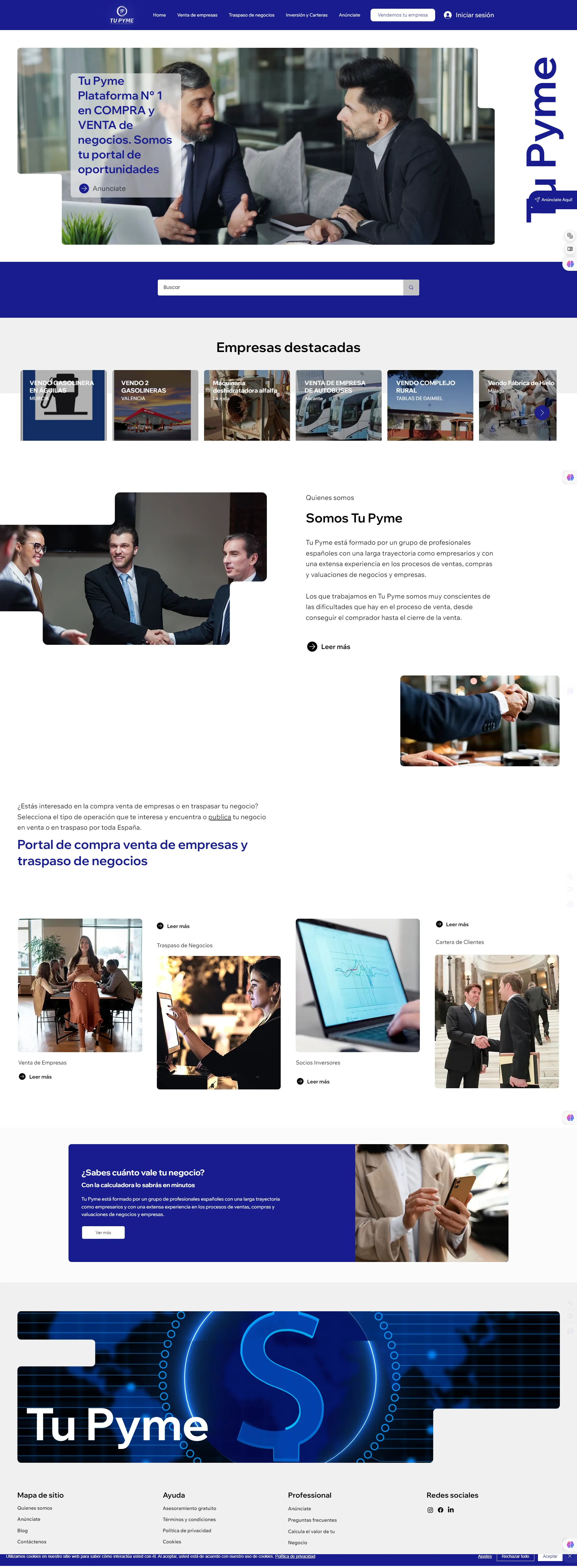 TupyMe is a B2B platform designed to help entrepreneurs in Spain buy, sell, and evaluate small businesses easily and securely. Built with Wix Studio + Velo, it combines a dynamic CMS, multi-language capability, and smart contact segmentation forms for maximum lead quality.