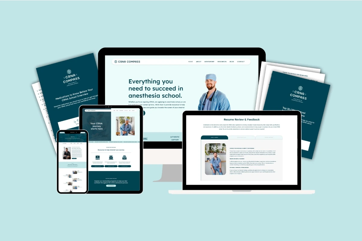 Brand identity, Squarespace website design, and copywriting for CRNA Compass, a resource hub supporting nurse anesthetists with exam prep, continuing education, and career growth. The project included updated branding, a user-friendly website, and messaging that positions the platform as both authoritative and approachable.