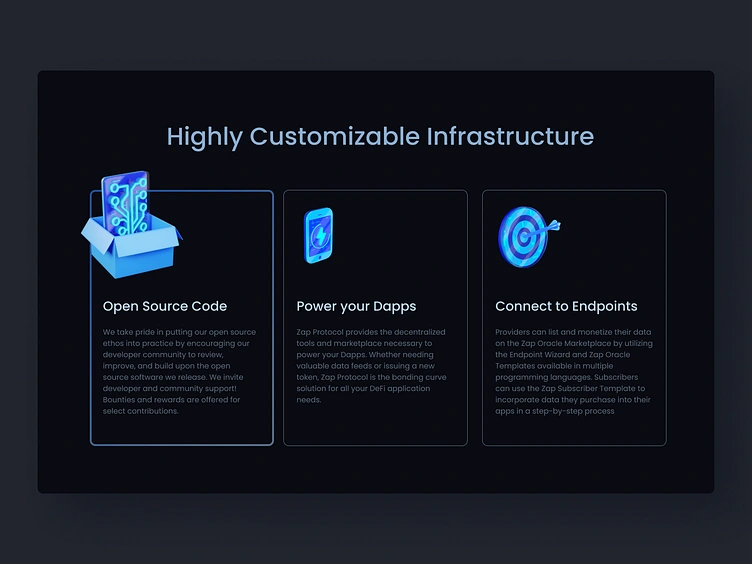 🔹 DeFi Infrastructure Highlights: “Highly Customizable Infrastructure” section that breaks down open-source code, powering dApps, and connecting to endpoints with simple, benefit-driven copy.