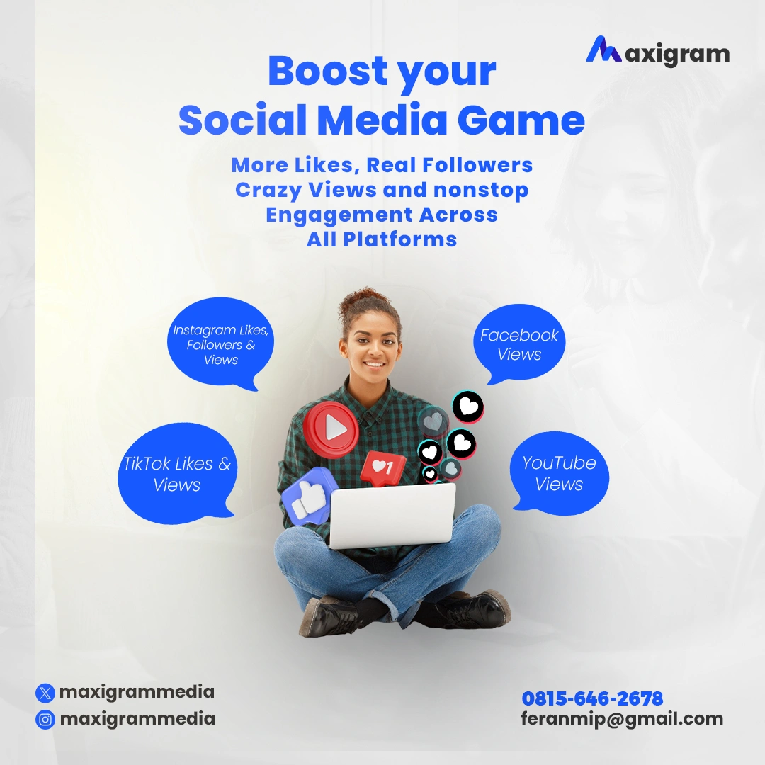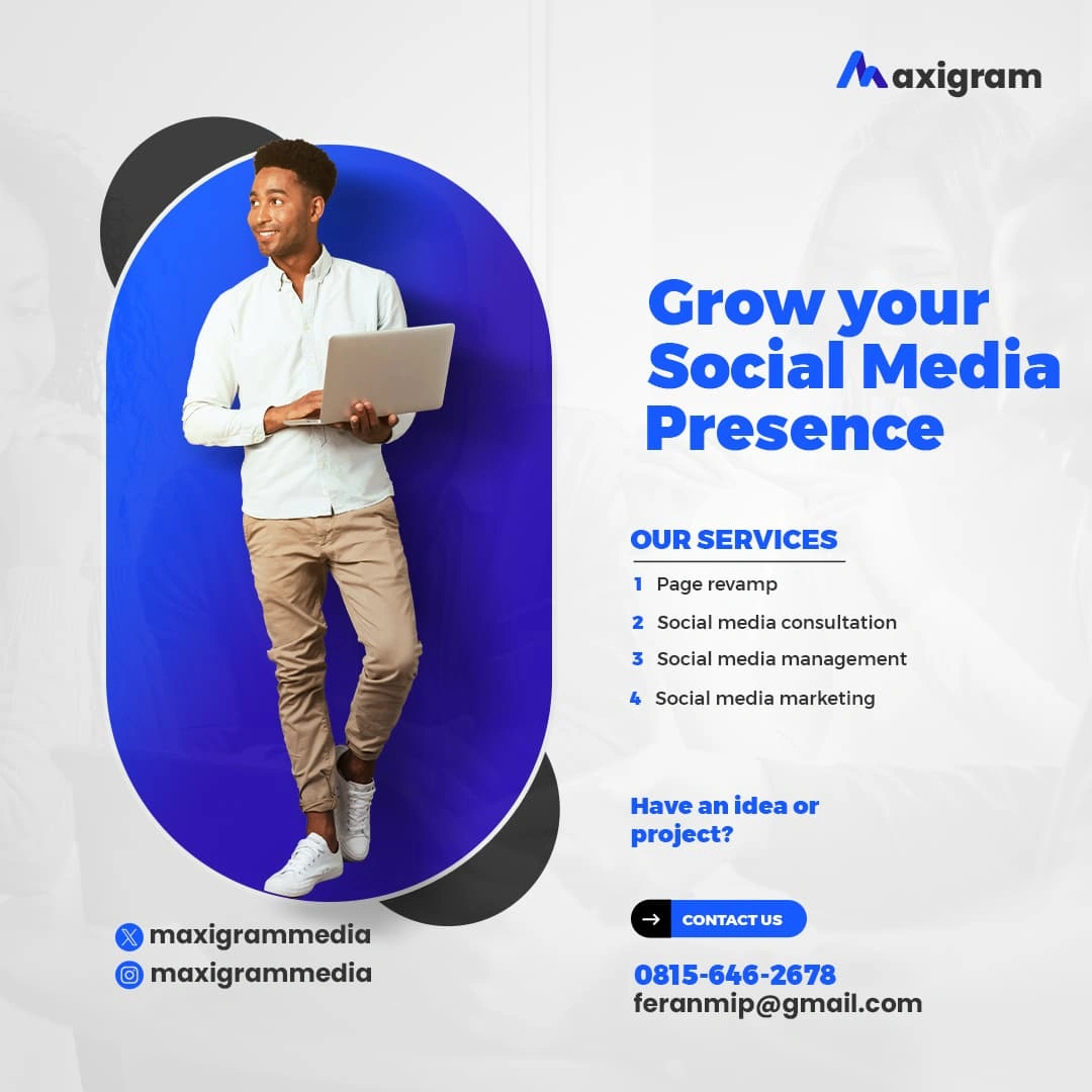 This project showcases a sleek and modern layout created for Maxigram to promote its suite of social media services. The design emphasizes professional support for page revamps, consultations, and marketing, encouraging potential clients to engage with the brand.