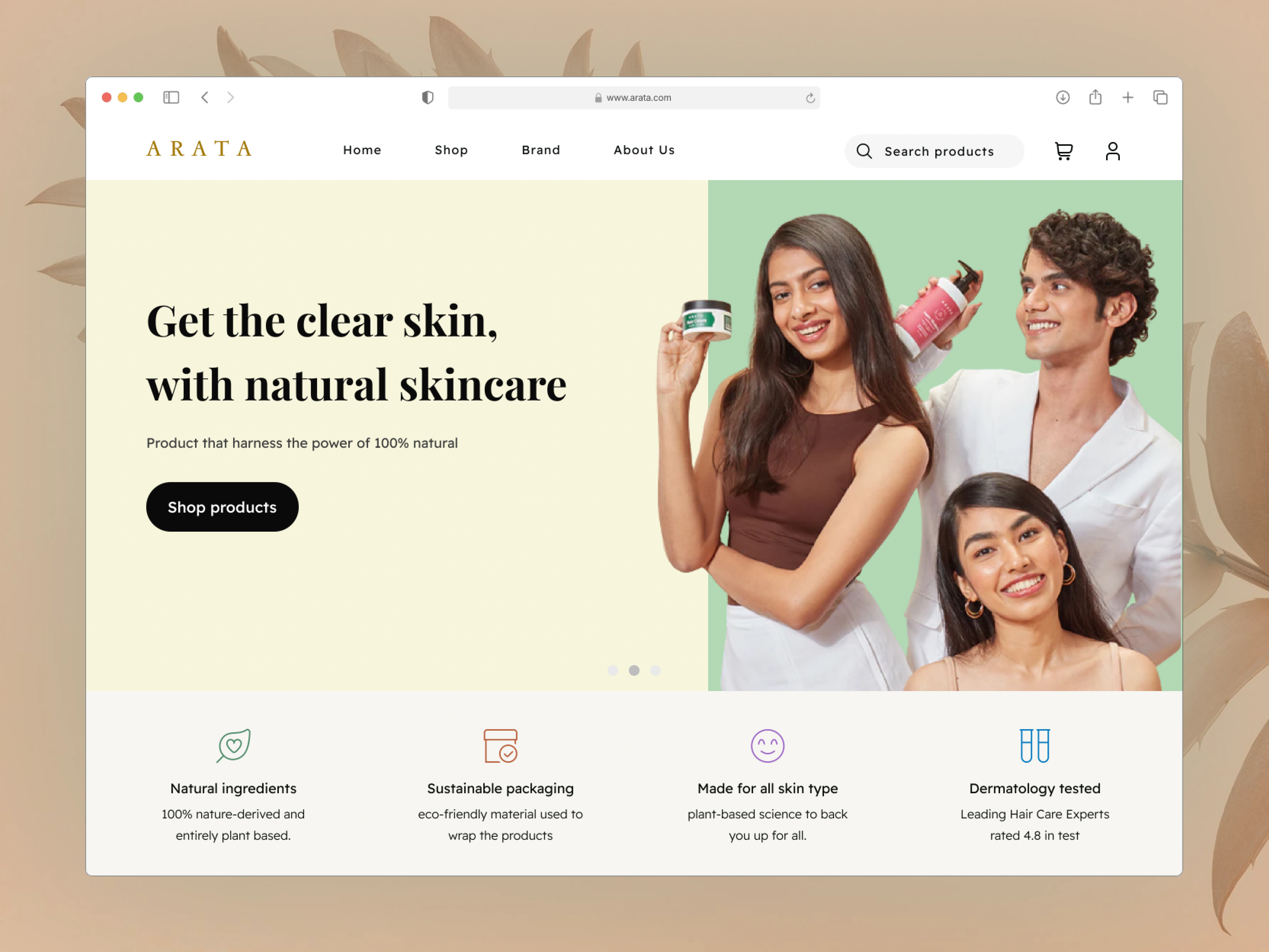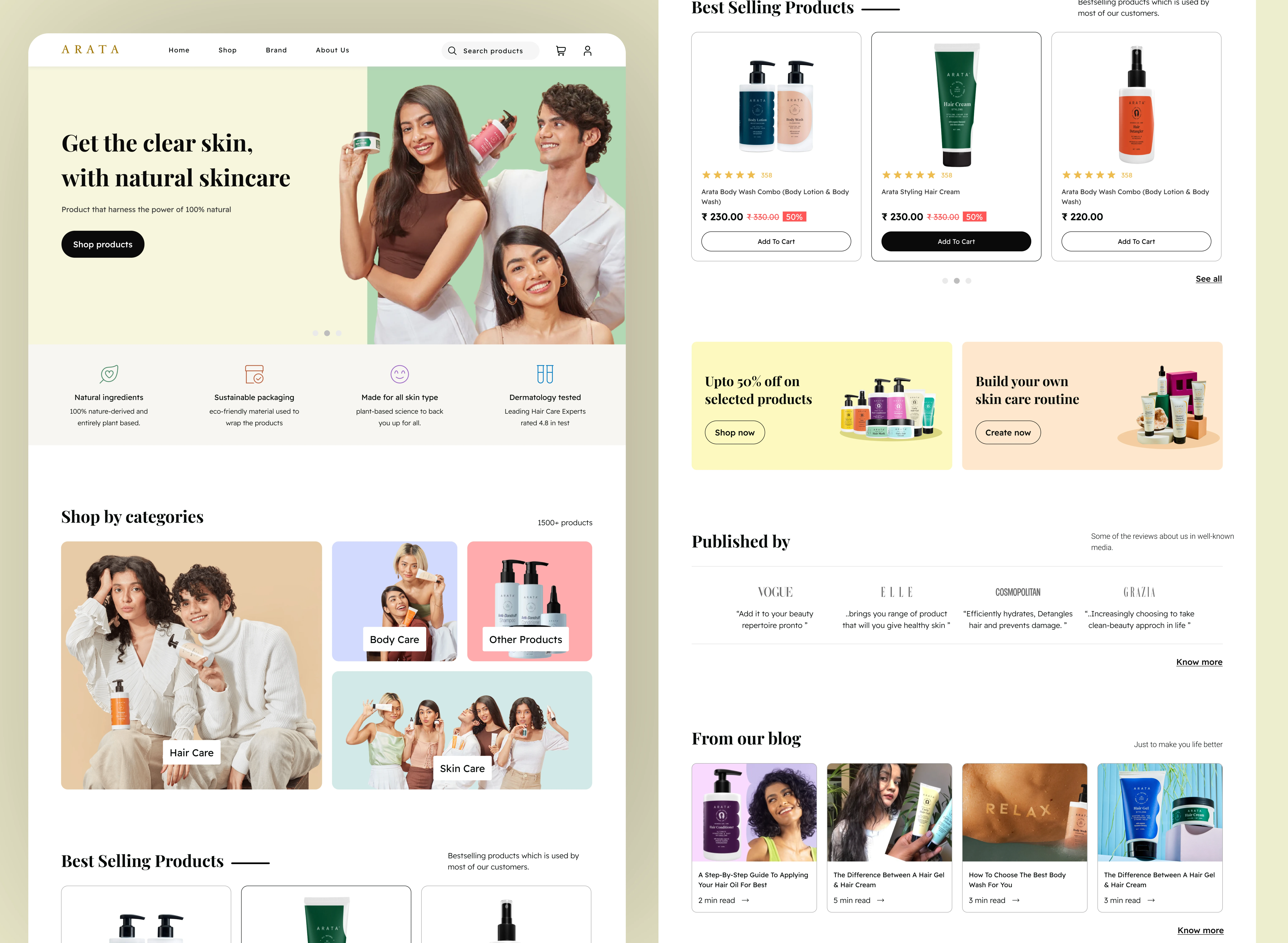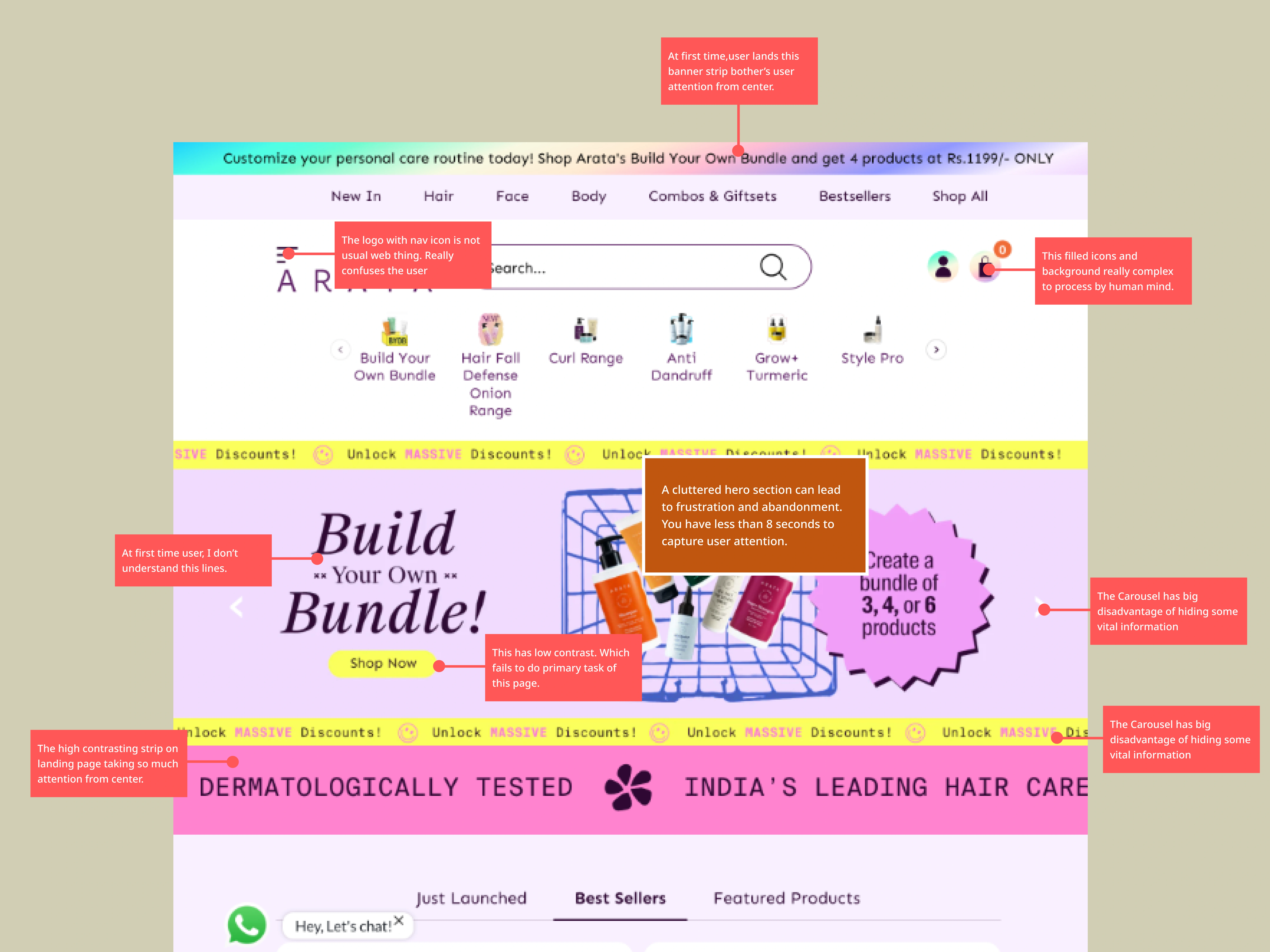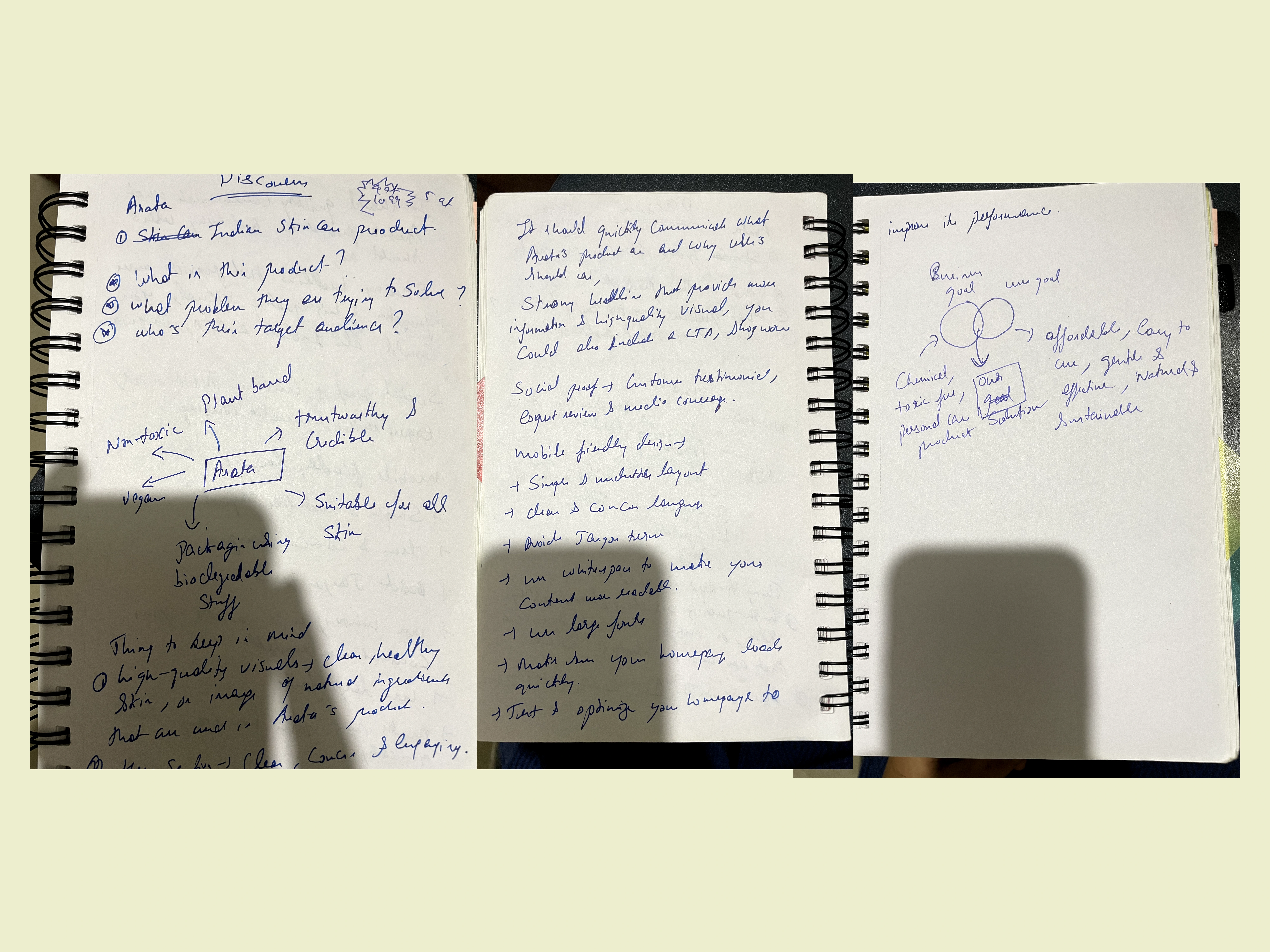 I started with user research, analysing real customer reviews from Amazon and YouTube to identify who actually buys Arata and what they care about. This surfaced a clear insight: users are ingredient-aware, health-conscious, and respond to transparency over promotion. I then ran a visual audit on the existing site, annotating specific UX failures, attention-competing hero elements, a low-contrast primary CTA, carousel patterns burying product info, and visual language misaligned with the brand's natural positioning. I built a moodboard drawing from clean, editorial skincare references to establish the design direction.