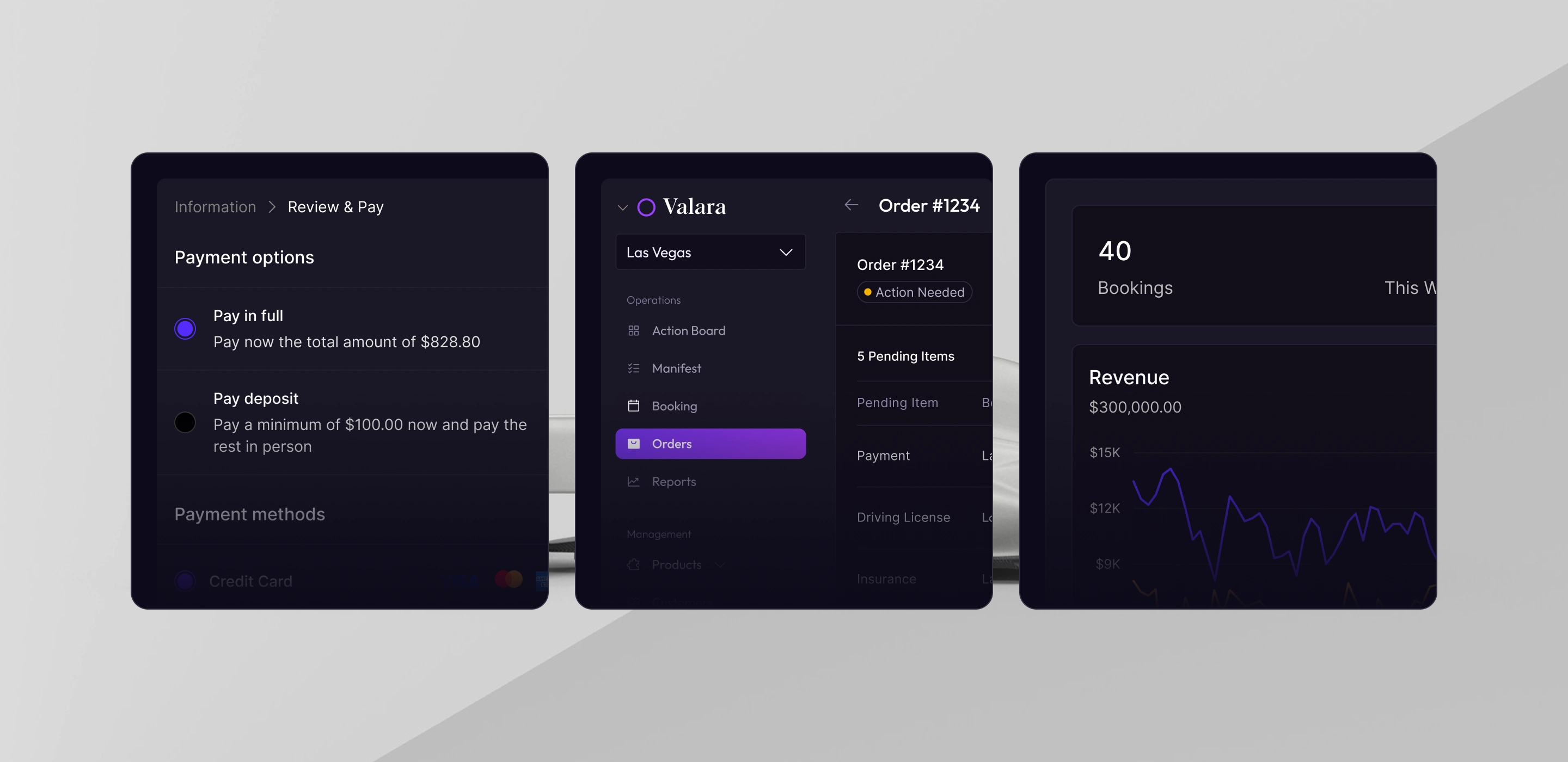 Dark tones, subtle gradients, and strategic accent colors — built to communicate control and sophistication while keeping complex data scannable. The result is a brand identity that positions Valara not just as a tool, but as the central system for running a rental business.