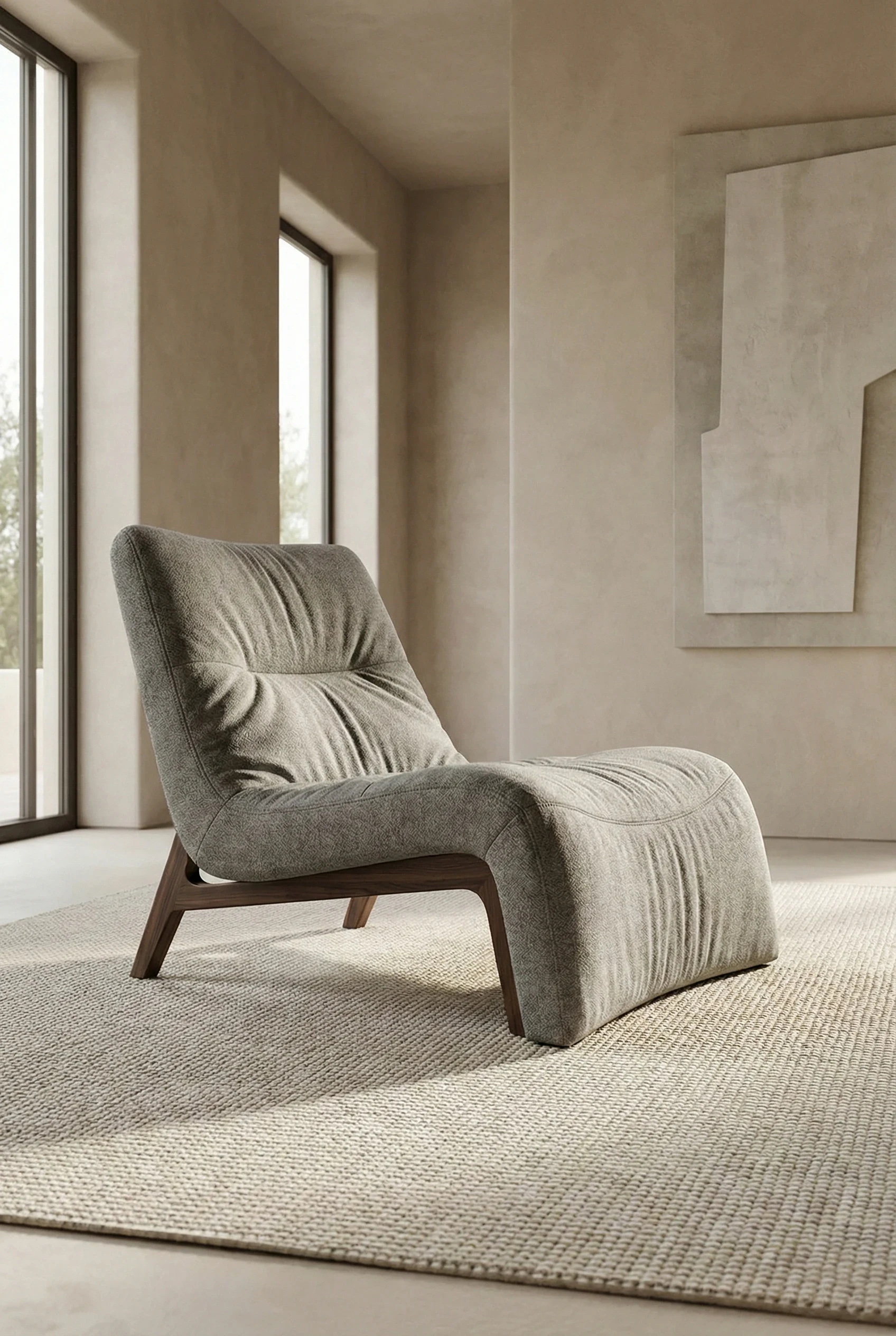 The Hawer Lounge Chair explores the relationship between posture, weight, and visual calm. The form is intentionally low and grounded, creating a sense of stability and rest through proportion rather than excess material. A continuous upholstered volume is supported by a restrained wooden structure, allowing the chair to read as both soft and architectural. Comfort is achieved through controlled angles, surface tension, and material contrast. This concept reflects a design approach focused on clarity, restraint, and long-term visual balance rather than trend-driven expression.