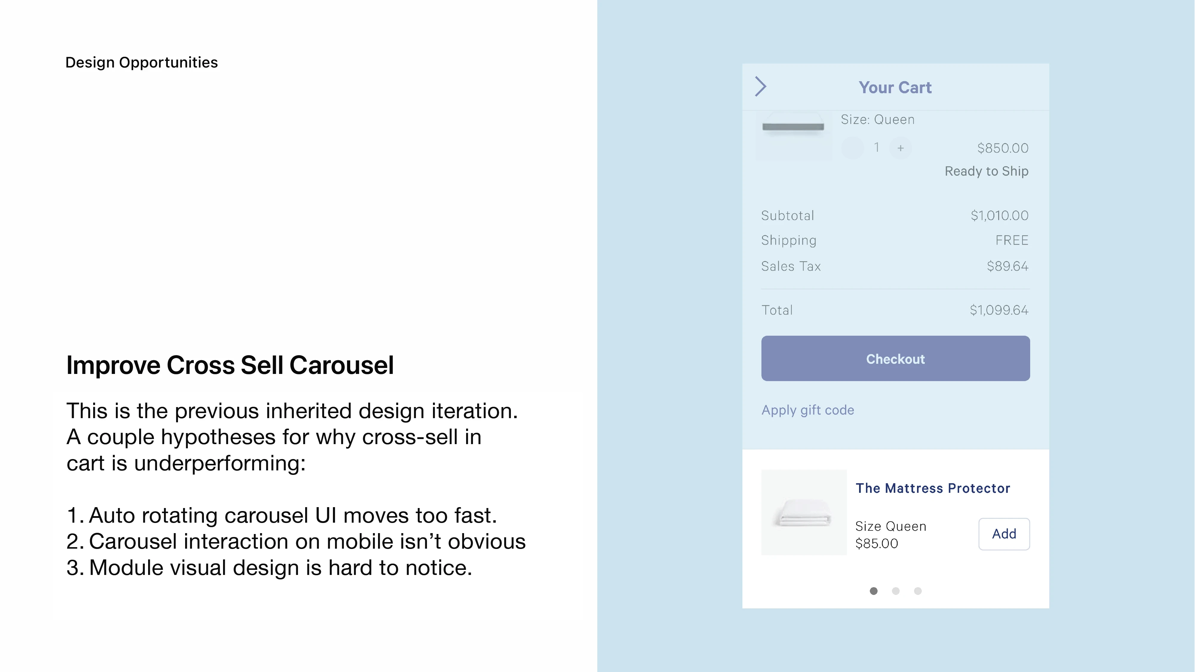 I was an early designer at Casper (Series B), contributing to high-visibility initiatives, including improvements to the e-commerce checkout experience. This case study examines a shopping cart cross-sell feature that delivered statistically significant positive results. More design examples are available, upon request.