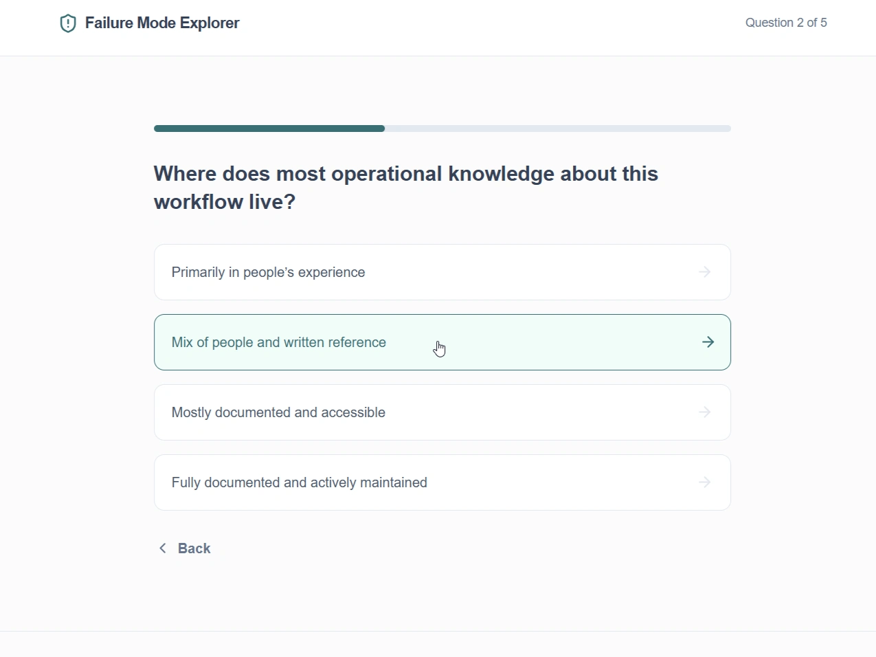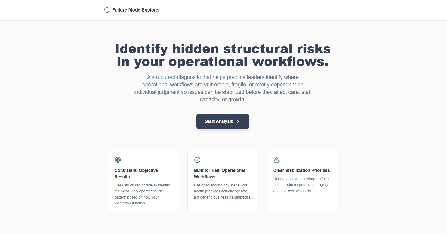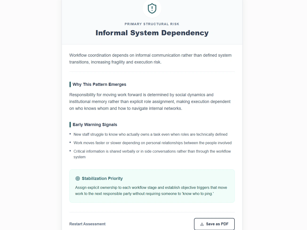 I designed and built an interactive assessment tool that helps operations leaders identify structural failure modes within their workflows and understand where stabilization efforts should focus.