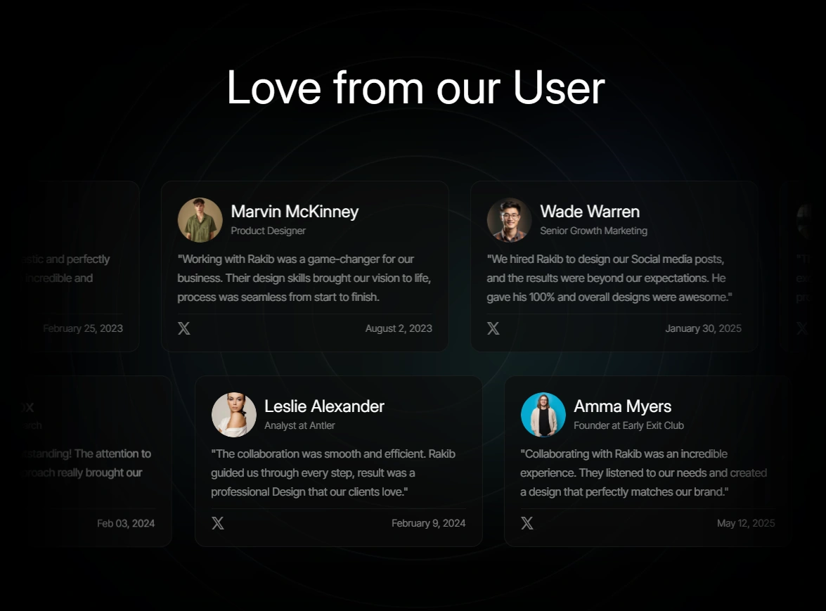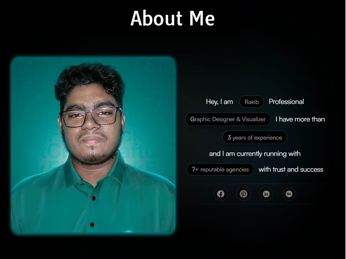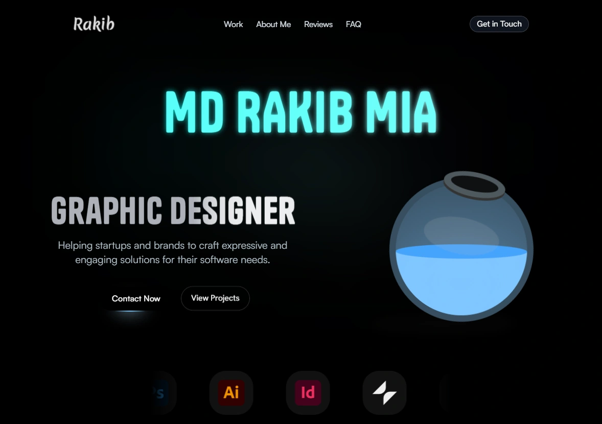 Designed a portfolio website for graphic designer MD Rakib Mia with shimmer and ticker effects.