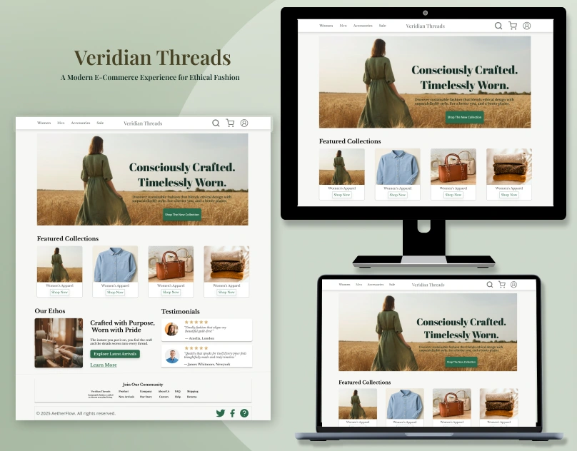 Deliverables: Desktop UI, Tablet & Laptop Mockups, Hero Section, Collections Layout, Testimonials, Footer