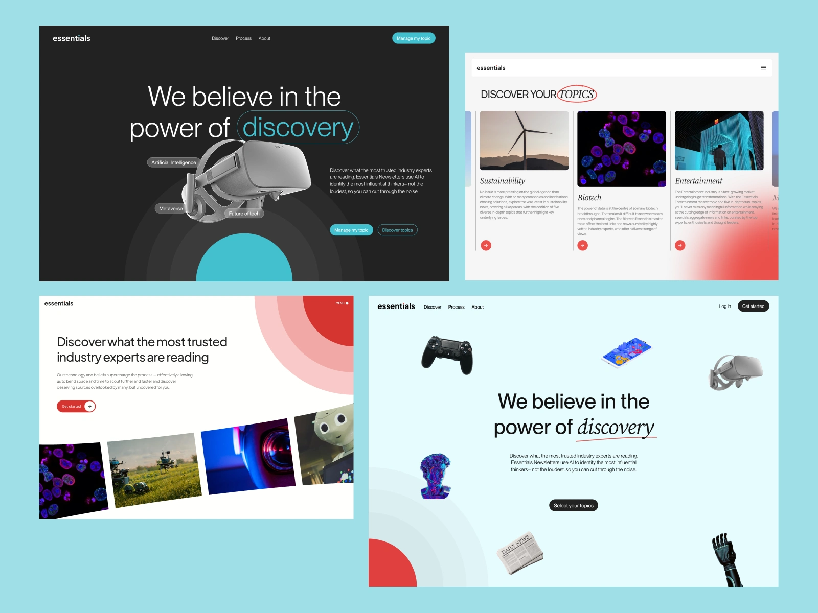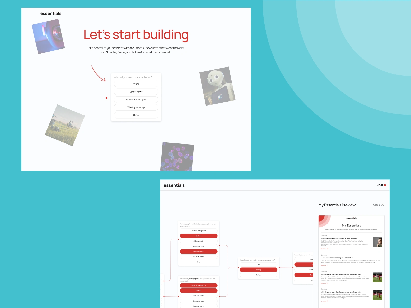 With a growing audience of readers seeking smarter ways to consume information, Essentials AI set out to transform how people explore and personalise their daily news. Our challenge was to move beyond static topic lists and create a layered, intuitive experience that feels both intelligent and effortless.
