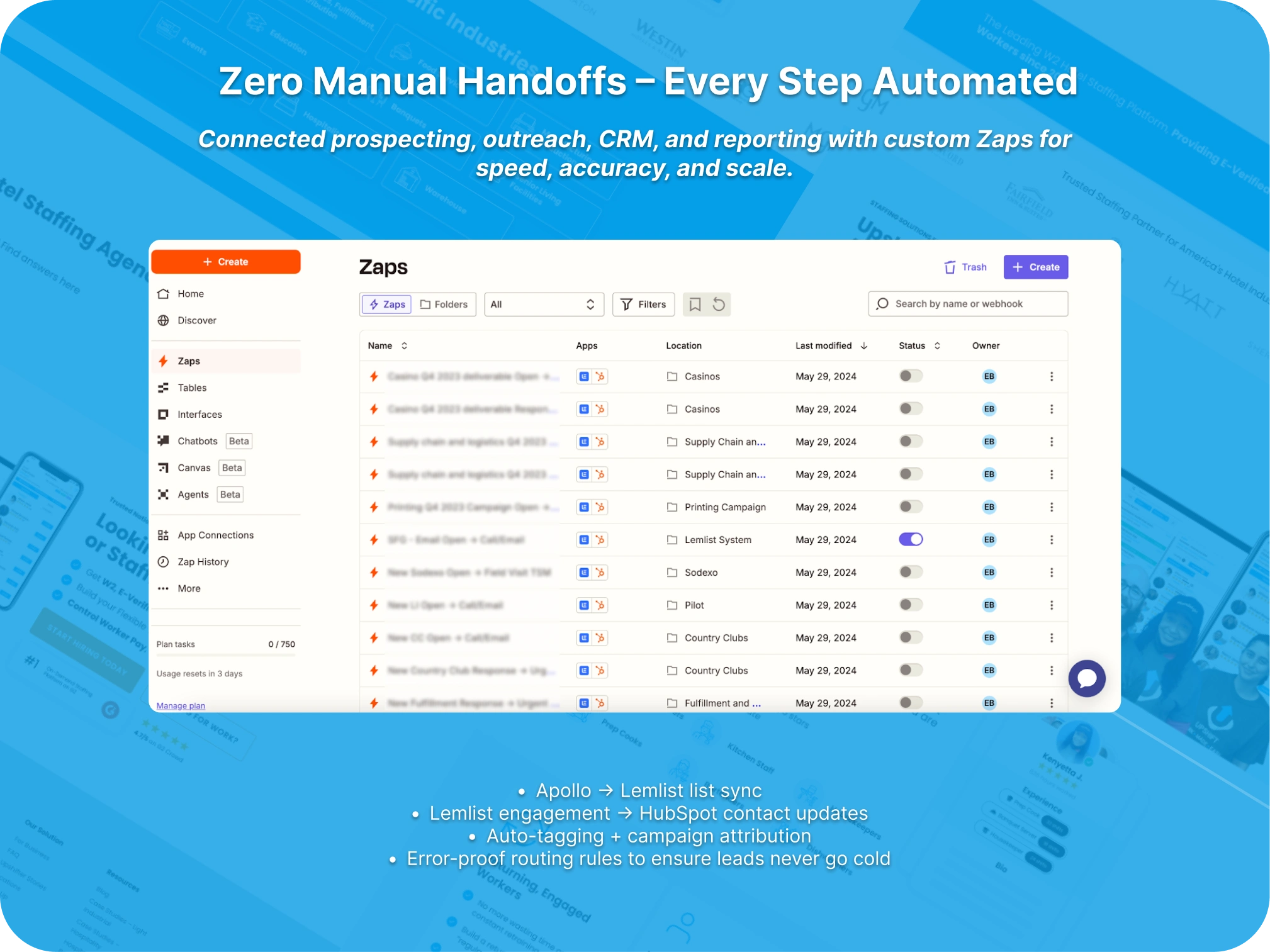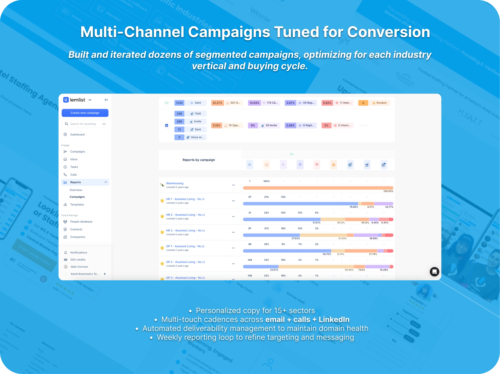 Prepared and connected sending domains/inboxes (Lemwarm + Lemlist)
