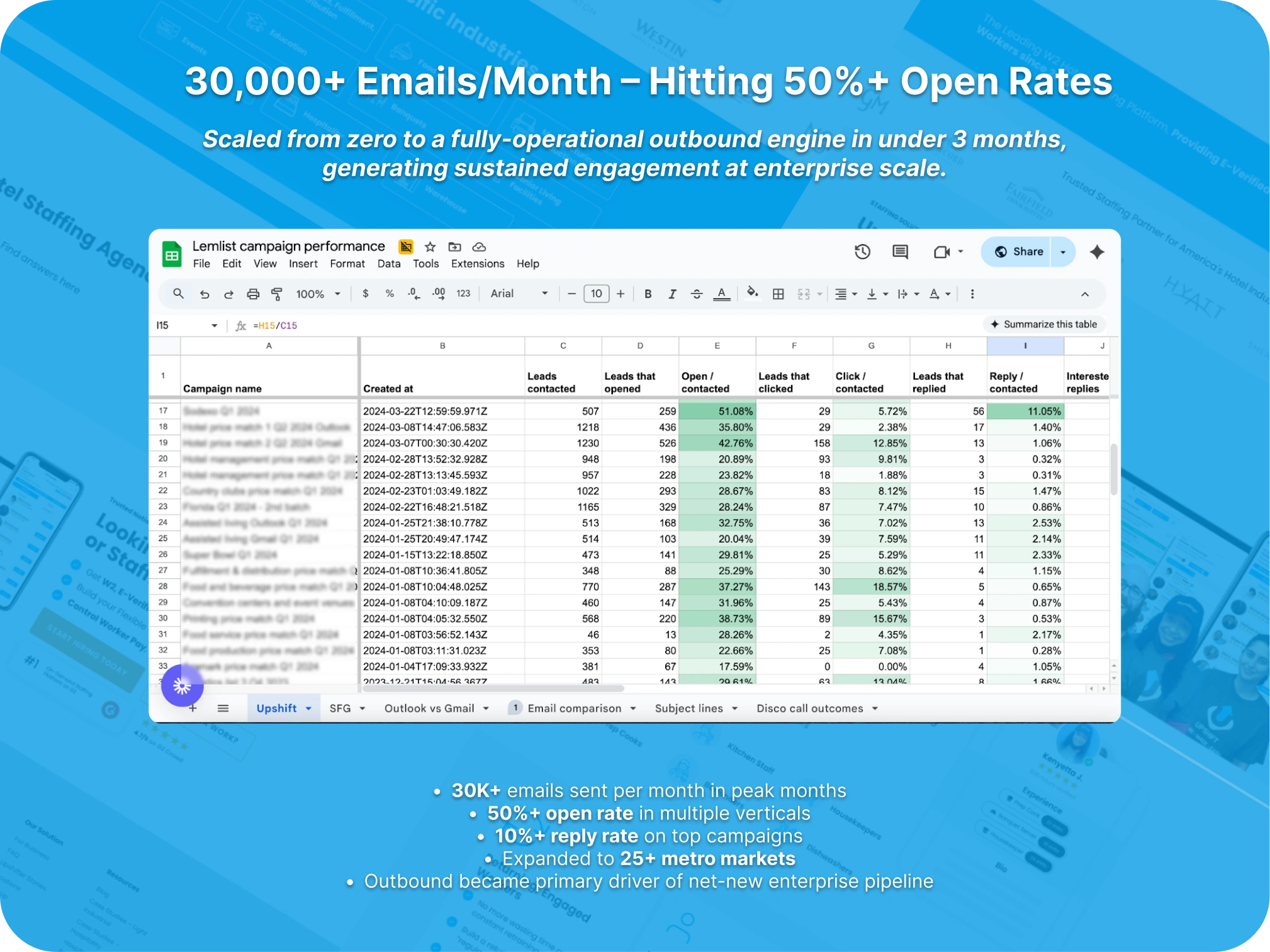 Sustained ~30k sends/month with ~30% opens and ~2% positive replies