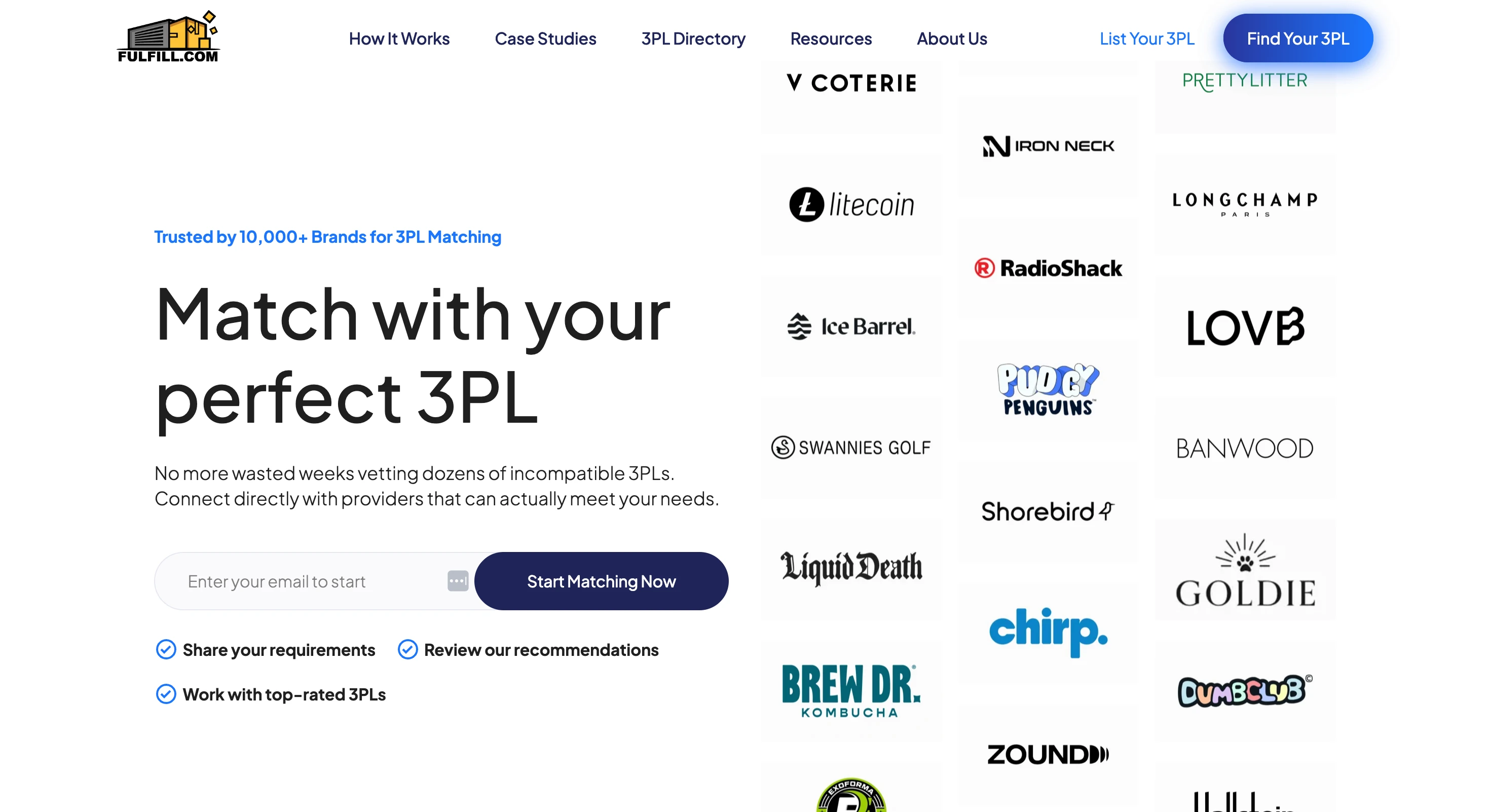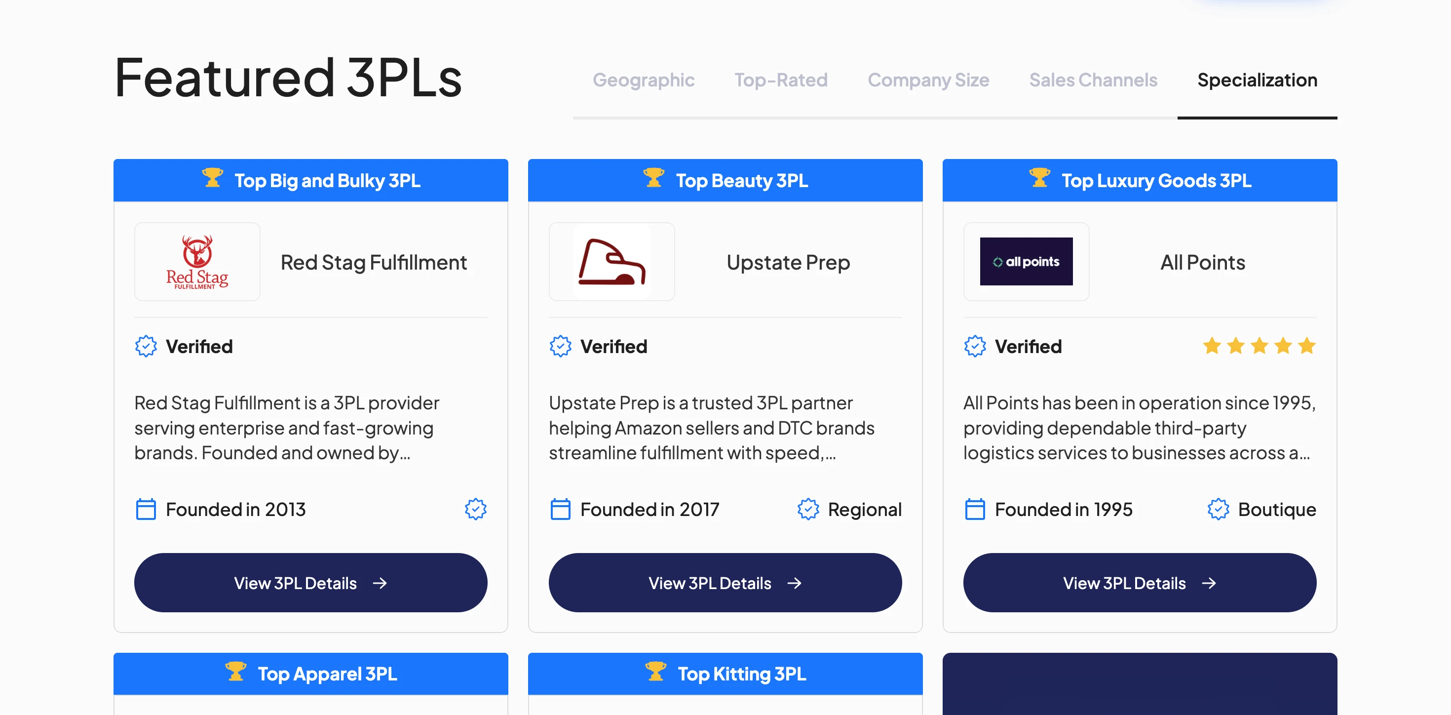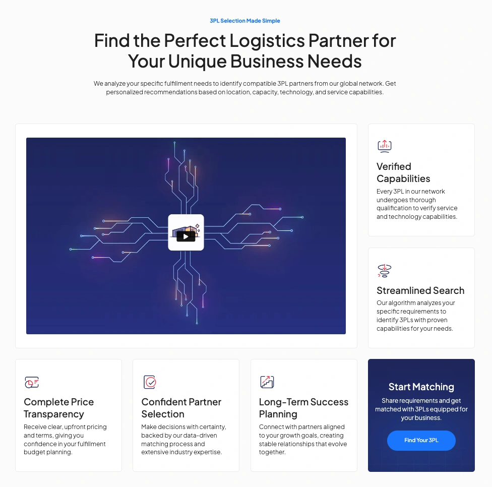 The largest collection. Fields include: company name, slug, logo, description, founding year, size tier (Boutique/Mid-Market/Regional/National/Enterprise/4PL), verification status, star rating, review data, warehouse locations, square footage, team members, platform integrations, carrier partnerships, capabilities, pricing info, customer reviews, news items, and FAQ entries. Powers the directory, profile pages, featured carousel, and all filtered views.