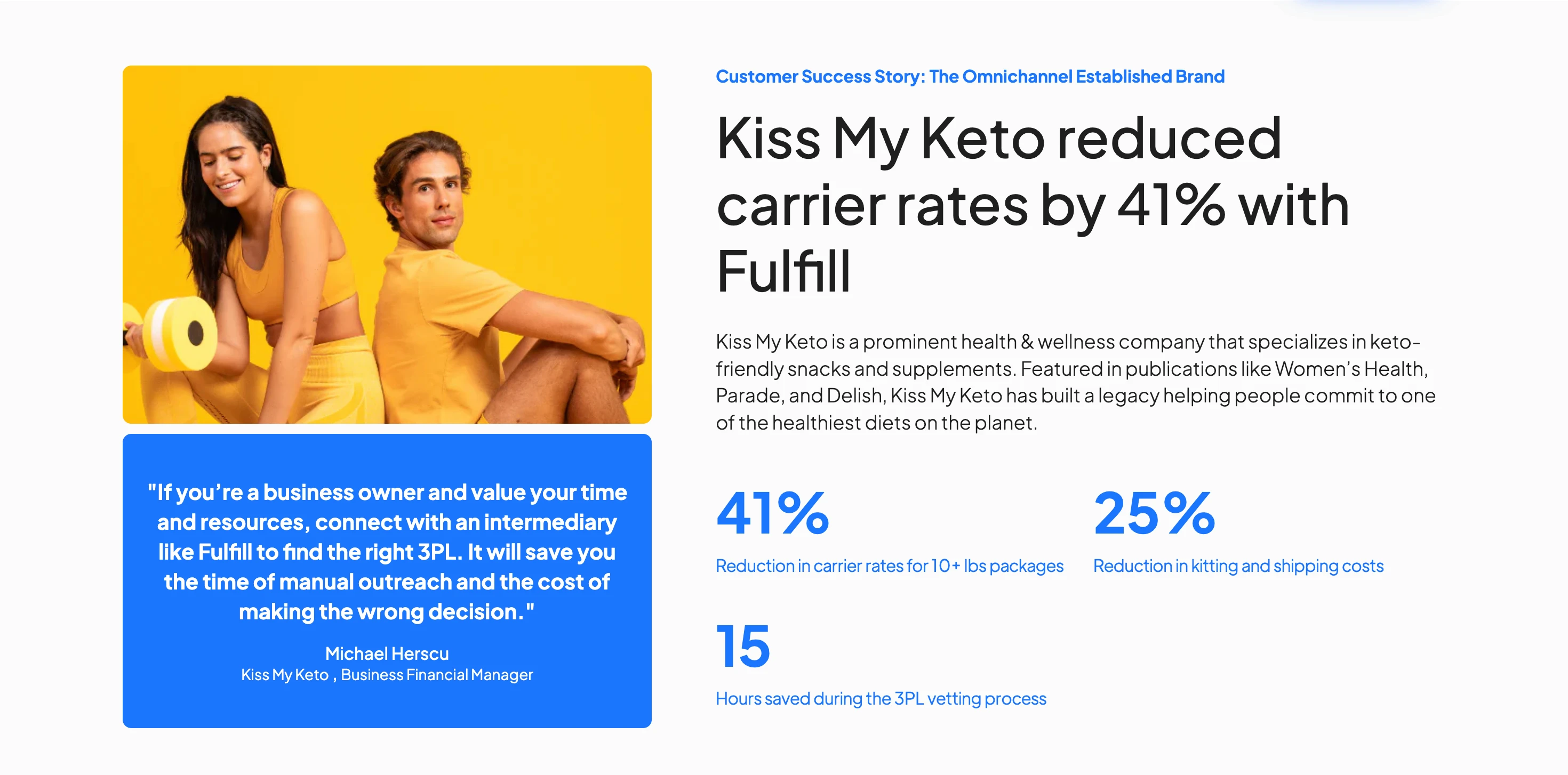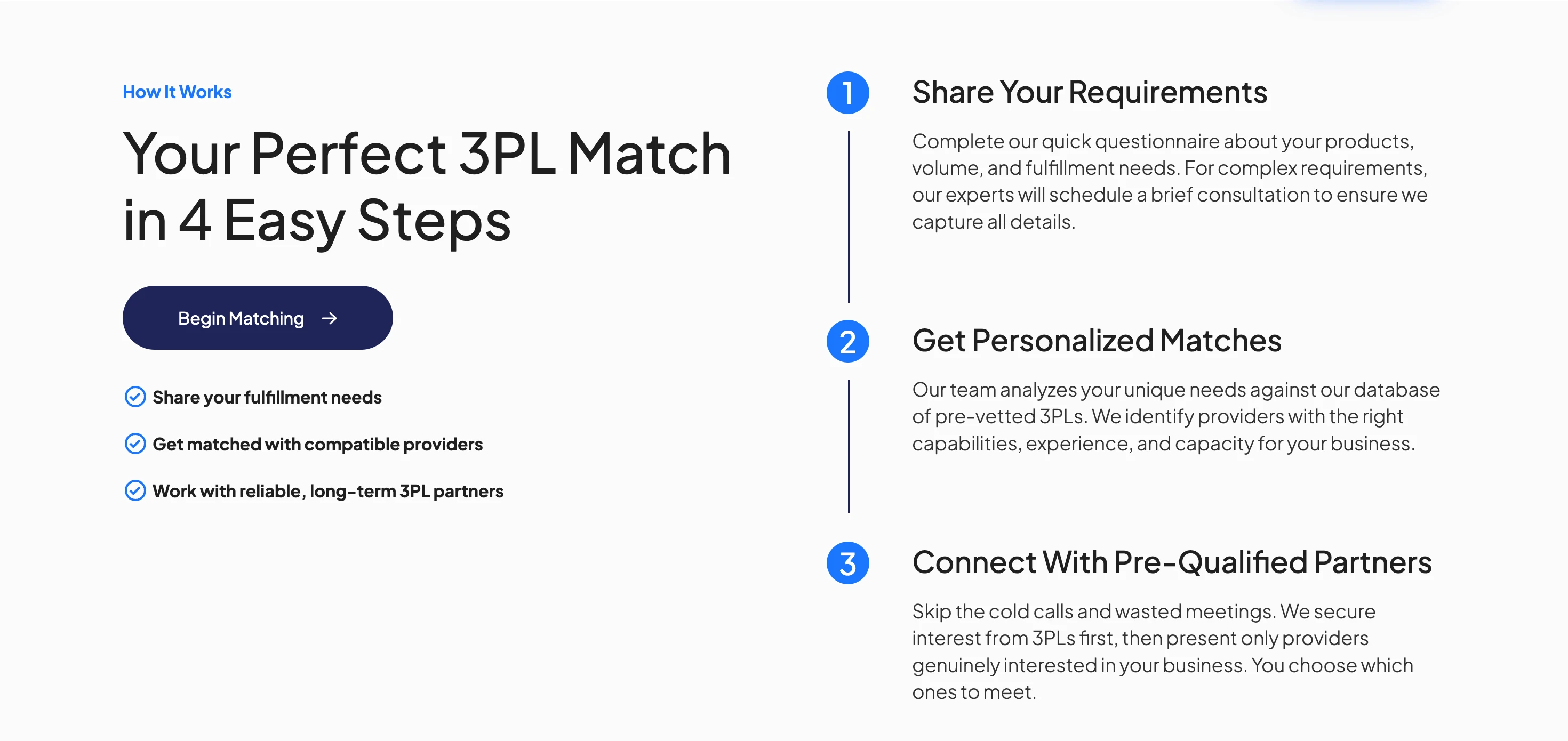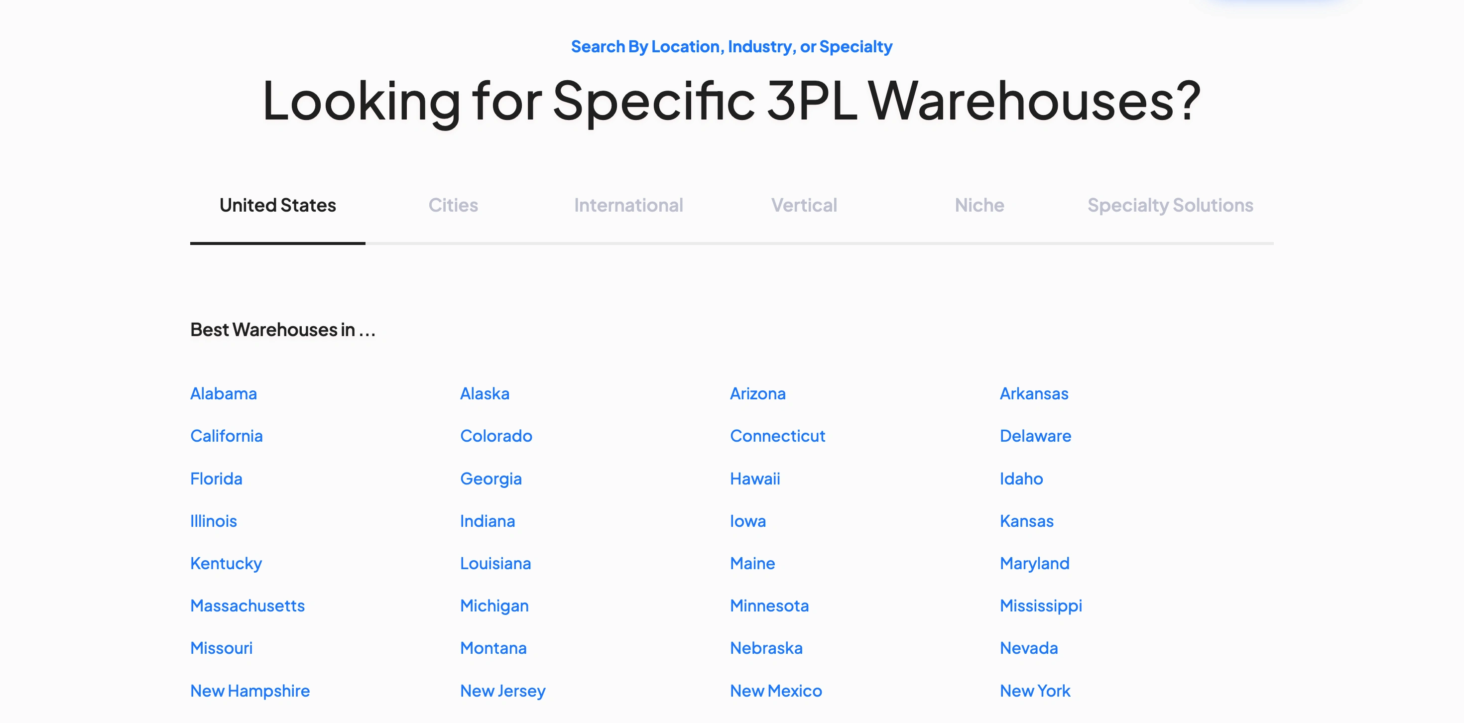The largest collection. Fields include: company name, slug, logo, description, founding year, size tier (Boutique/Mid-Market/Regional/National/Enterprise/4PL), verification status, star rating, review data, warehouse locations, square footage, team members, platform integrations, carrier partnerships, capabilities, pricing info, customer reviews, news items, and FAQ entries. Powers the directory, profile pages, featured carousel, and all filtered views.