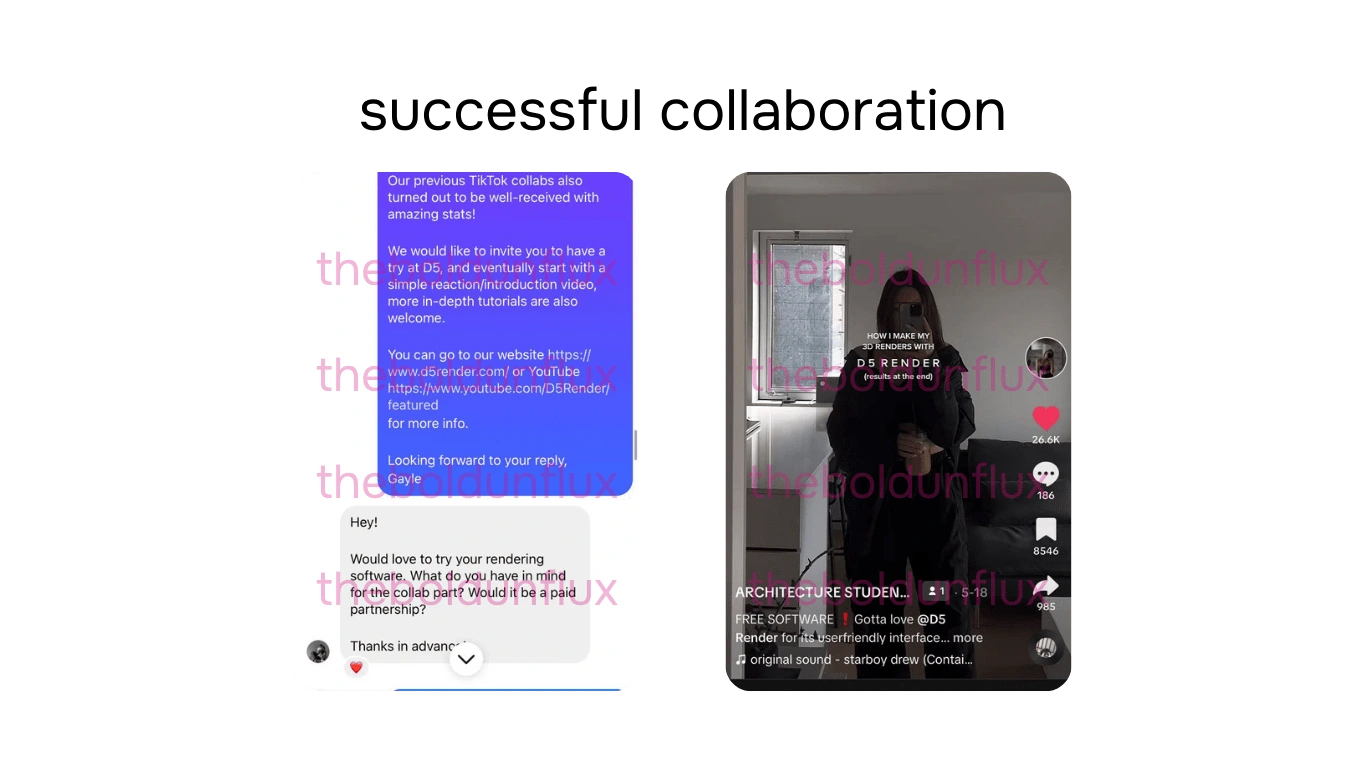 Our organic posting on TikTok went from 20 to 500 followers. And as we ventured into collaborating with KOLs. I'm able to help close a collaboration with the right KOLs with the same target audience as D5 Render.