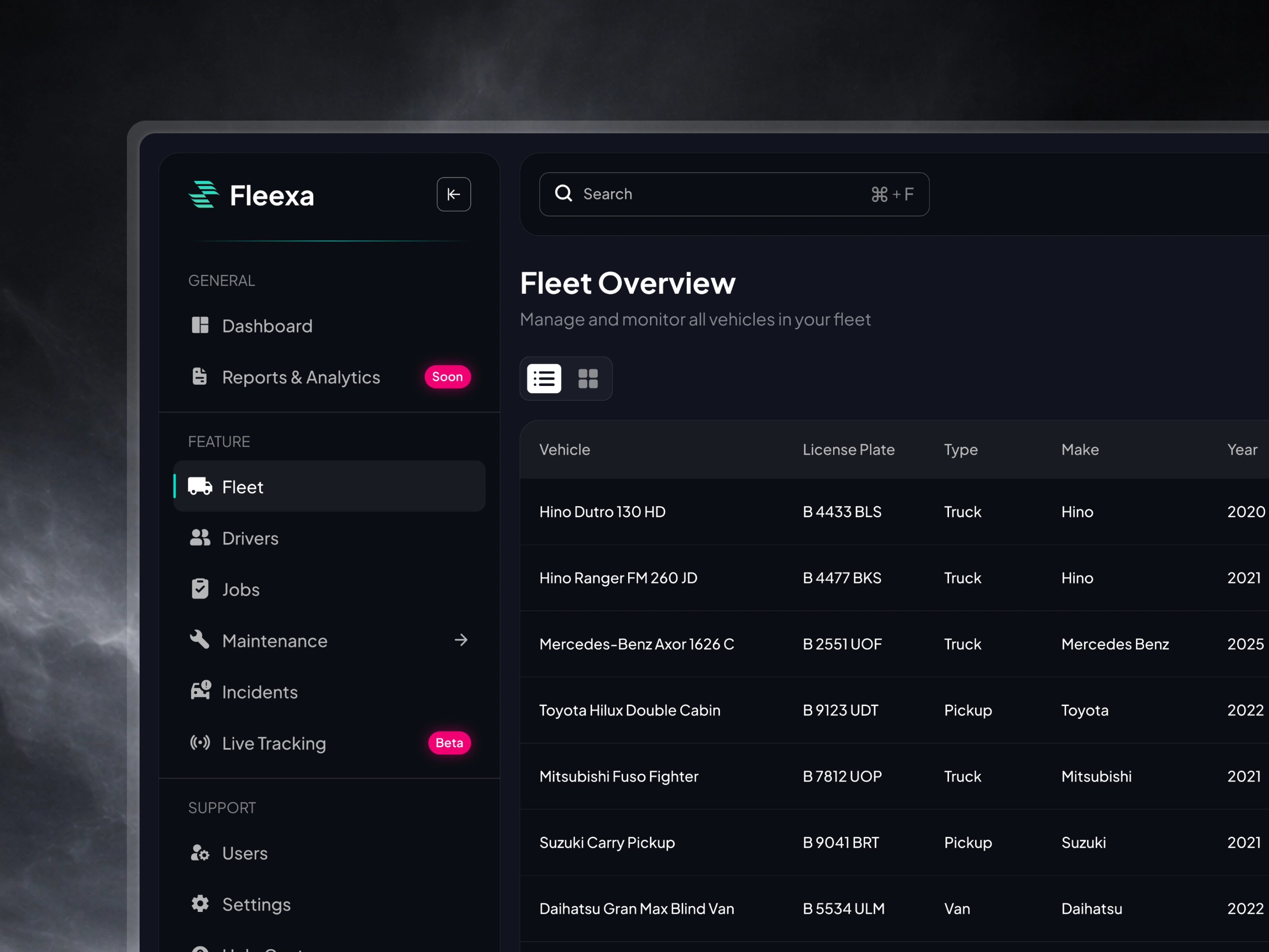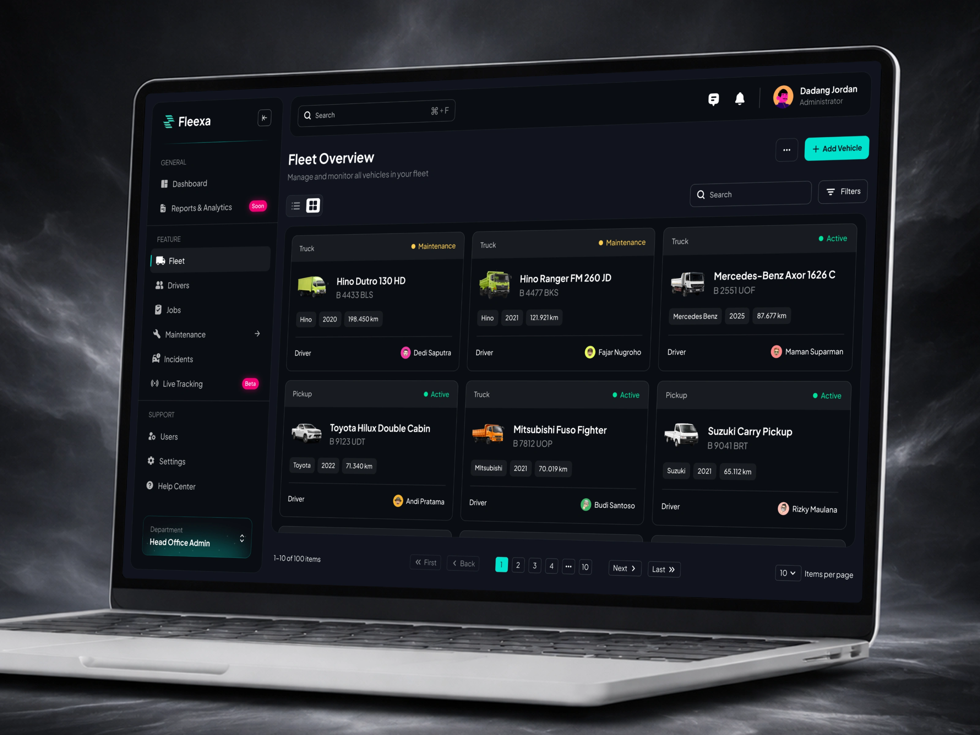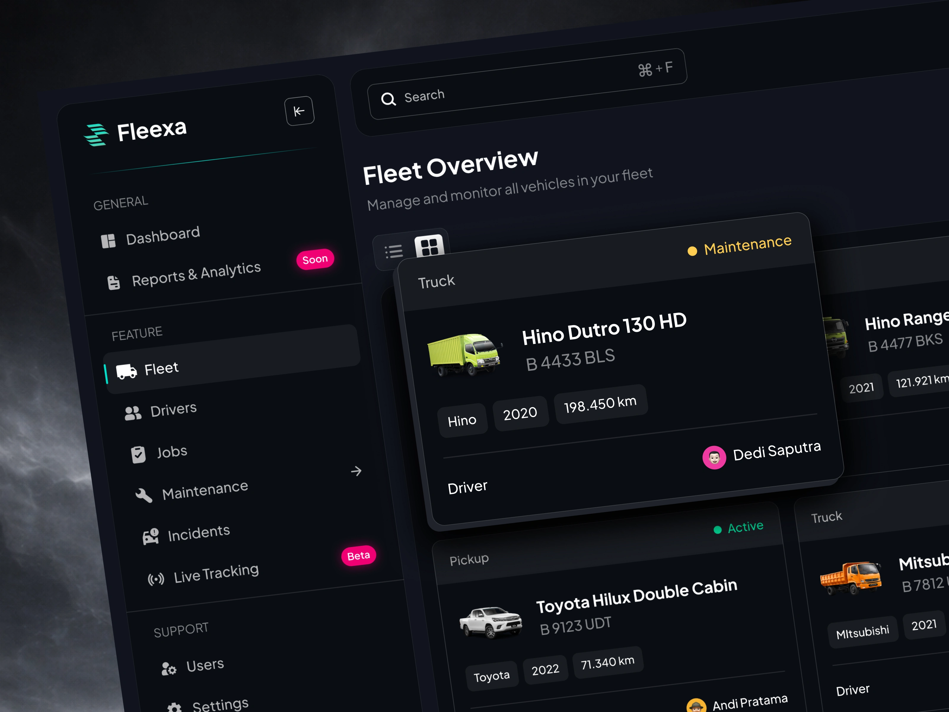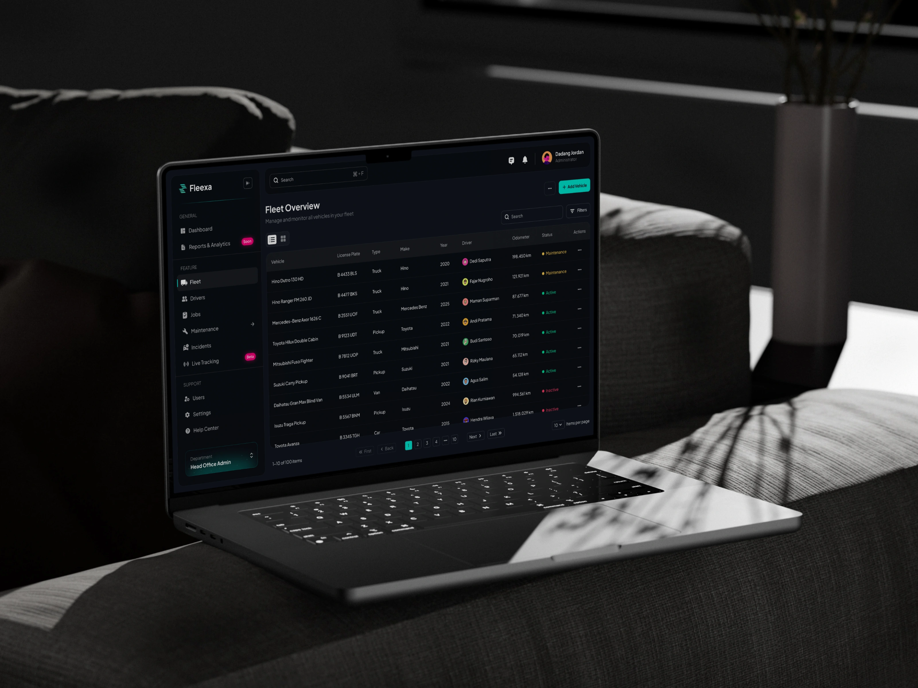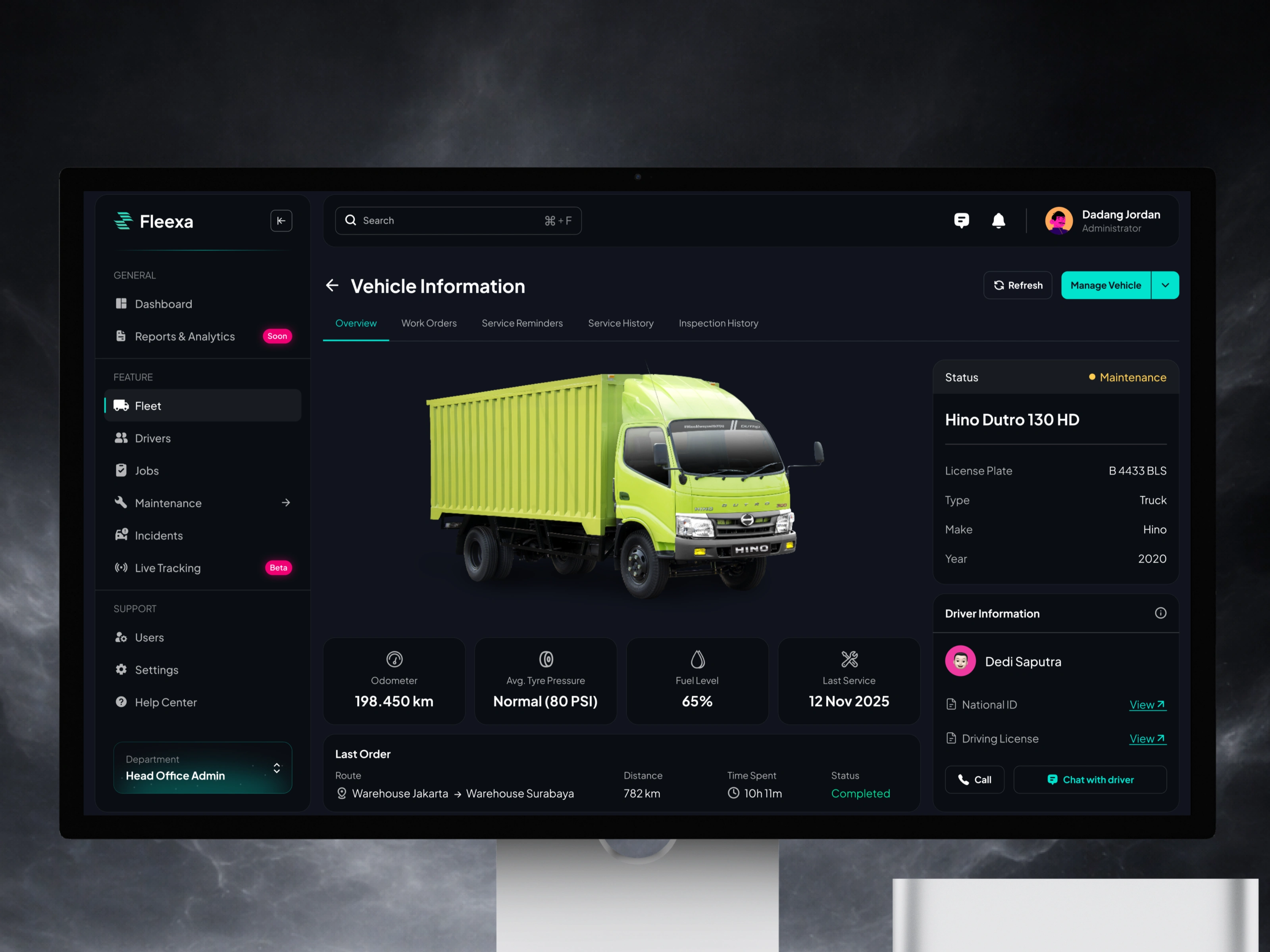 A dedicated page per vehicle with live telemetry (odometer, fuel level, tyre pressure, last service), tabbed history sections (Work Orders, Service Reminders, Service History, Inspection History), and direct driver contact via call or chat.