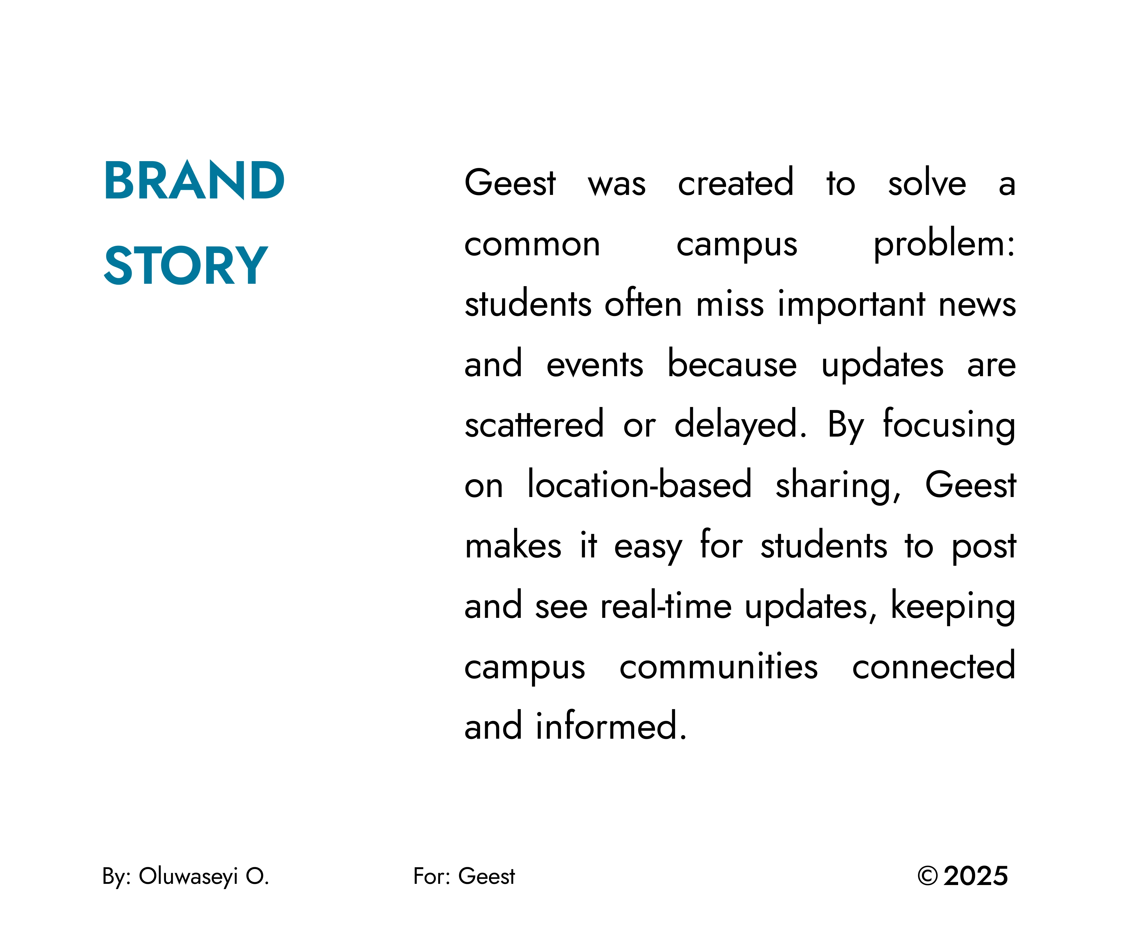 To make campus communication seamless by allowing students to instantly share and access real-time updates within their location. Geest aims to reduce missed information, strengthen campus engagement, and build a connected student community through simple, fast, and reliable news sharing.