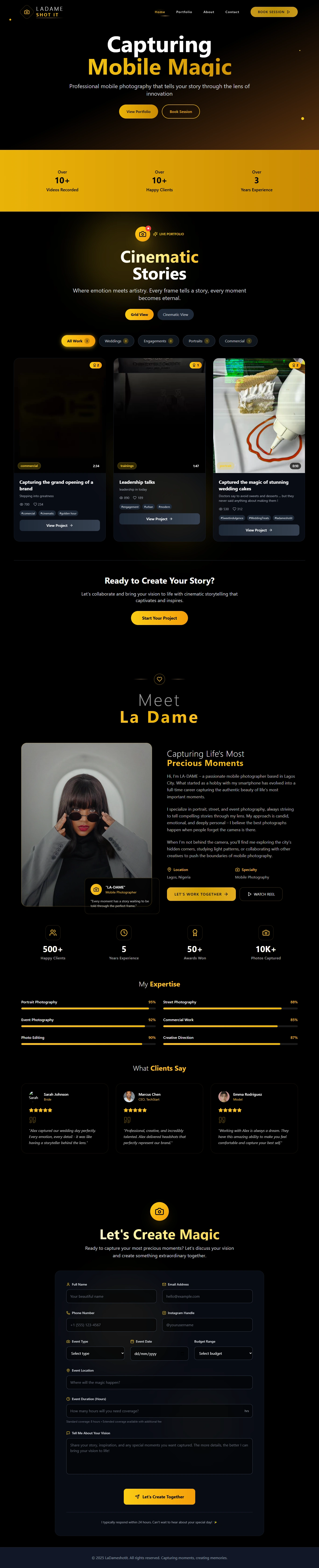 This project was the design and development of a responsive, cinematic-style portfolio website for La Dame Shot It, a mobile photography brand. The site was created to showcase the brand’s creativity, versatility, and premium service offering, while making it easy for clients to explore work, book sessions, and learn more about the photographer.
