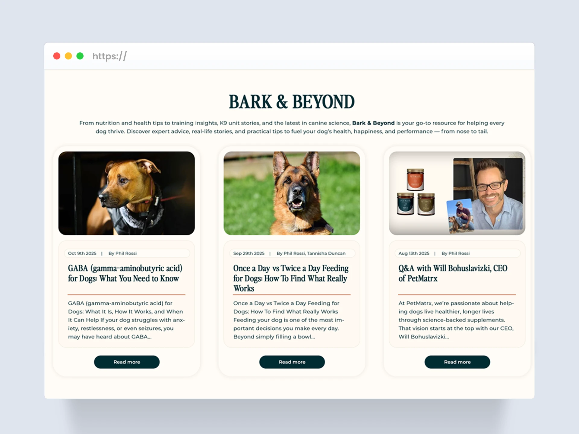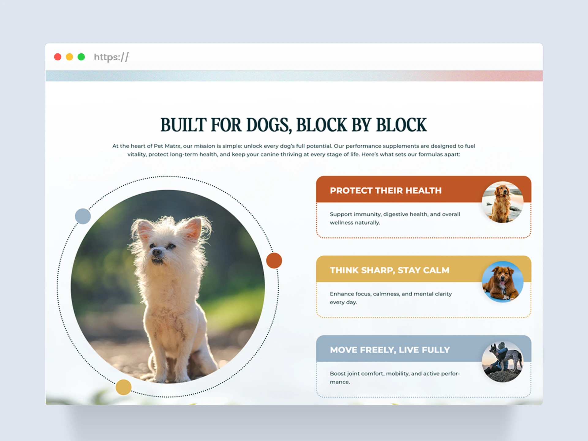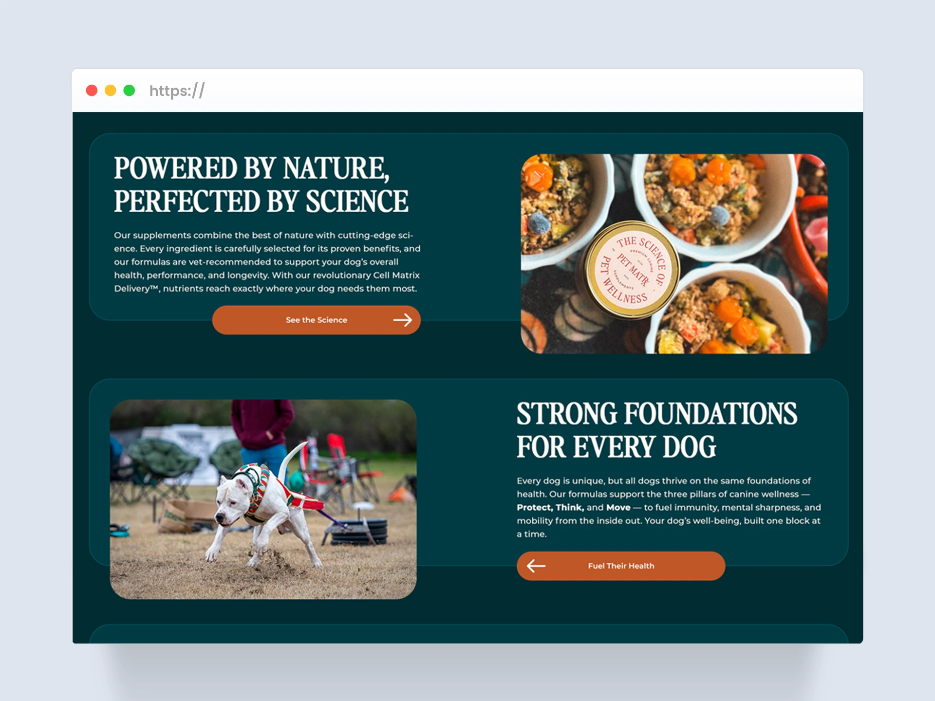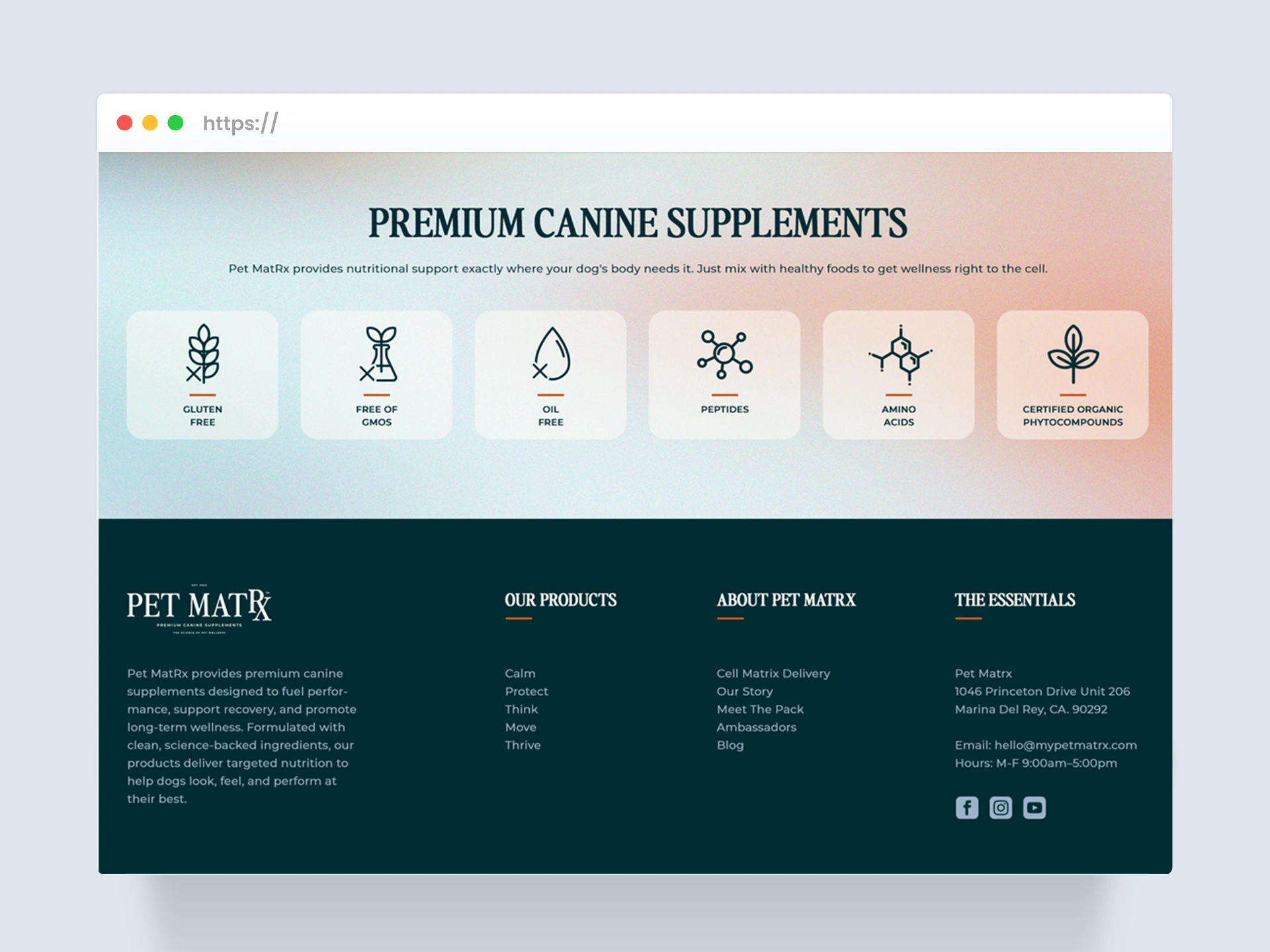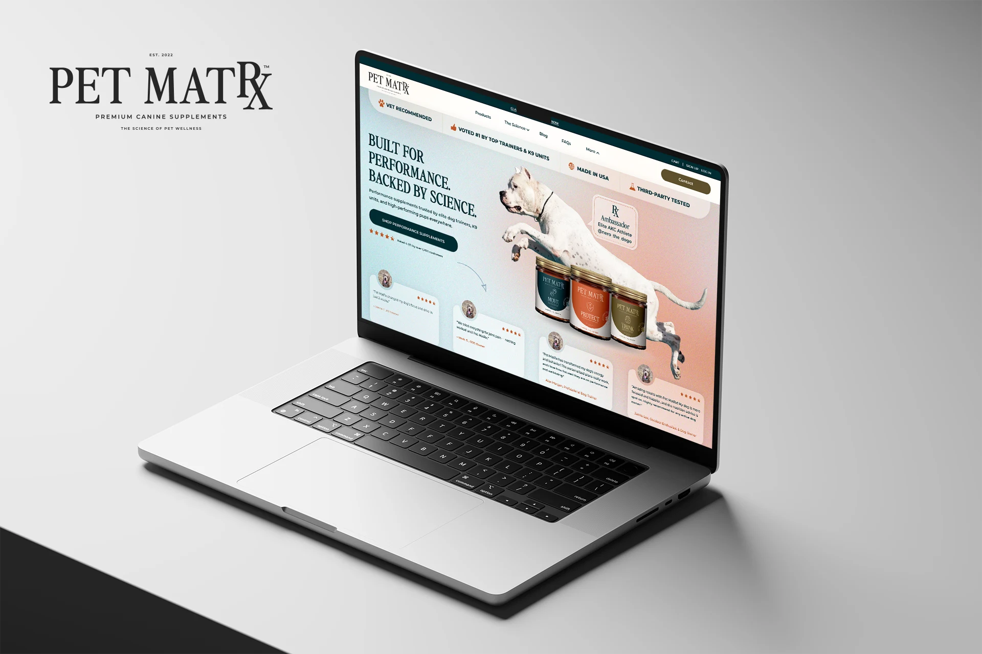 PetMatrx offers science-backed canine supplements targeting wellness, mobility, immunity, and cognitive support. The goal was to create a clean, professional, trust-inspiring digital presence that reflects their brand values nature & science, transparency, and premium quality.