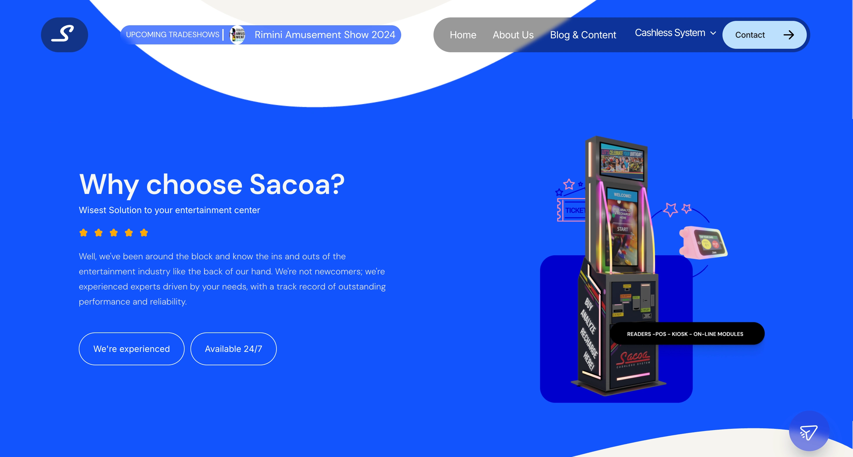 Sacoa develops cashless payment and revenue management systems for arcades, amusement parks, bowling centers, and family entertainment venues worldwide. The website needed to explain a technically layered product offering while speaking to operators who care about efficiency, throughput, and revenue control.