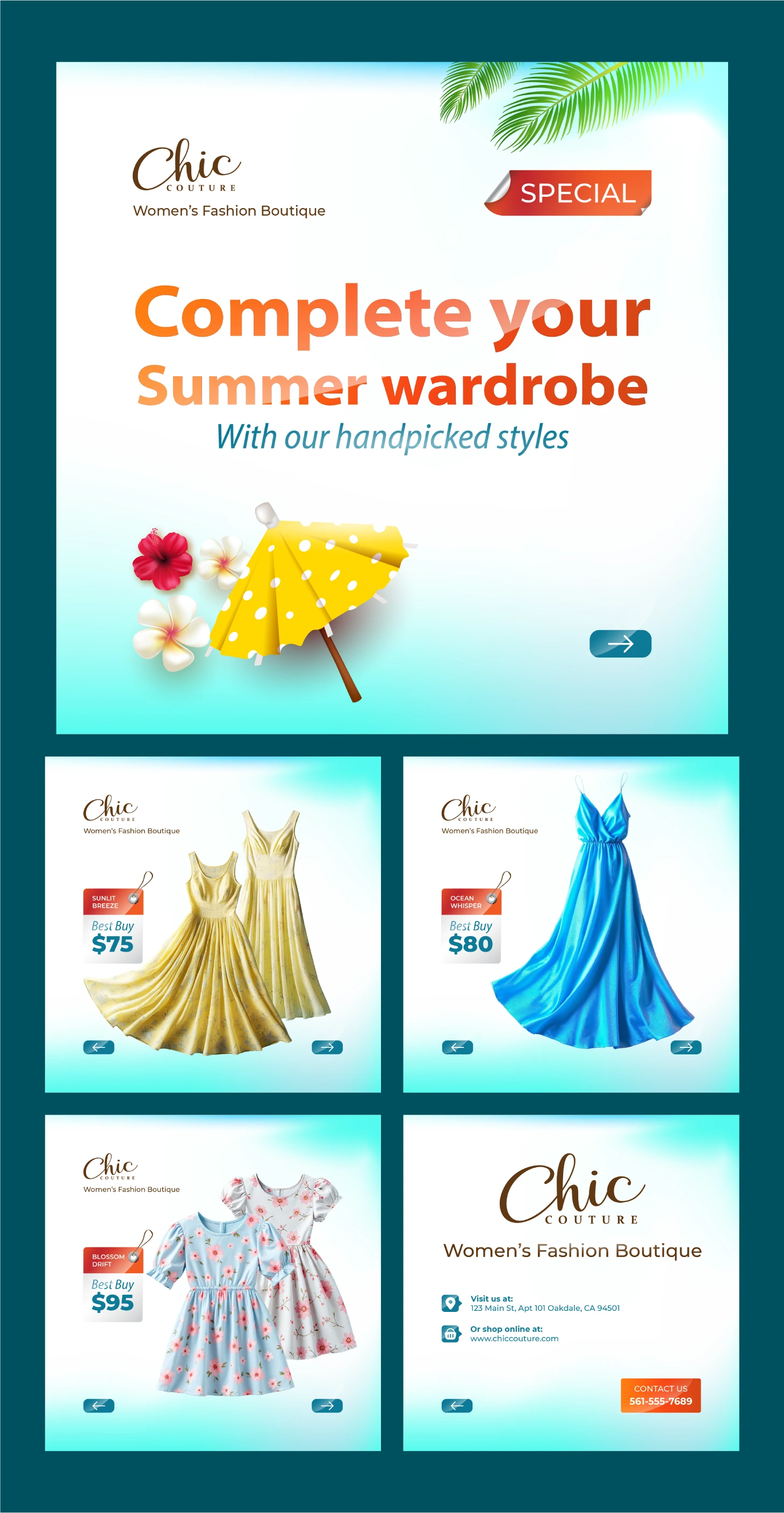 I created a visually appealing social media campaign for Chic Couture, a women’s fashion boutique, to promote their summer collection. The designs targeted trendy women aged 18–35, using a bright and stylish tone that reflected the brand’s vibrant identity.