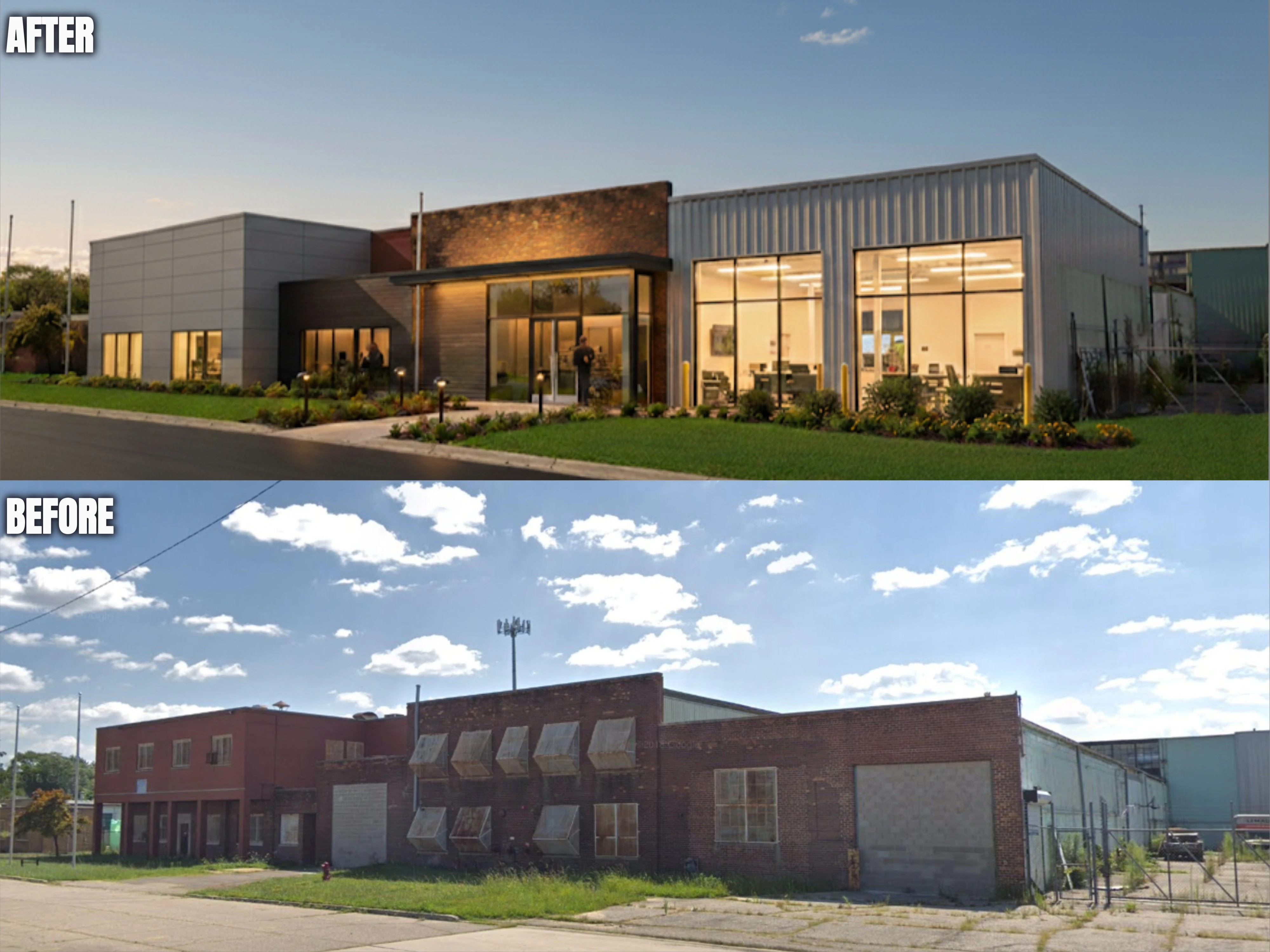 The Vision: The vision was a complete adaptive reuse, transforming the property into a contemporary office hub. The concept replaces the crumbling brick and boarded-up windows with a dynamic new facade, featuring a mix of sleek metal panels, warm brick accents, and expansive glass walls to flood the interior with light. Professional landscaping and lighting were added to create a safe, welcoming, and high-end professional environment.