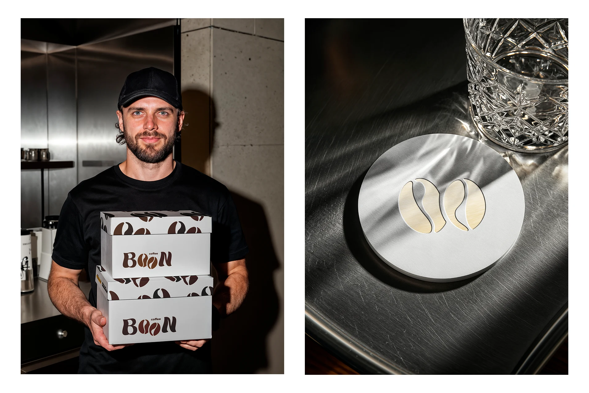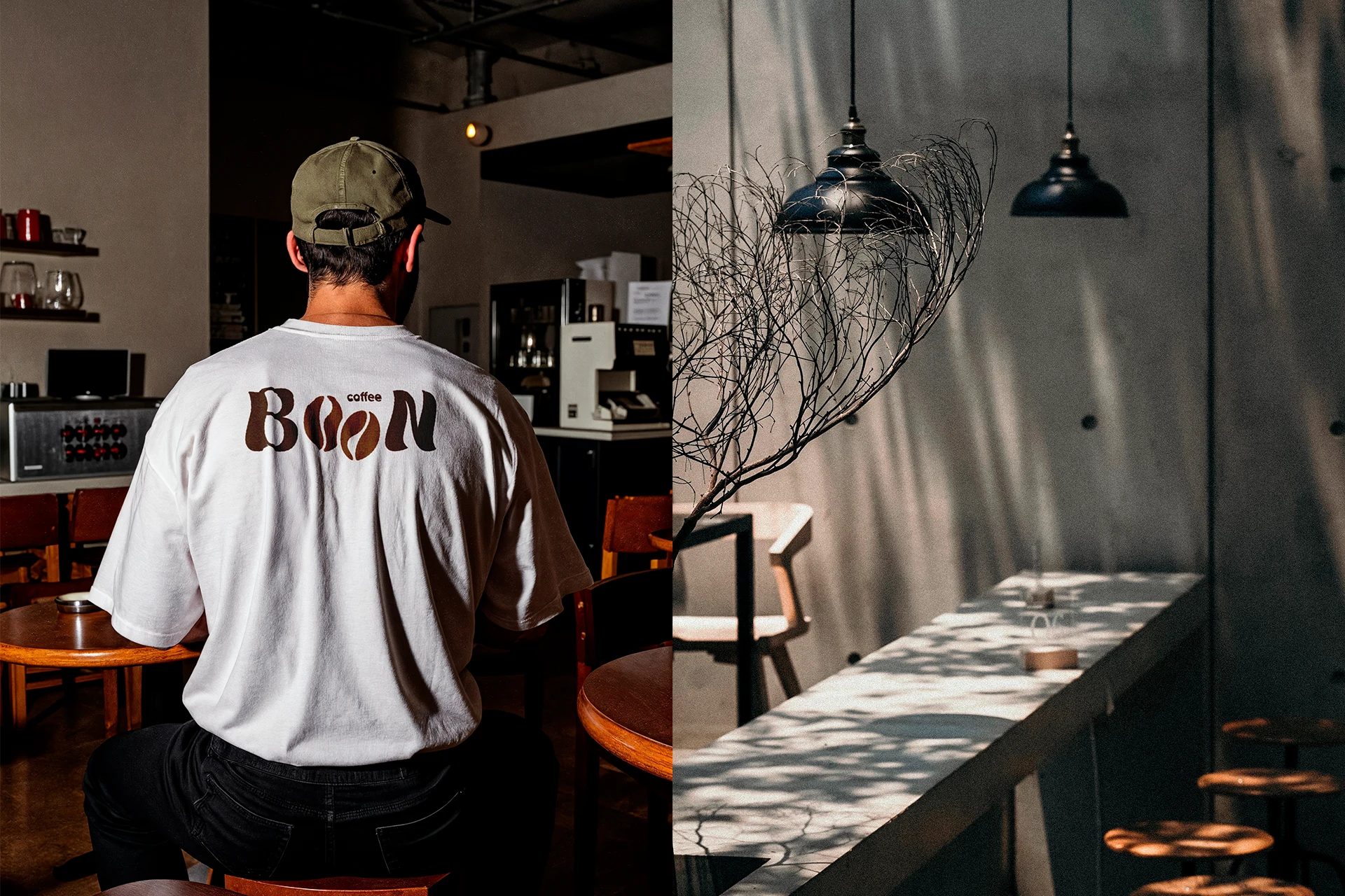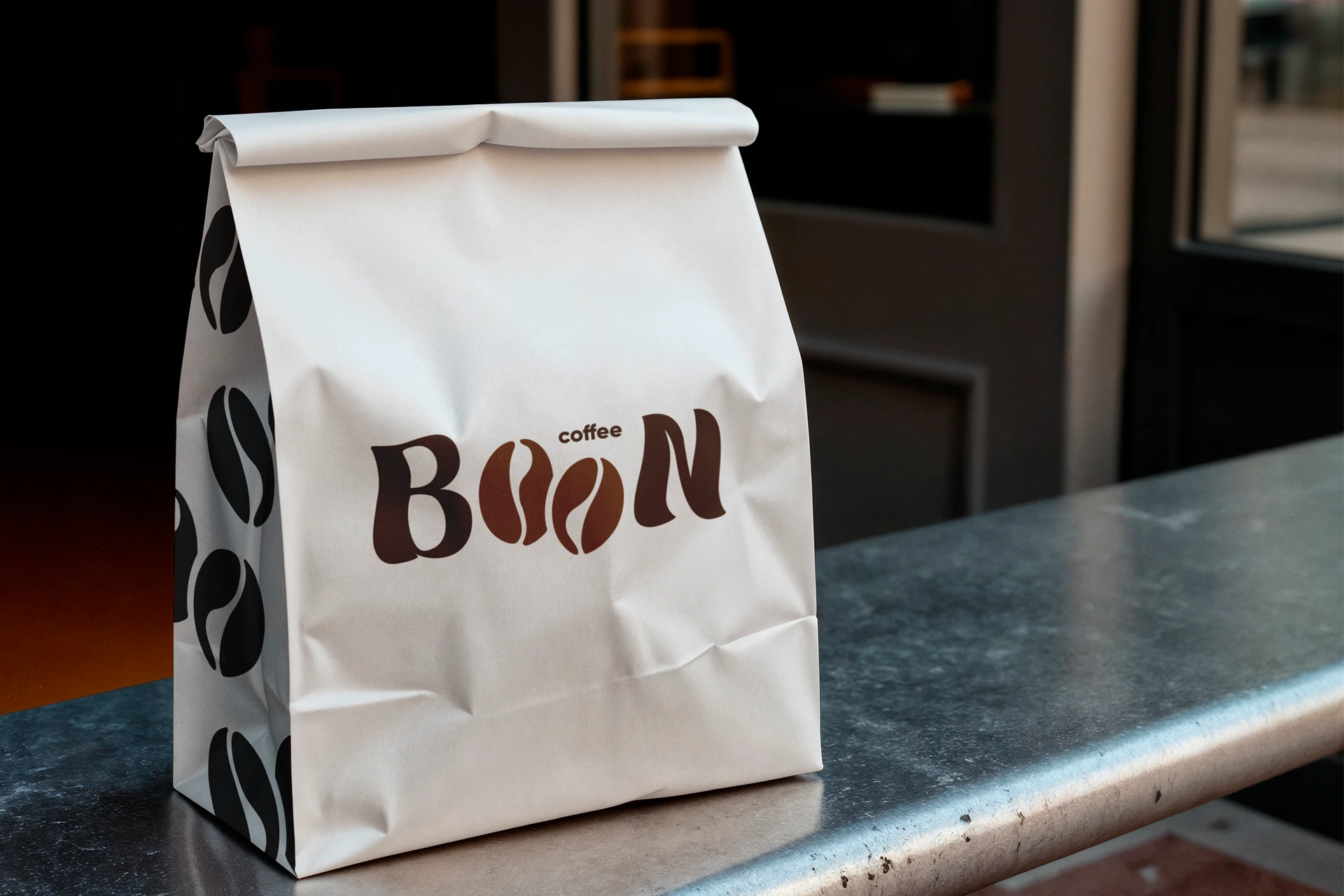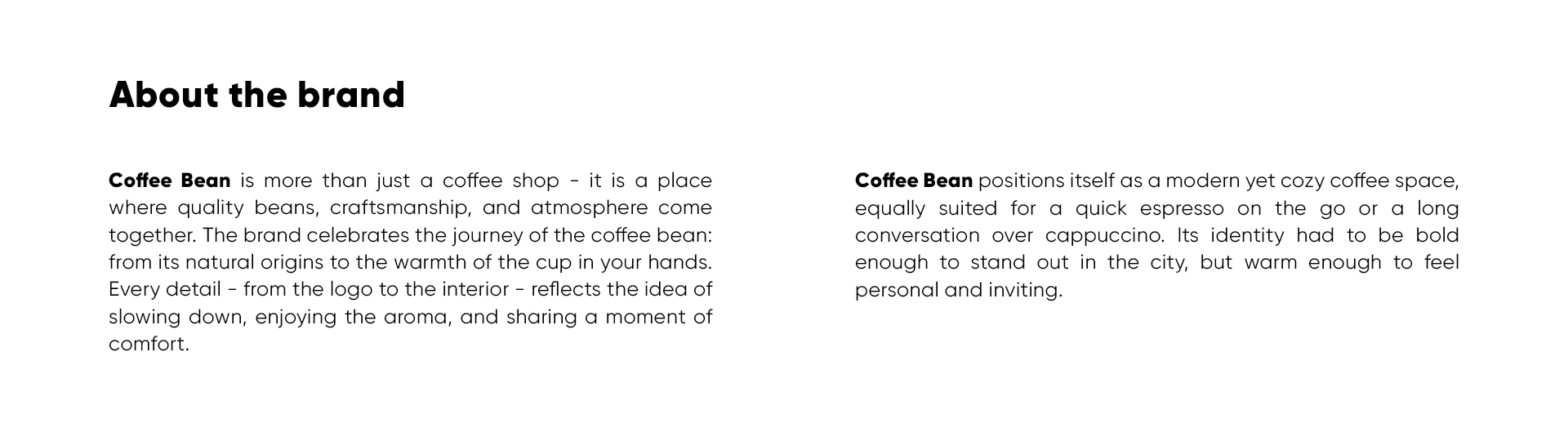 Coffee Bean identity: bean-shaped wordmark, espresso-brown palette, and consistent packaging, signage, and merch for a warm modern cafe.