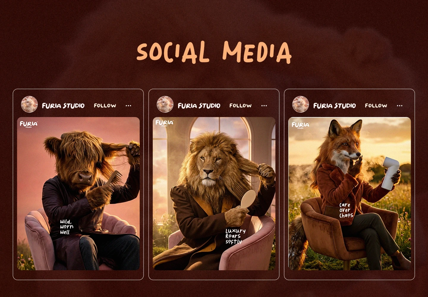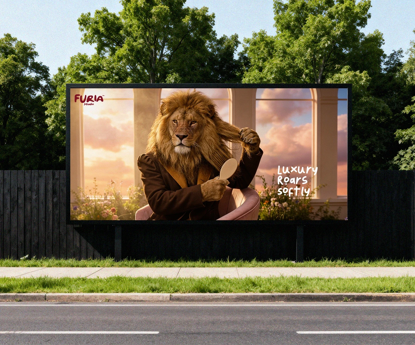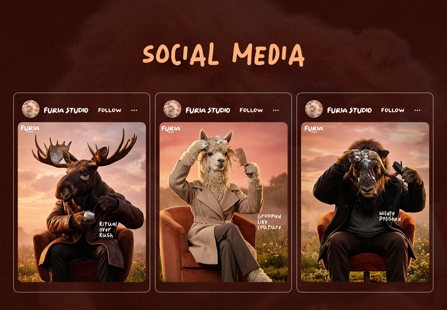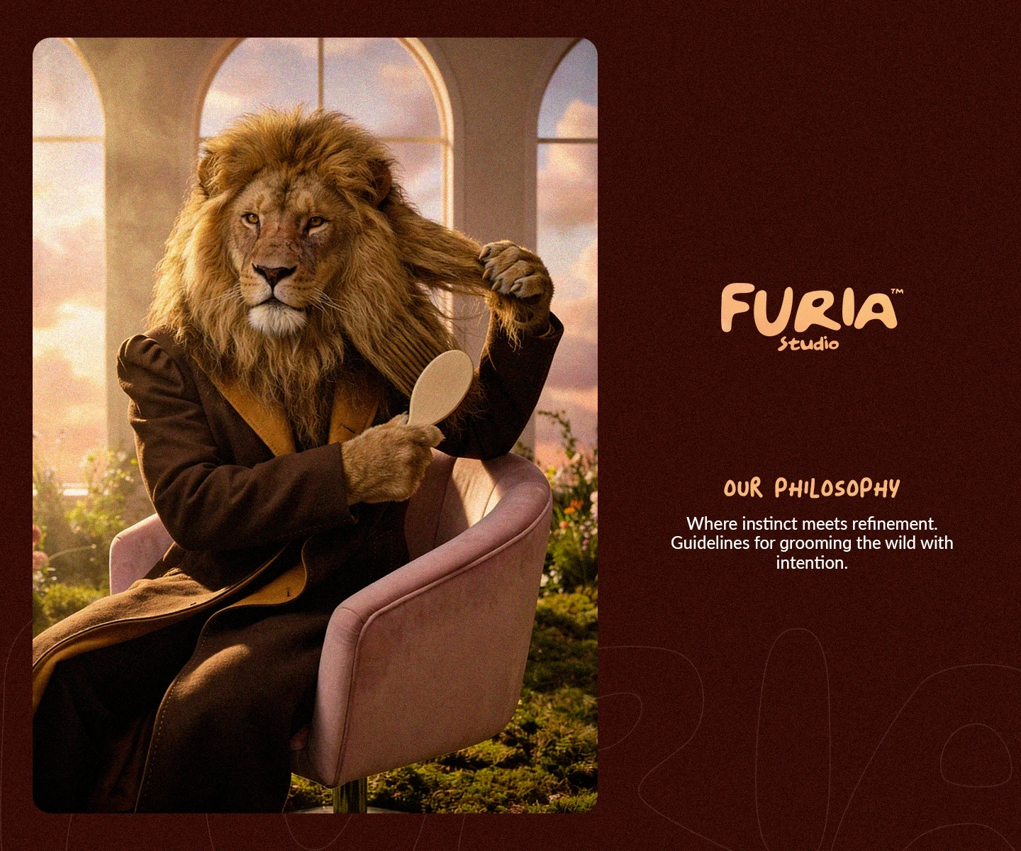 FURIA Studio is a conceptual grooming brand built on the idea of refining the wild without erasing its character. This campaign explores grooming as a ritual rather than a routine, where instinct meets intention and individuality is polished, not suppressed. The visual system uses anthropomorphic animal portraits styled in couture-inspired wardrobe, warm cinematic lighting, and textured natural environments. Each character represents a distinct grooming philosophy from quiet confidence to untamed elegance translated into scroll-stopping social media content and large-format campaign executions. The project includes: Social media campaign creatives Brand visual language and color system Editorial portrait direction Outdoor billboard mockups Digital brand storytelling assets The design approach focuses on emotional storytelling, strong visual recall, and premium brand positioning. Every frame is crafted to feel tactile, intentional, and timeless positioning FURIA Studio as a bold