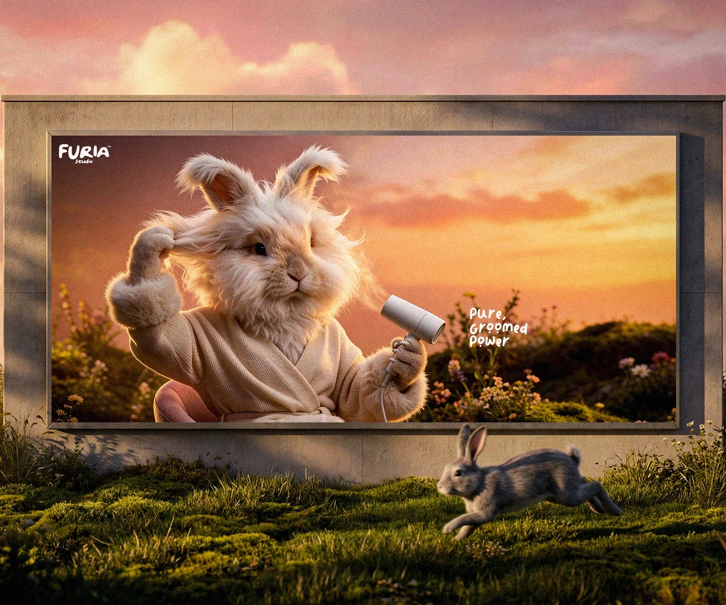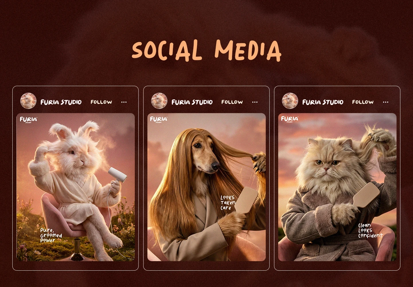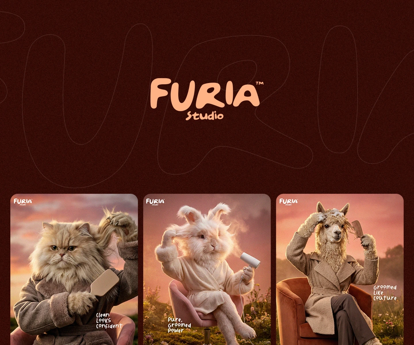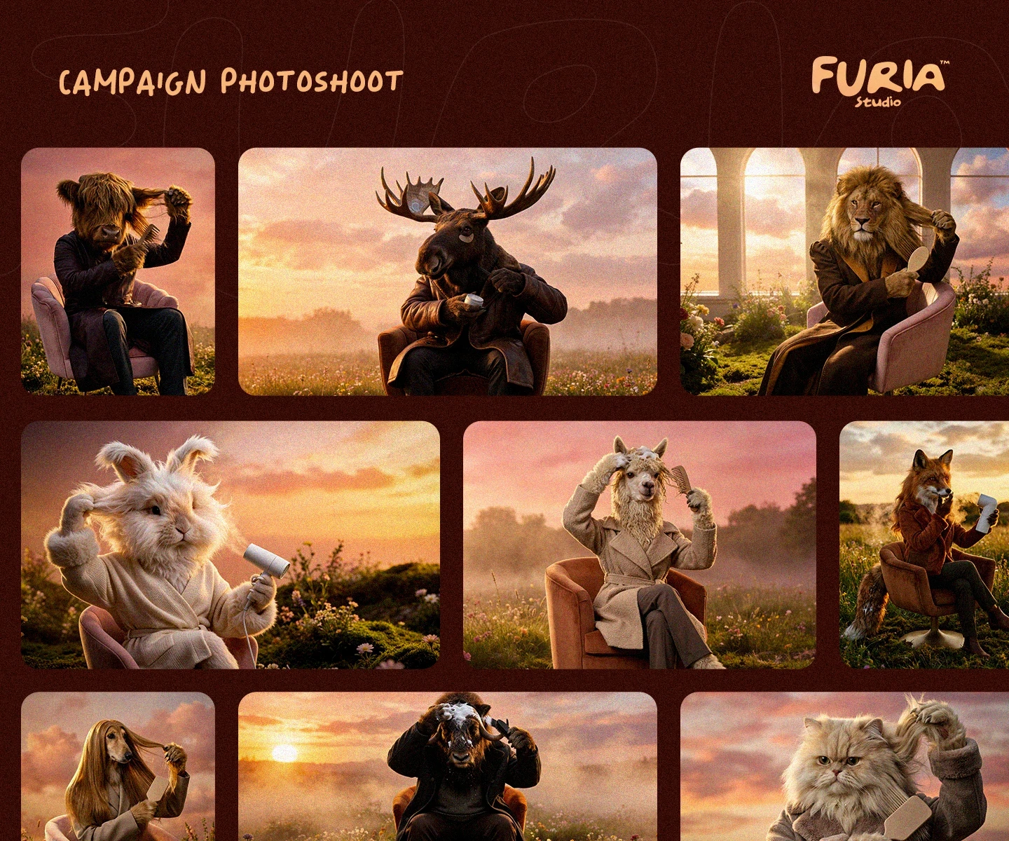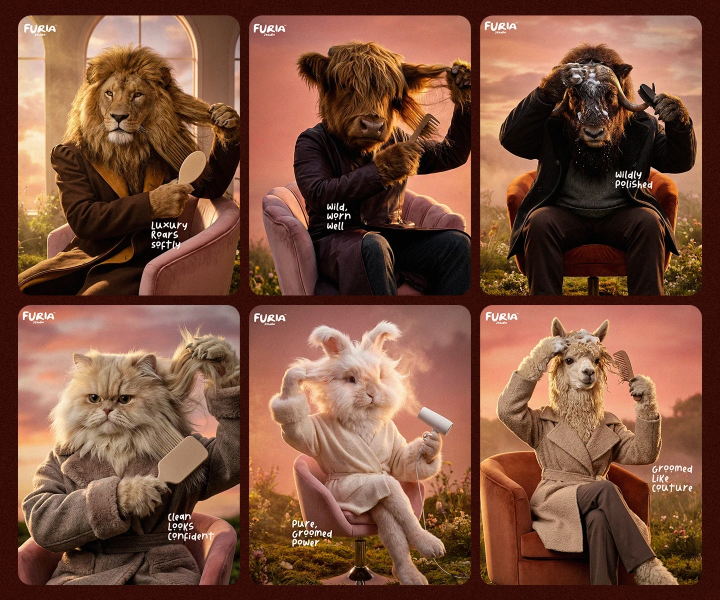 FURIA Studio is a conceptual grooming brand built on the idea of refining the wild without erasing its character. This campaign explores grooming as a ritual rather than a routine, where instinct meets intention and individuality is polished, not suppressed. The visual system uses anthropomorphic animal portraits styled in couture-inspired wardrobe, warm cinematic lighting, and textured natural environments. Each character represents a distinct grooming philosophy from quiet confidence to untamed elegance translated into scroll-stopping social media content and large-format campaign executions. The project includes: Social media campaign creatives Brand visual language and color system Editorial portrait direction Outdoor billboard mockups Digital brand storytelling assets The design approach focuses on emotional storytelling, strong visual recall, and premium brand positioning. Every frame is crafted to feel tactile, intentional, and timeless positioning FURIA Studio as a bold