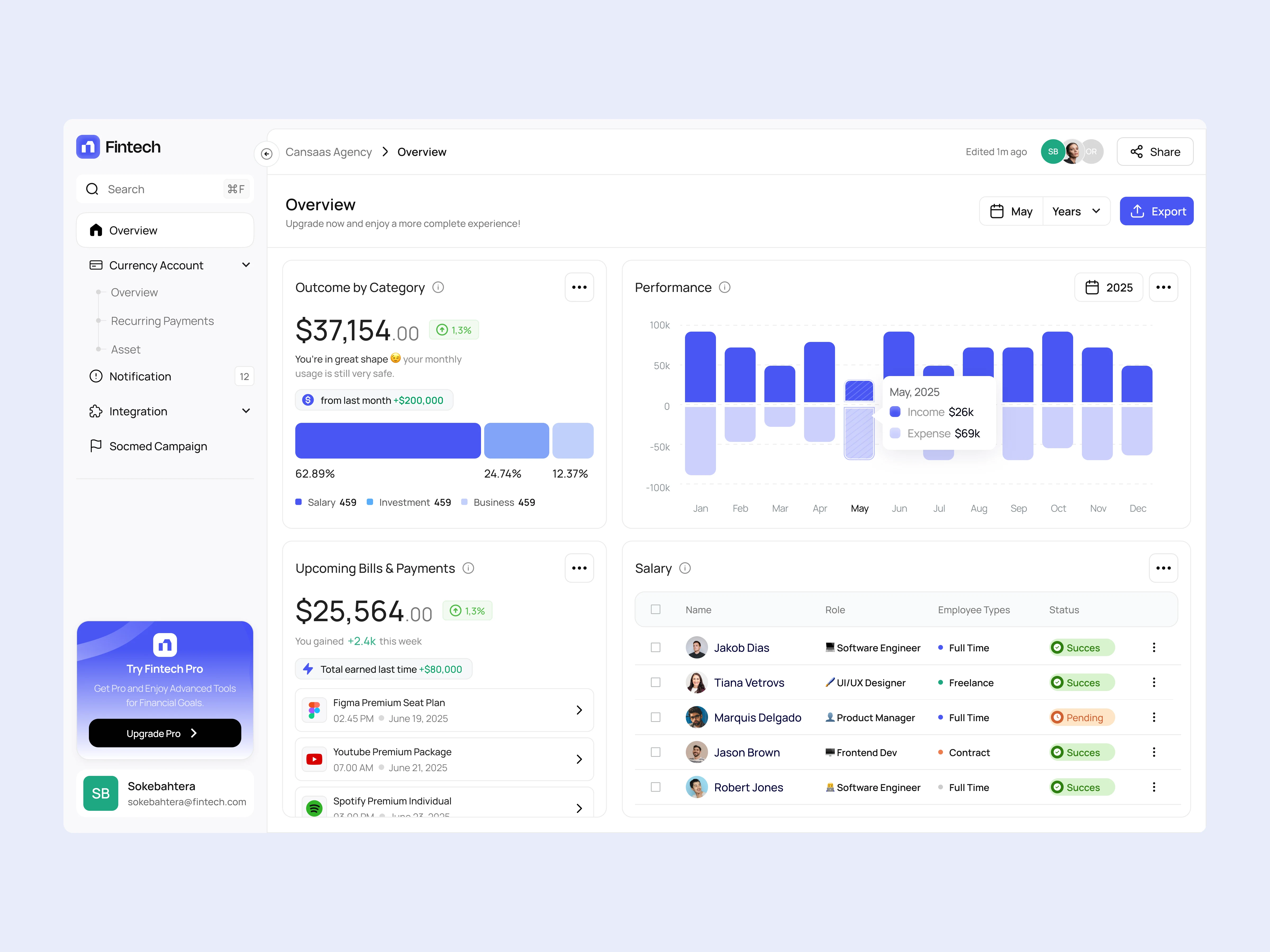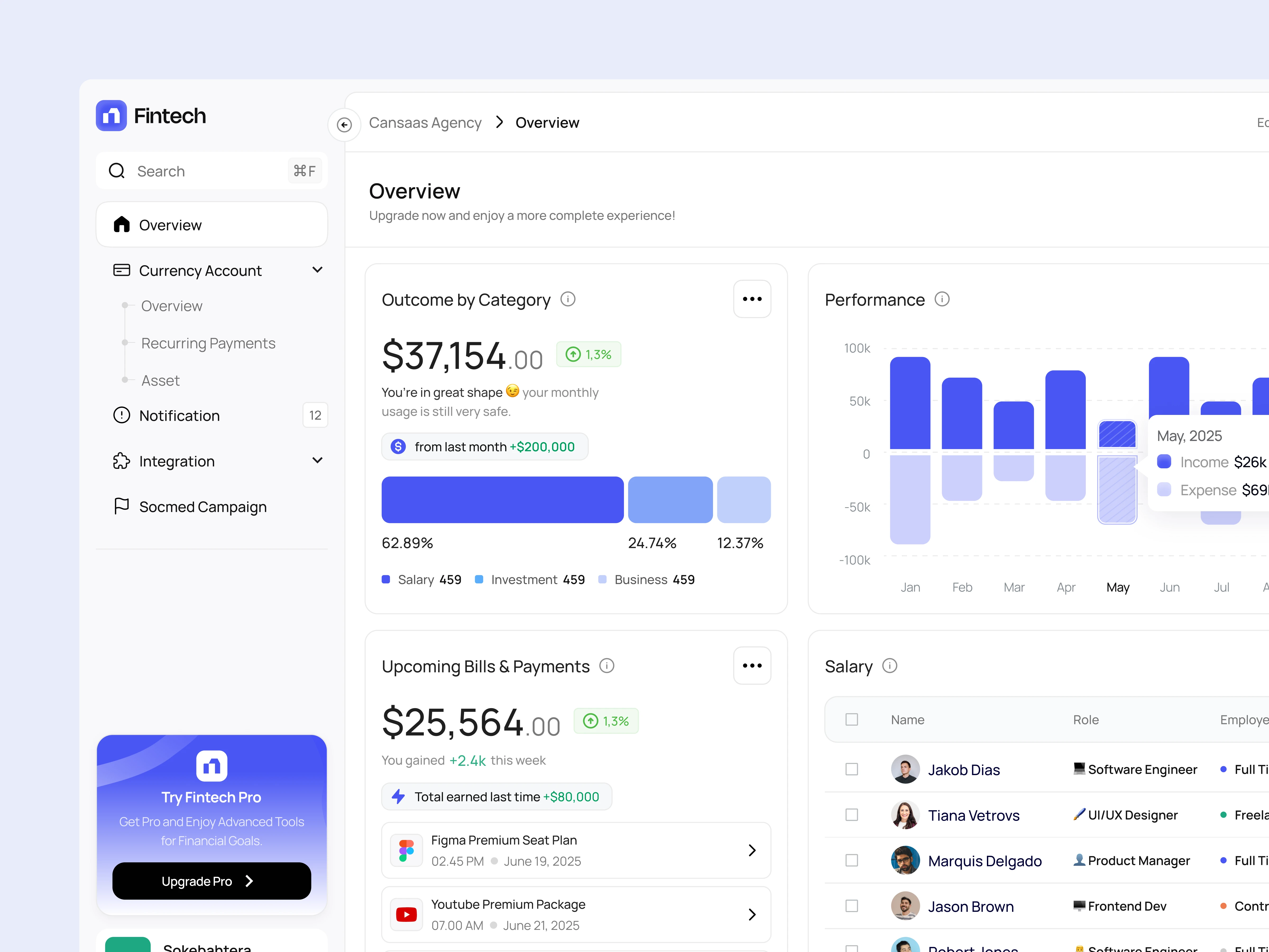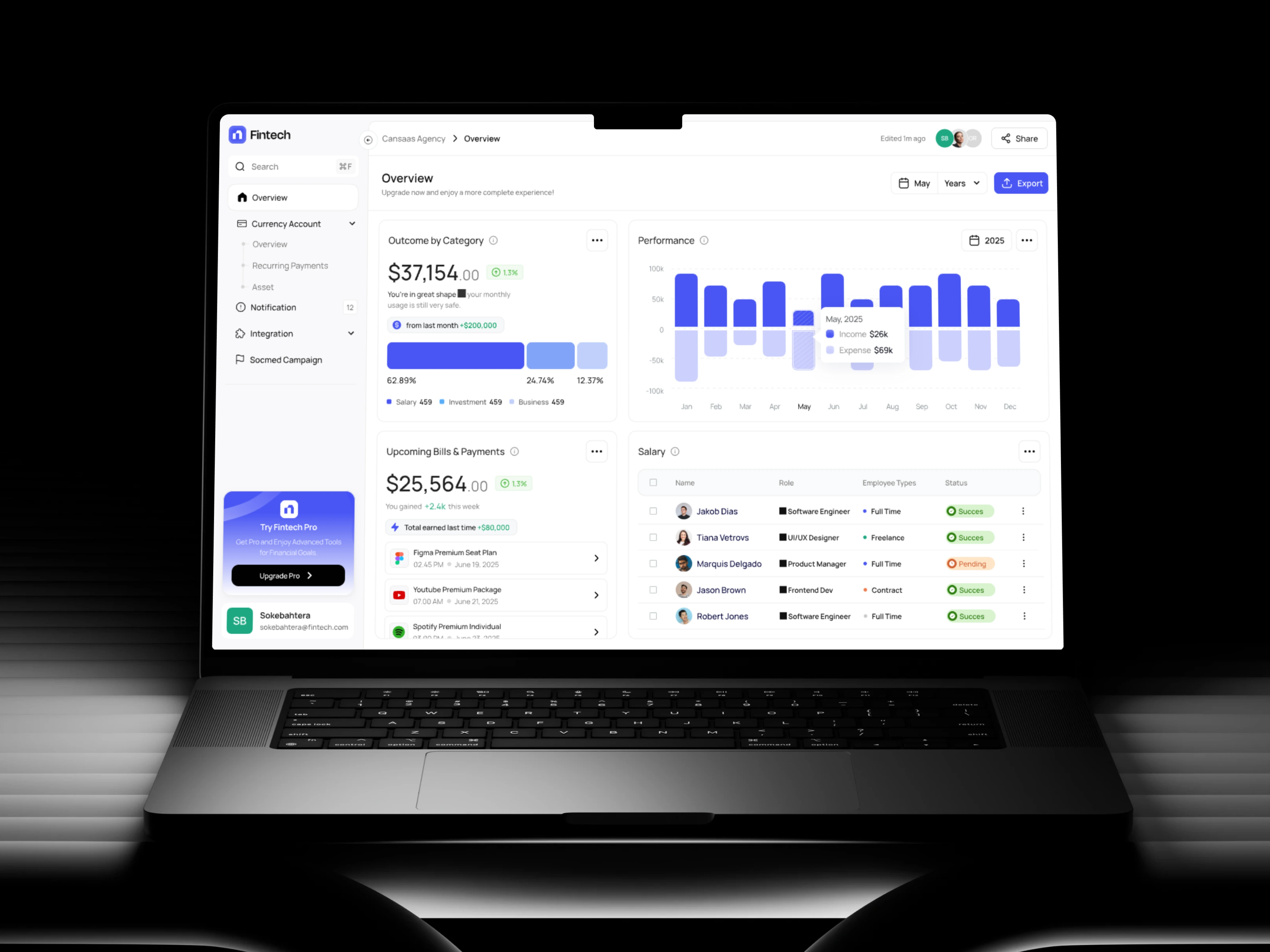 This Fintech Dashboard UI/UX Case Study focuses on creating the Cansaas Agency Overview, a sophisticated Financial Management Platform designed to provide real-time, comprehensive insights into an agency’s monetary health. Our goal was to simplify complex Financial Data Visualization, making critical performance indicators (KPIs) immediately accessible. The resulting SaaS Dashboard Design offers a harmonious balance of high-level performance metrics, detailed transaction schedules, and crucial personnel expense tracking, establishing a new benchmark for Fintech User Experience.