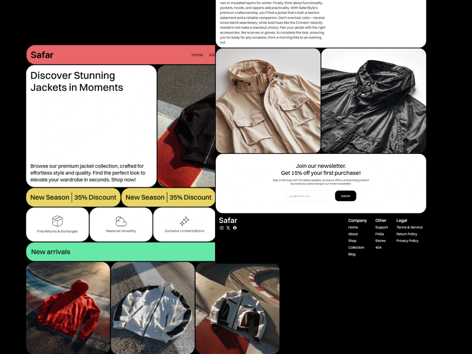 A premium Framer eCommerce template for fashion & outerwear brands. Powered by Framer Commerce with Shopify integration, with dynamic product pages, intuitive filters, custom options, and refined UX for high conversions. Ideal for sustainable, standout designs.