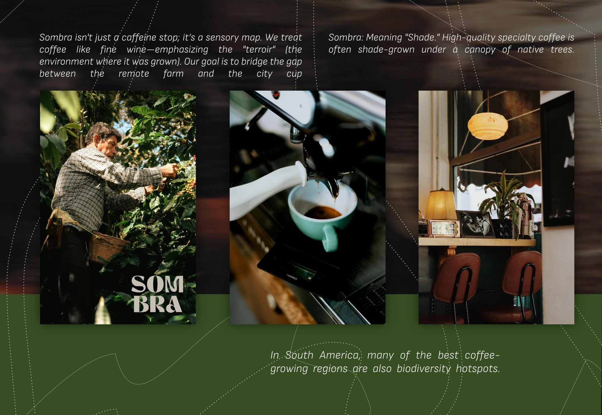 This is a branding project for a coffee shop and artisanal roastery. I wanted to use the idea of pathways and some elements from the relief where the coffee beans grow.
