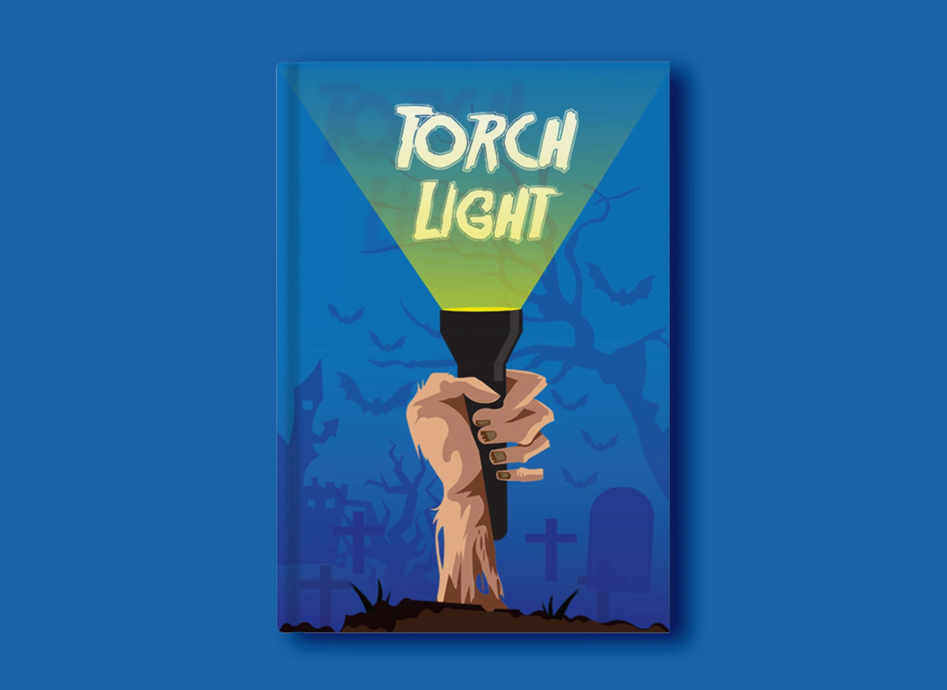 A spooky Halloween-themed book cover titled "Torch Light" featuring a hand rising from the ground, gripping a flashlight that illuminates the title. The background showcases a creepy graveyard scene with bats flying, eerie trees, and gravestones, all in dark tones to evoke a horror atmosphere.