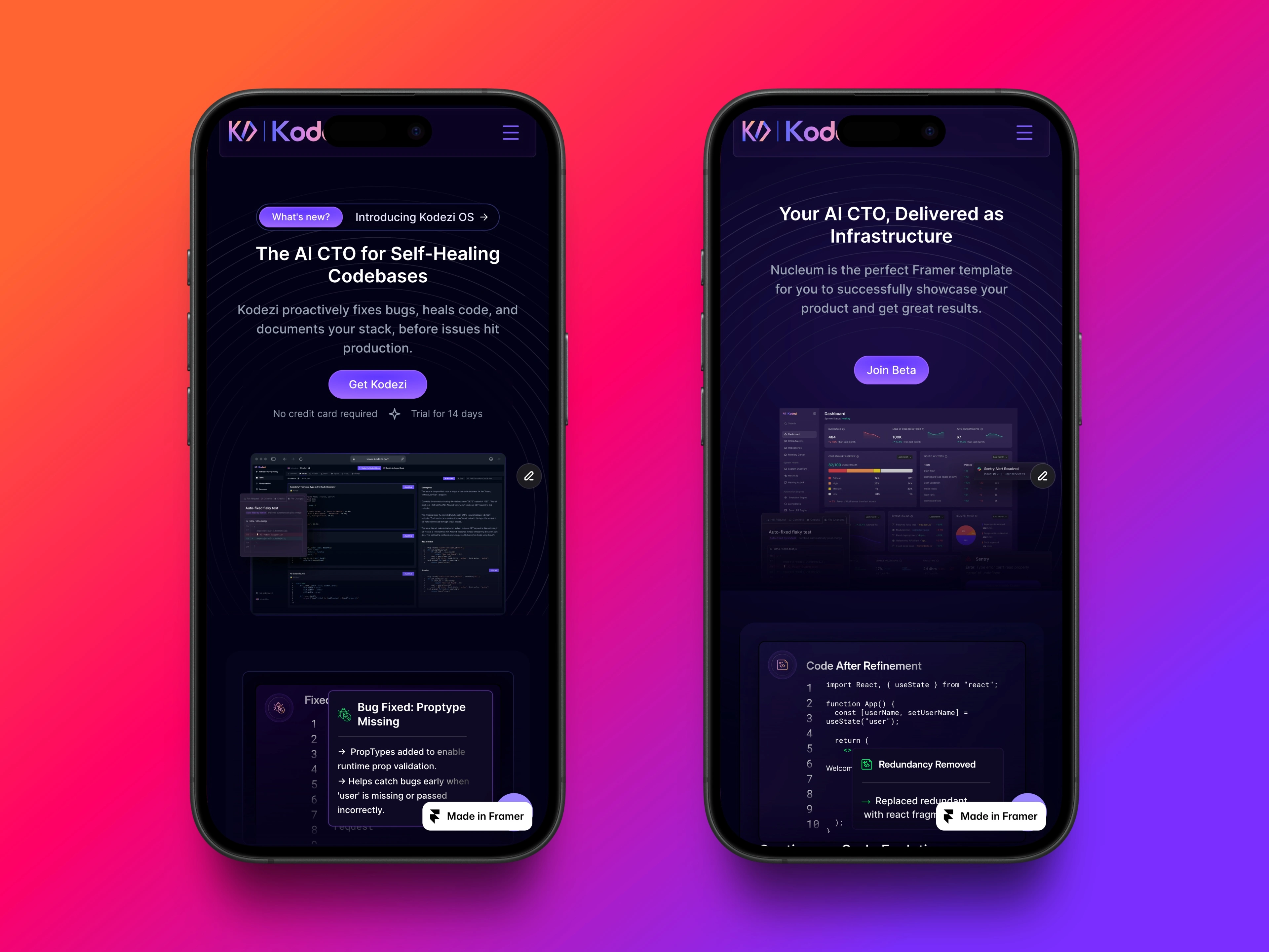 The redesigned website presents Kodezi as a more credible and polished developer tool. The improved structure and visual clarity make it easier for users to understand the product, while the Framer build ensures long-term scalability and easy iteration for the team.