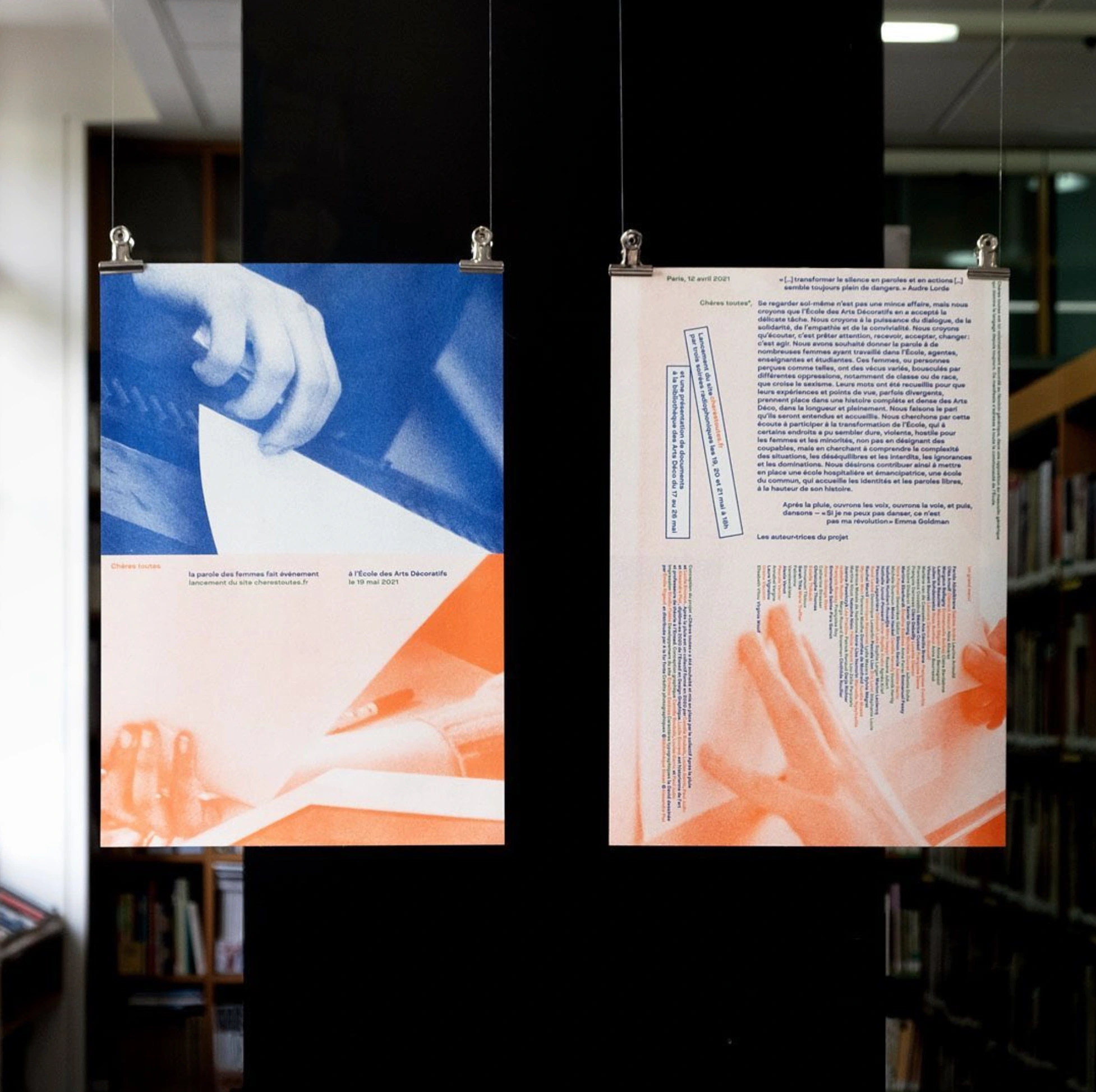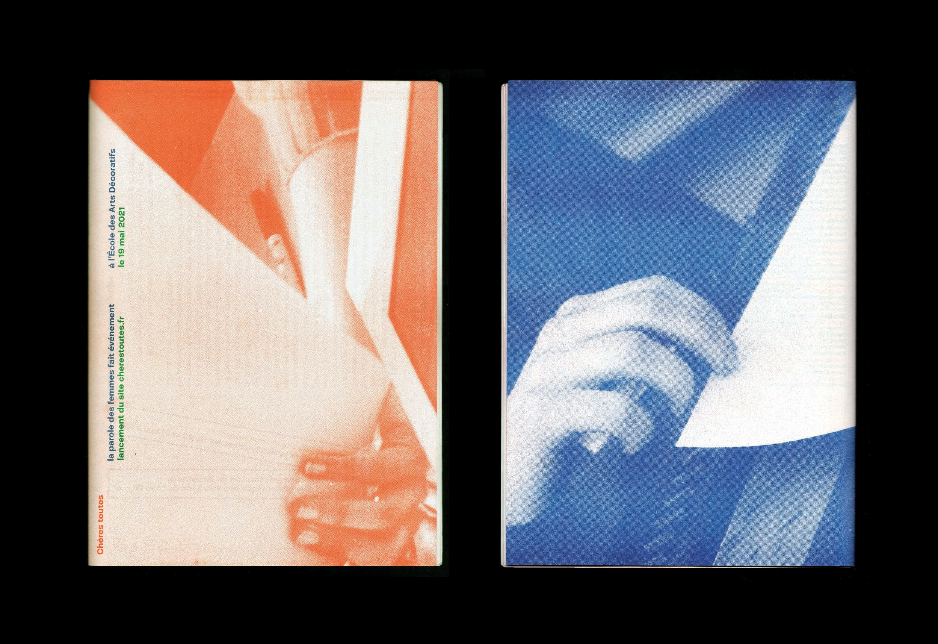 Design of the visual identity for the exhibition Chères Toutes, La parole des femmes fait évenement at the École des Arts Décoratifs de Paris. To accompany the exhibition, I created a fanzine and a poster printed using risography; a flyer bookmark; and a website archiving the event.