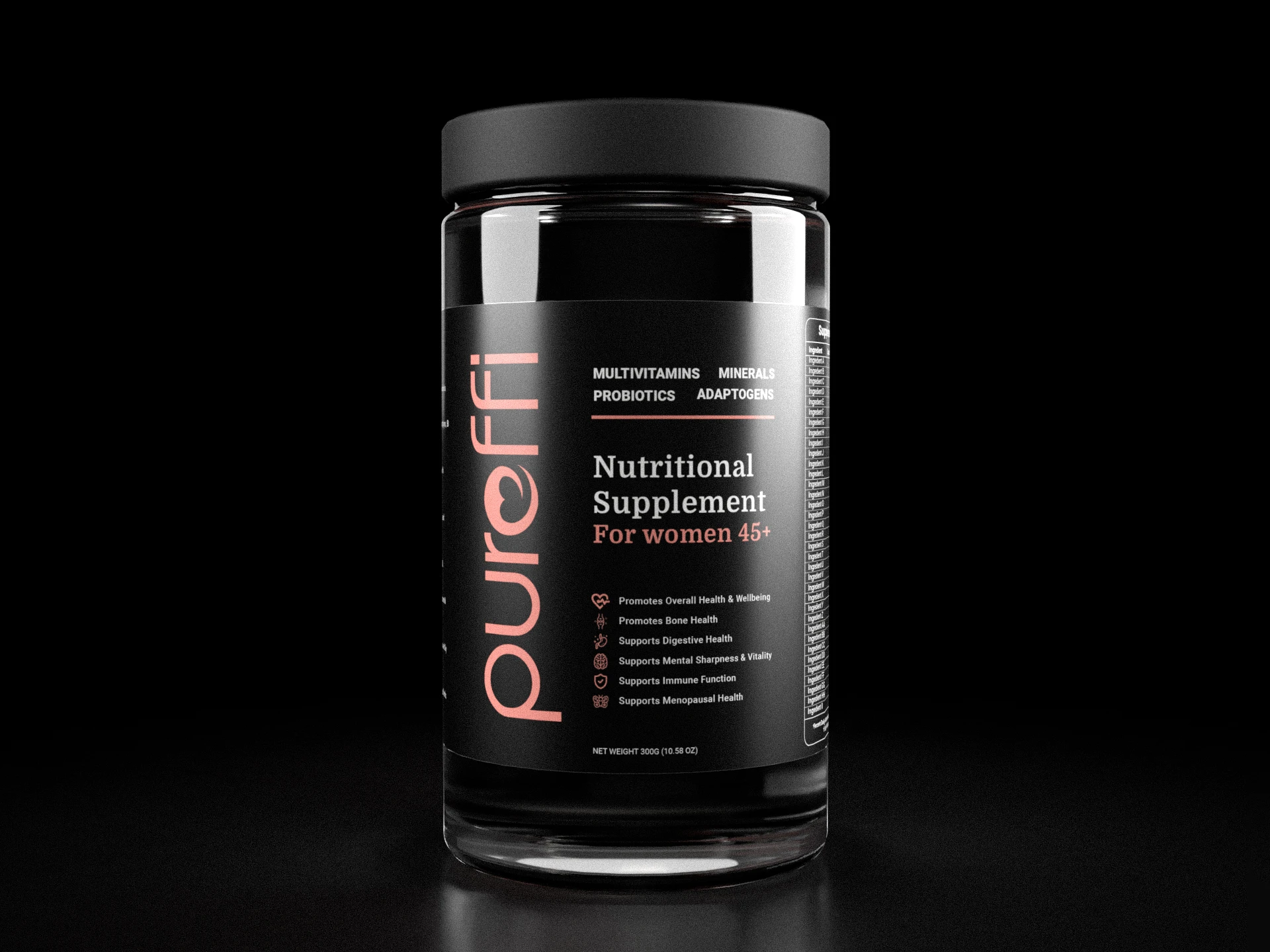 This is the label design for a nutritional supplement brand called Pureffi, specifically designed for women. The goal of this project was to create a visually appealing and informative label that meets the client's demand for a modern, professional, and minimalist design, featuring a black background with pink accents.