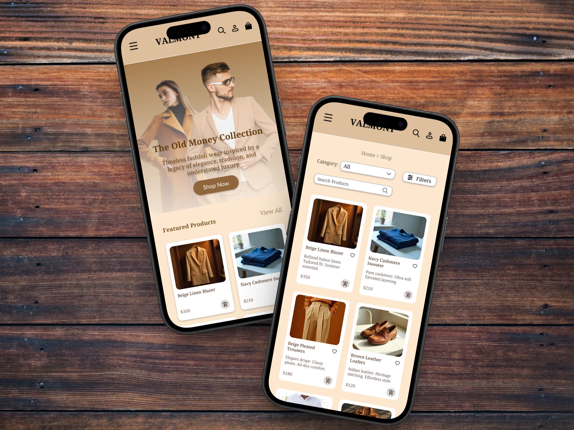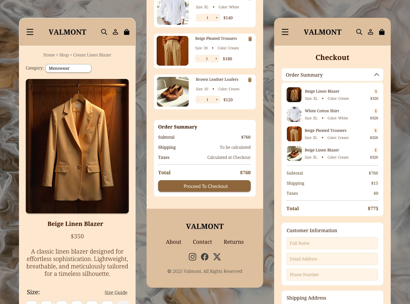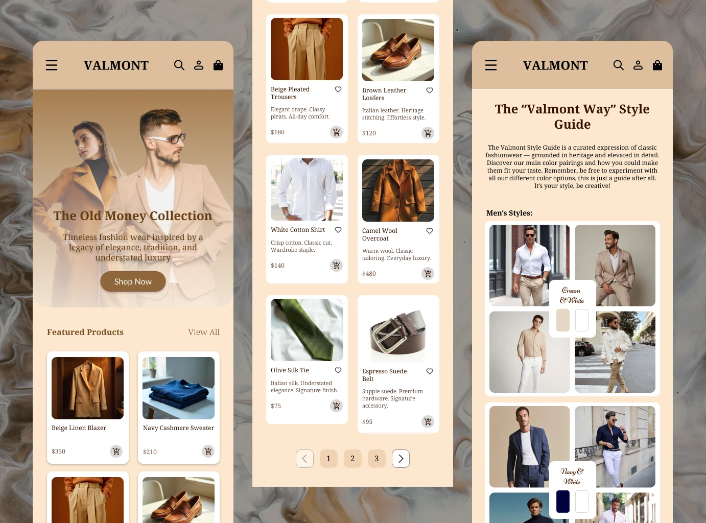 Goal: Design an elevated e-commerce platform for Valmont, a luxury menswear brand rooted in the old money aesthetic, focusing on premium tailoring, timeless silhouettes, and storytelling through design.