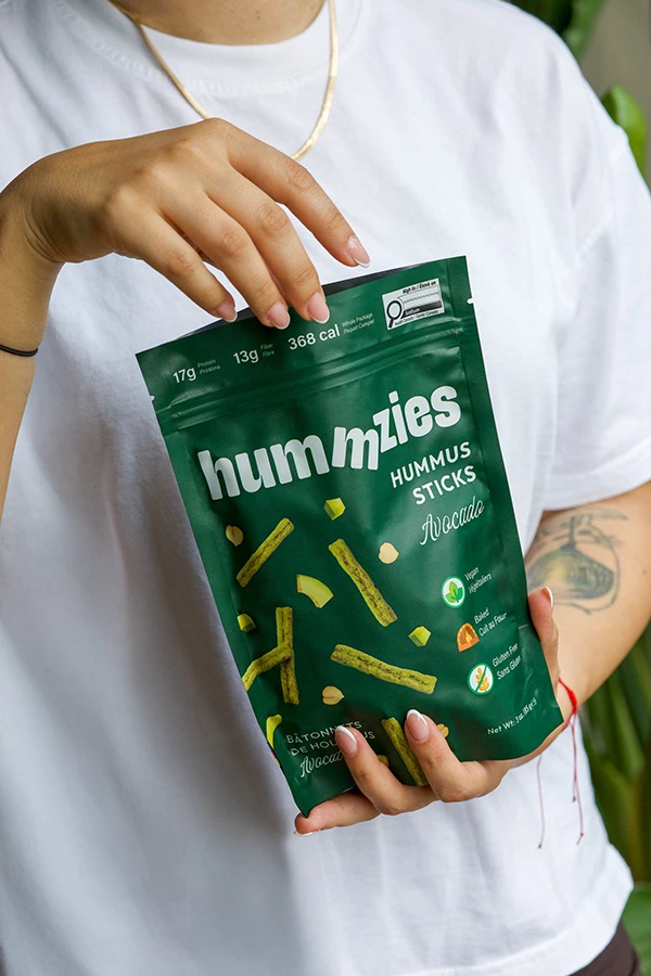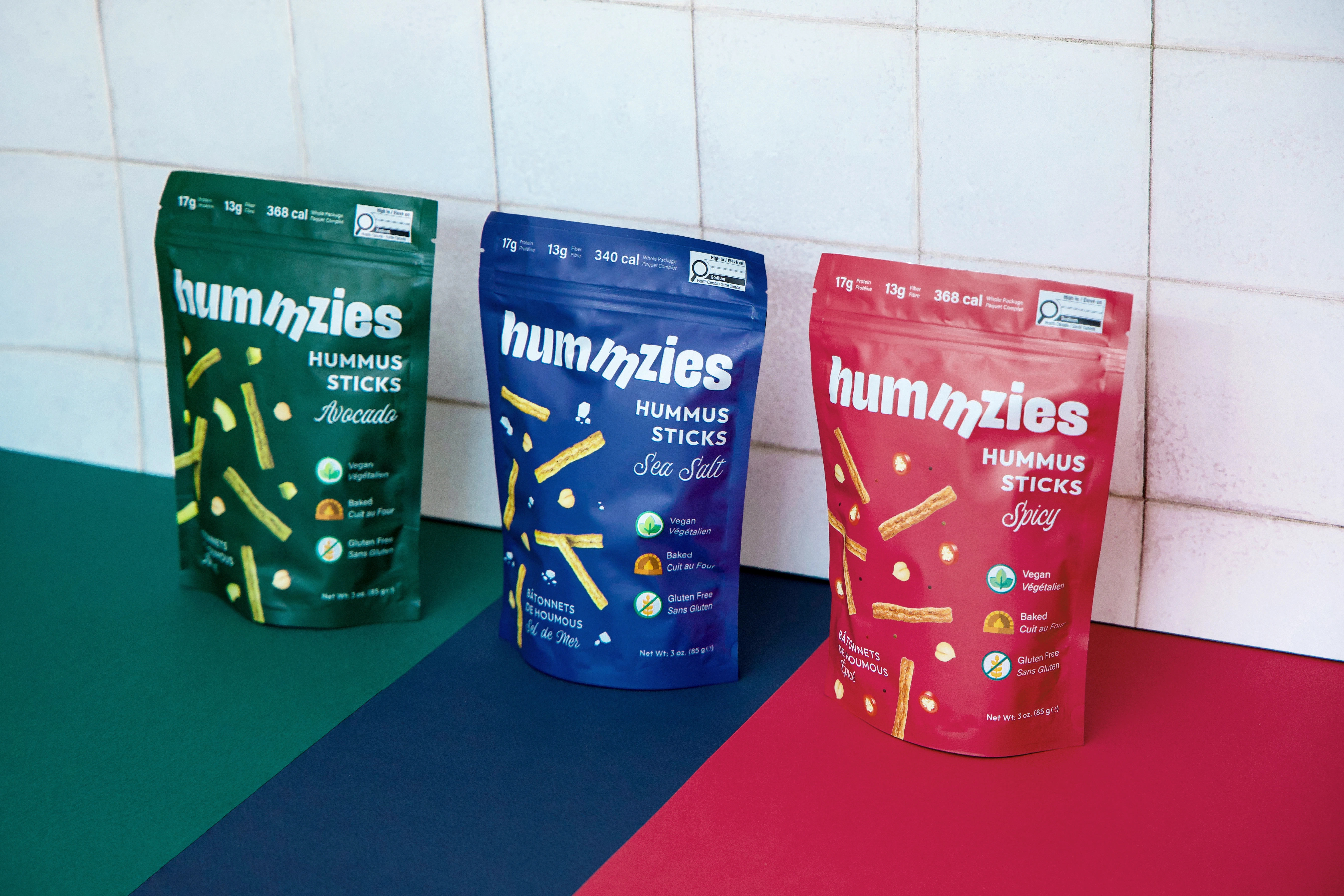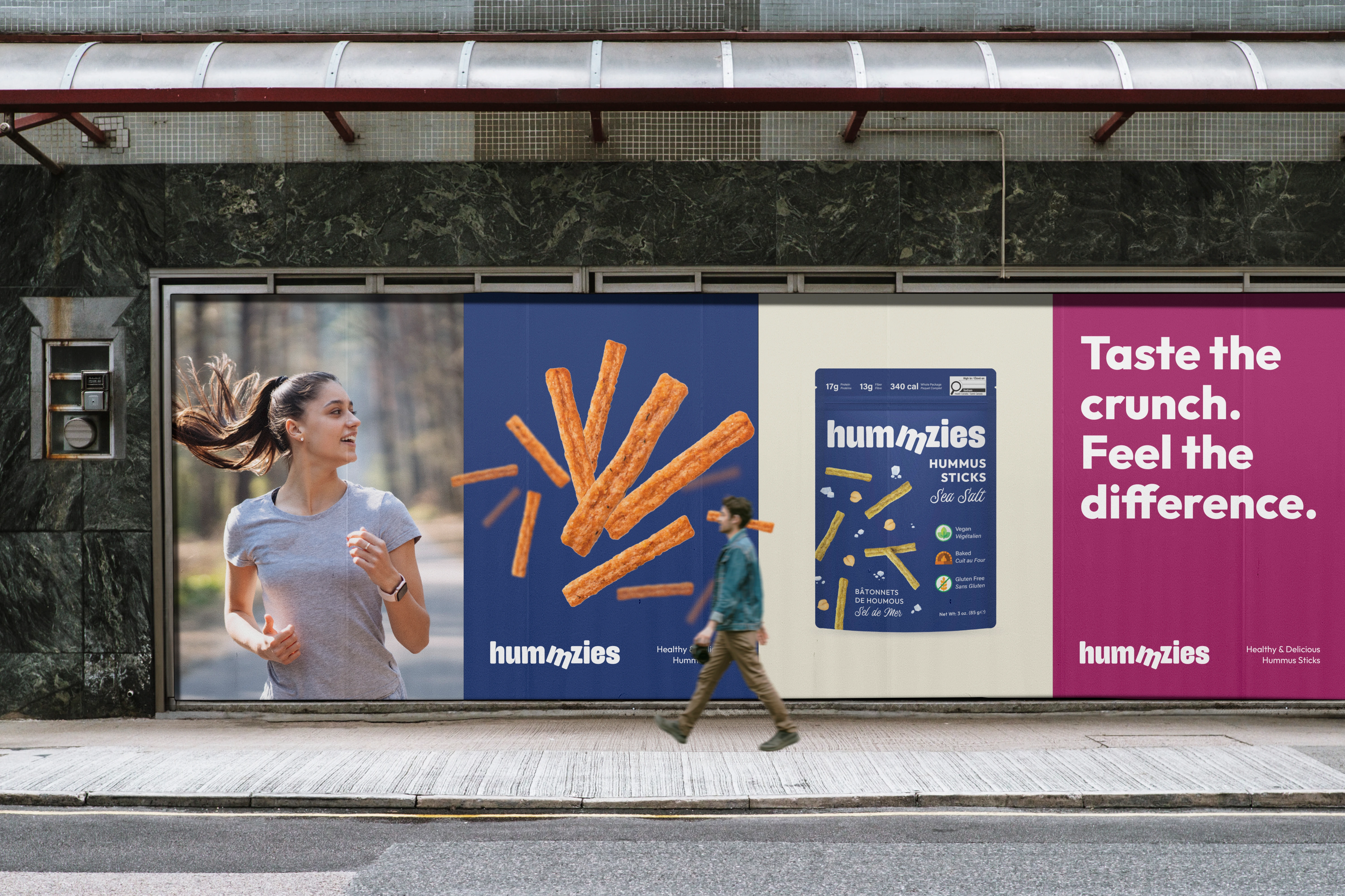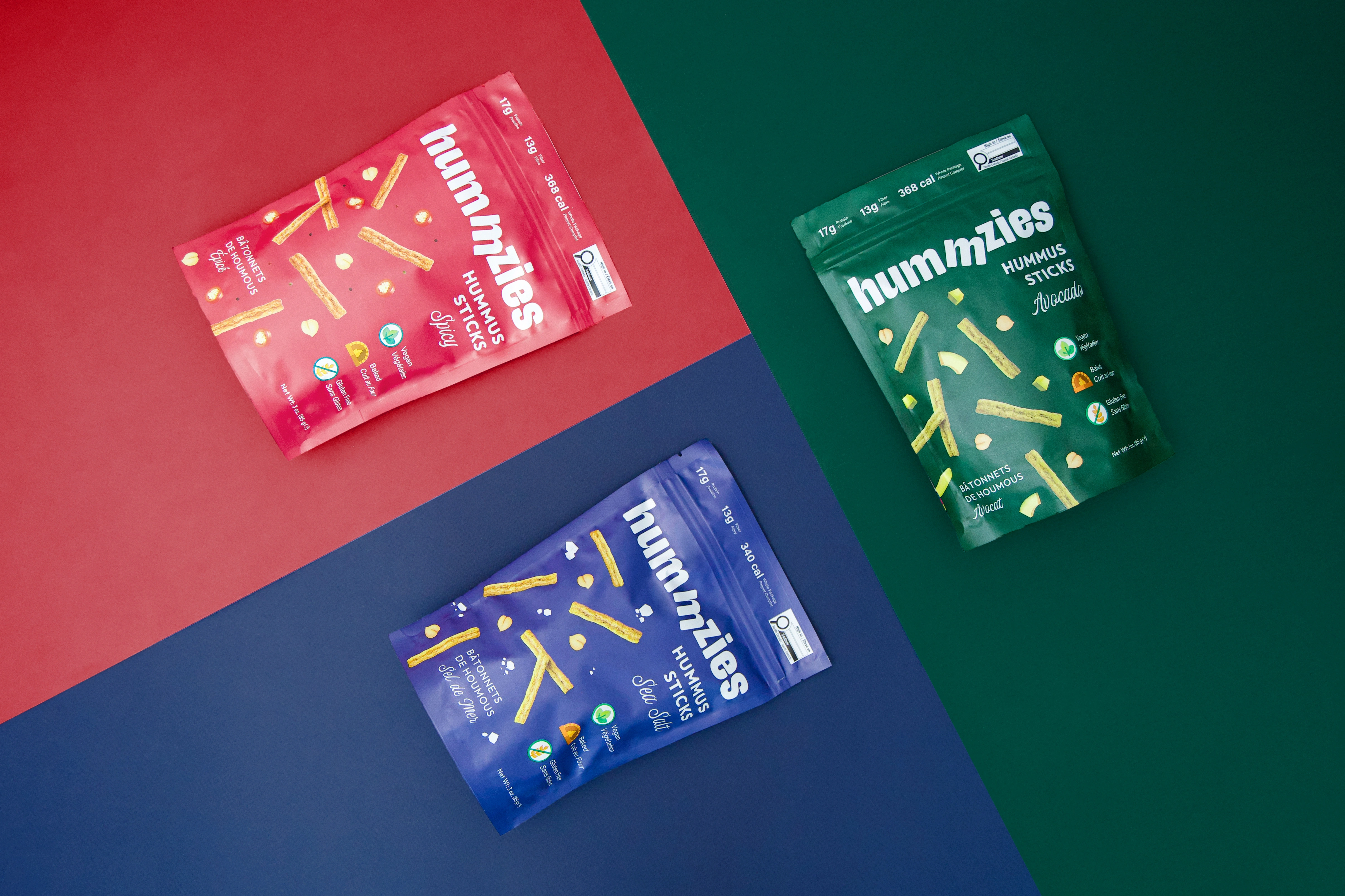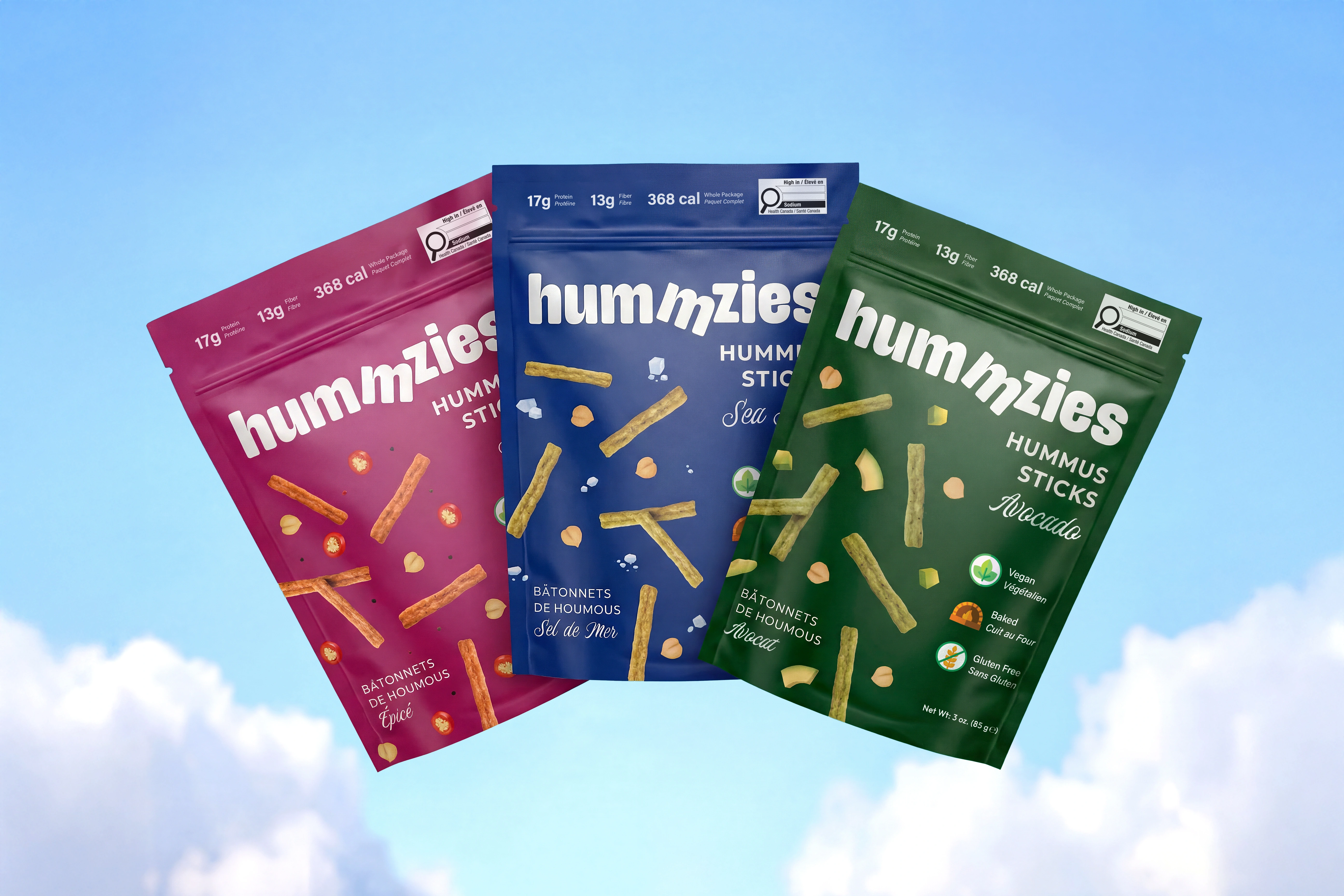 Our field research revealed a common trend among healthy snack brands: light colors, pastel tones, and predominantly white backgrounds. Hummzies intentionally breaks this pattern. We opted for rich, saturated backgrounds — deep blue, bold red, and forest green — to create instant shelf impact and visual distinction. The minimal layout allows consumers to easily identify the product and its key benefits at a glance.