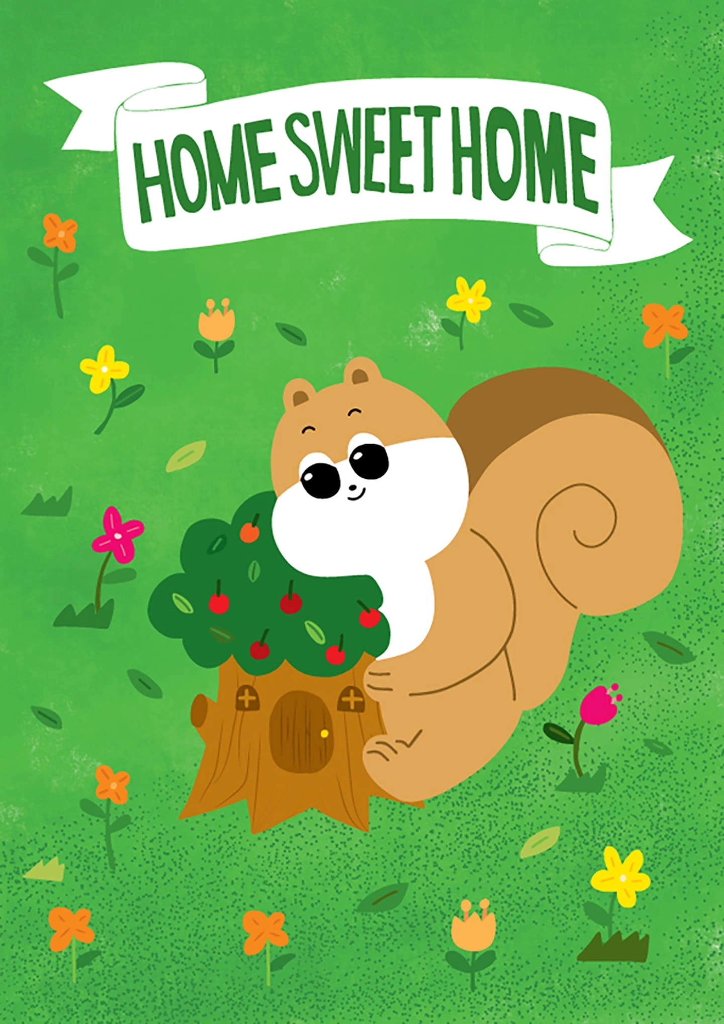 An illustration of a squirrel in a forest treating a tree house dearly.
