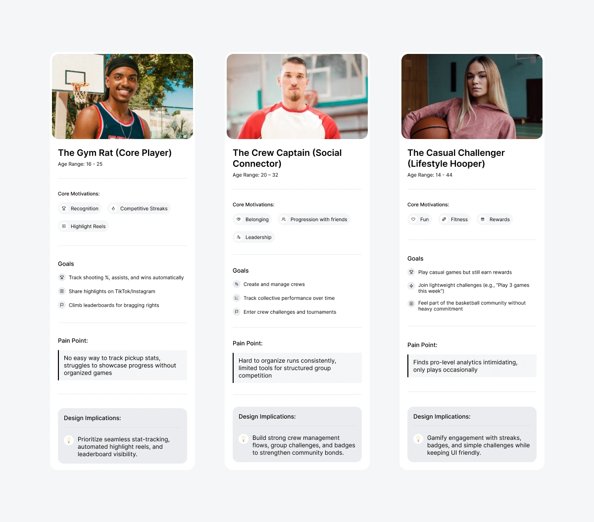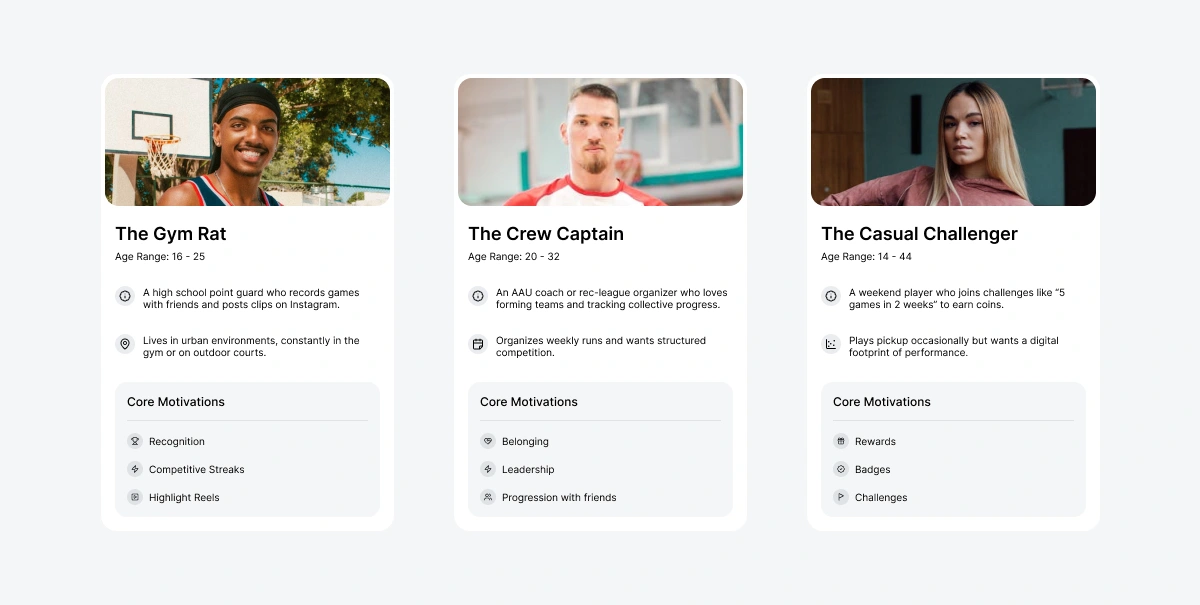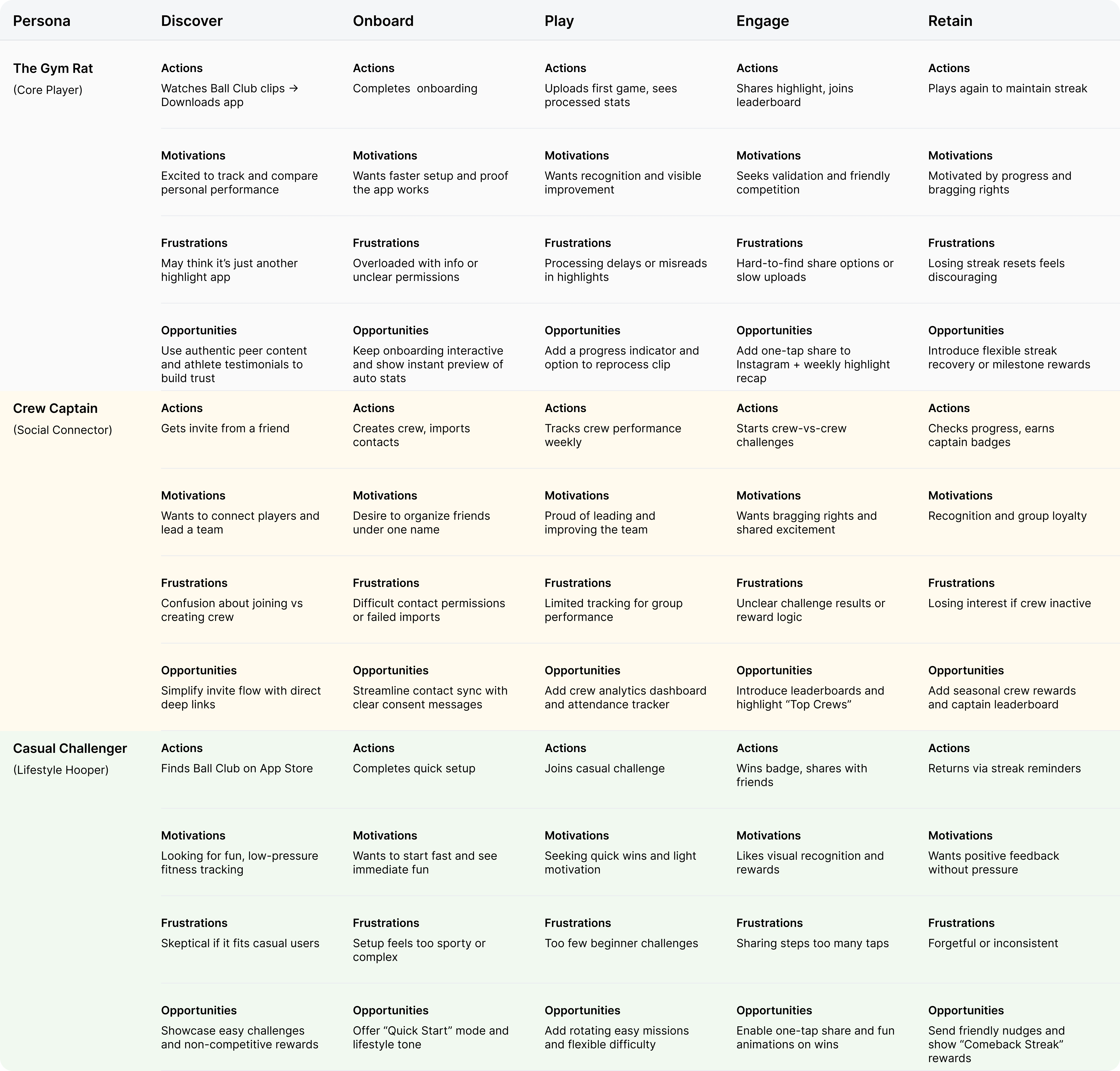 This stage was about moving from research and opportunity framing into tangible design structures. I started with low-fidelity sketches, then evolved them into wireframes that shaped the core flows of the Ball Club experience. Afterwards, I transformed the structured wireframes into a visually compelling, branded product experience. By layering typography, color, and microinteractions on top of the flows, the Ball Club app moved from sketches into something users could immediately connect with.