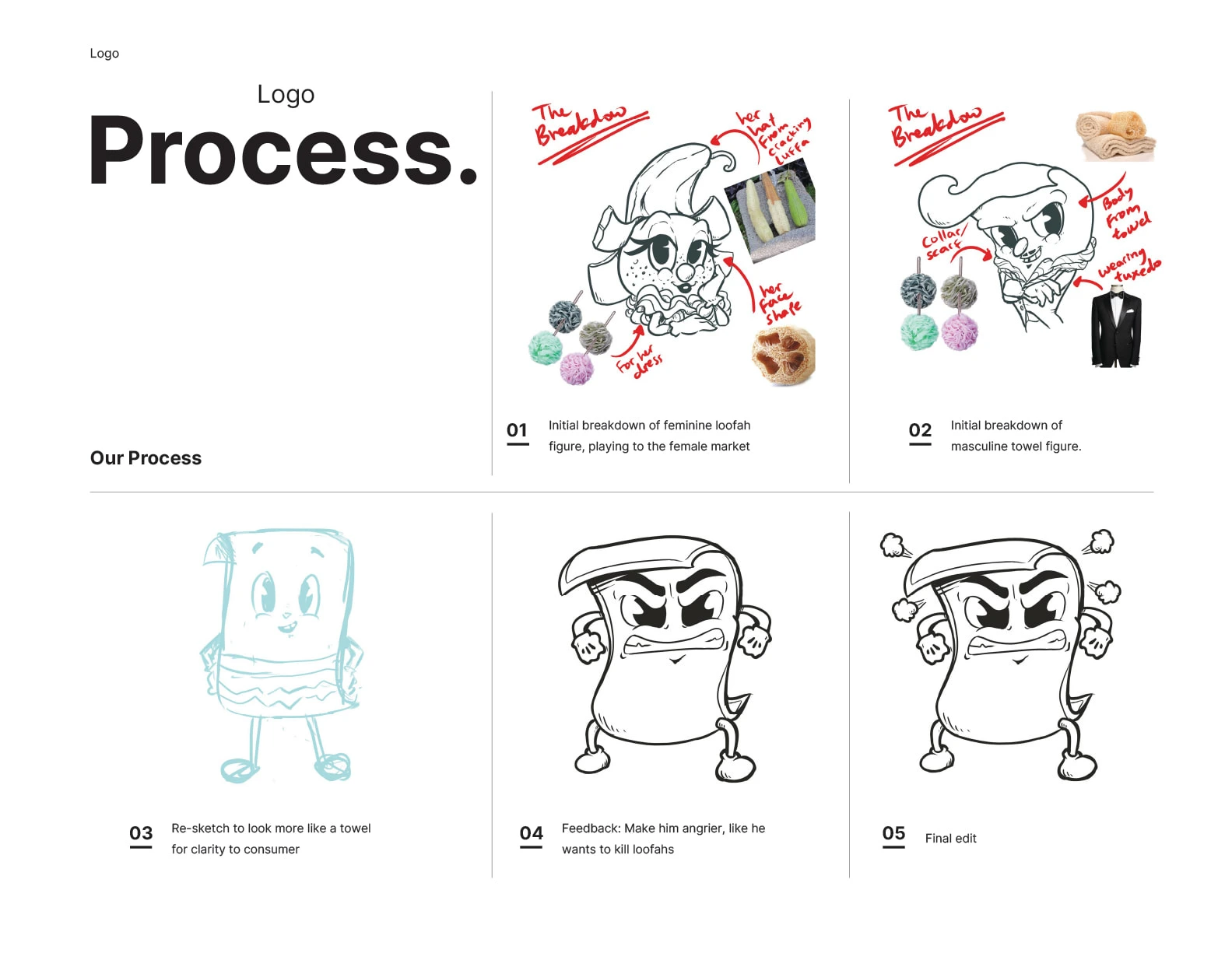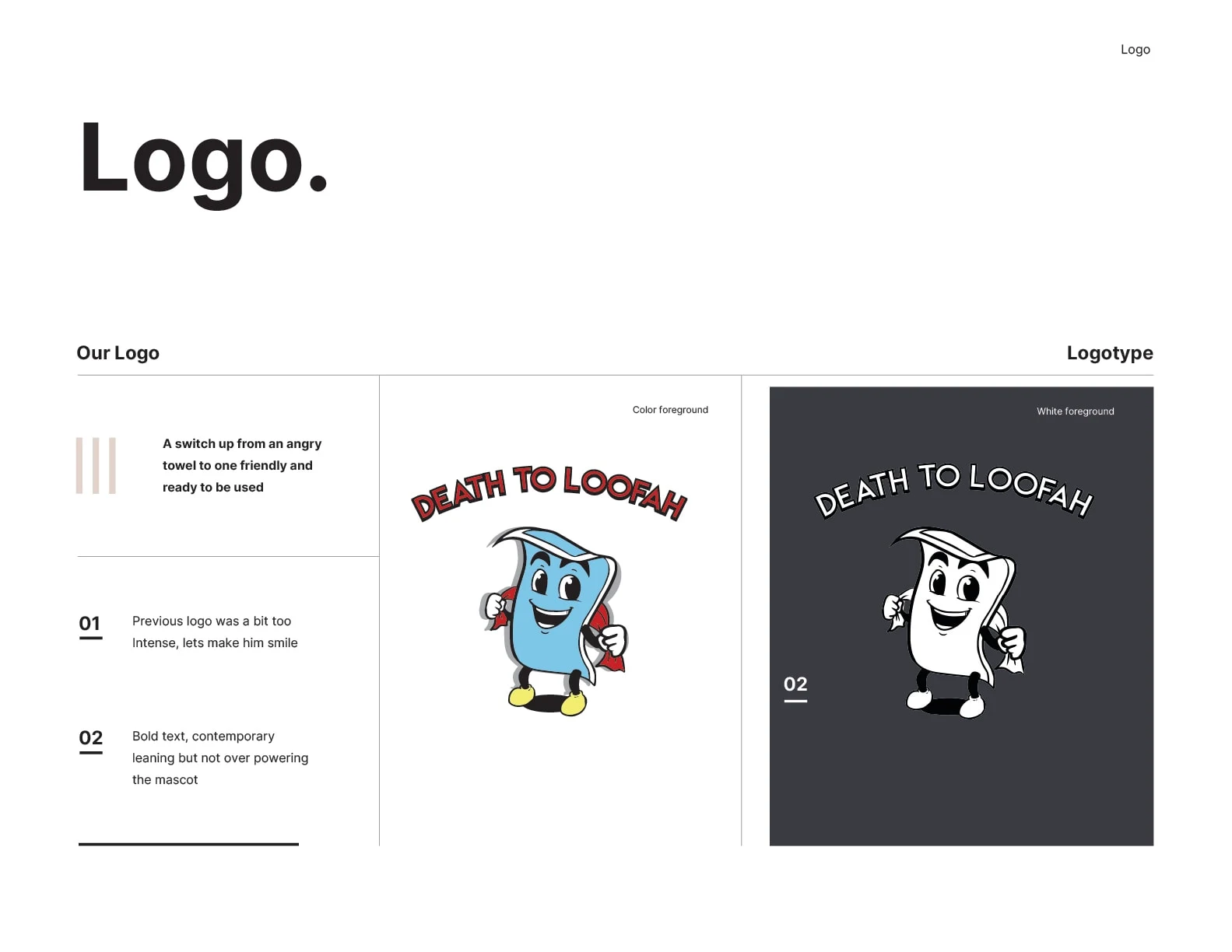 Death to Loofah Branding and Re-Branding. Rebrand mission was to soften the character, create a happier look.
