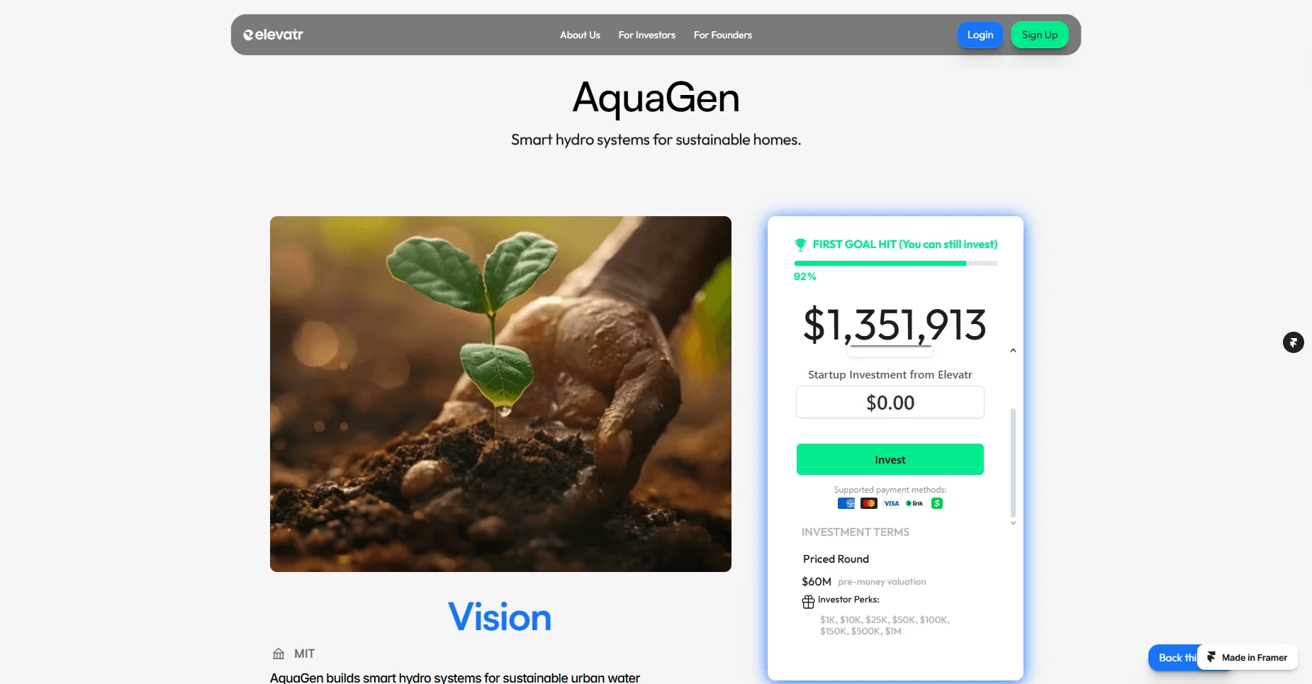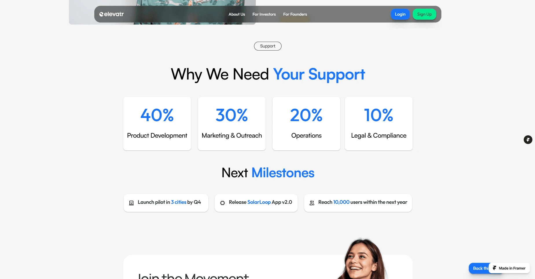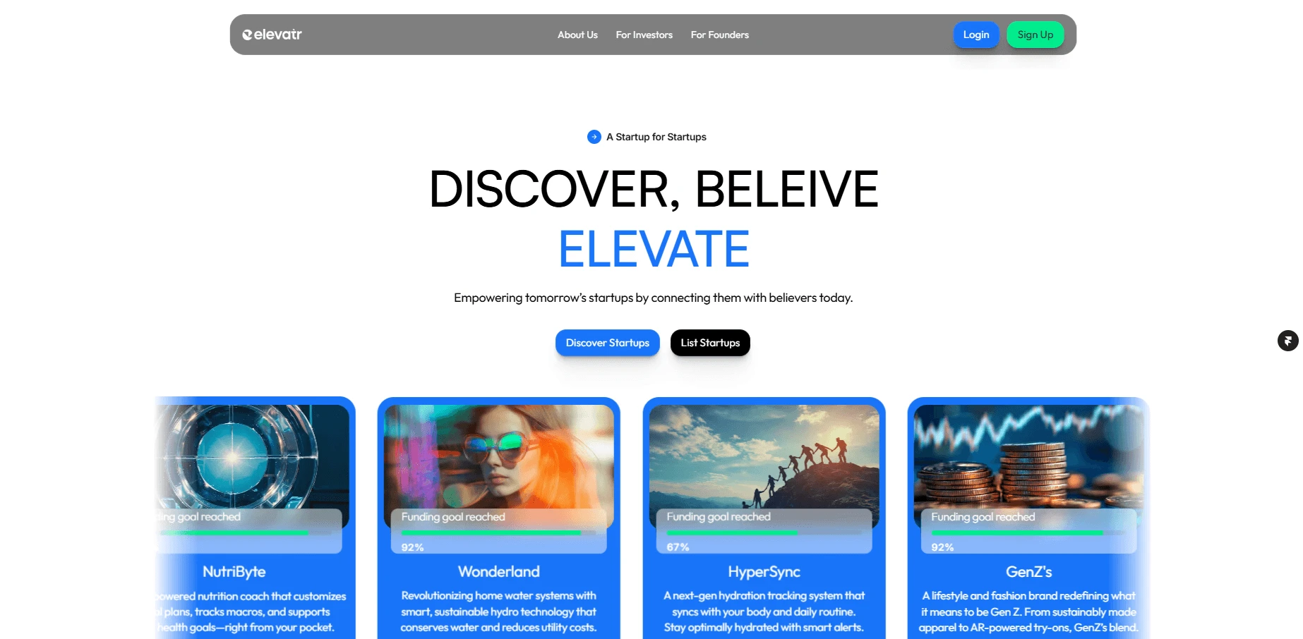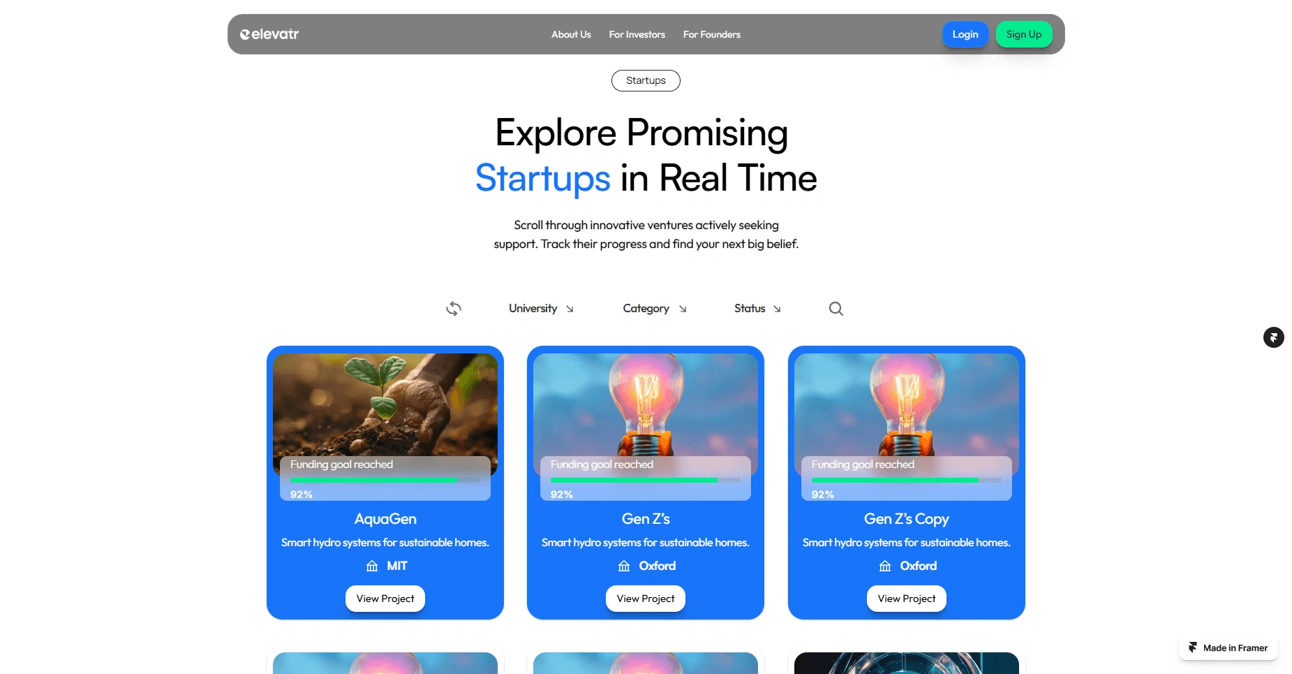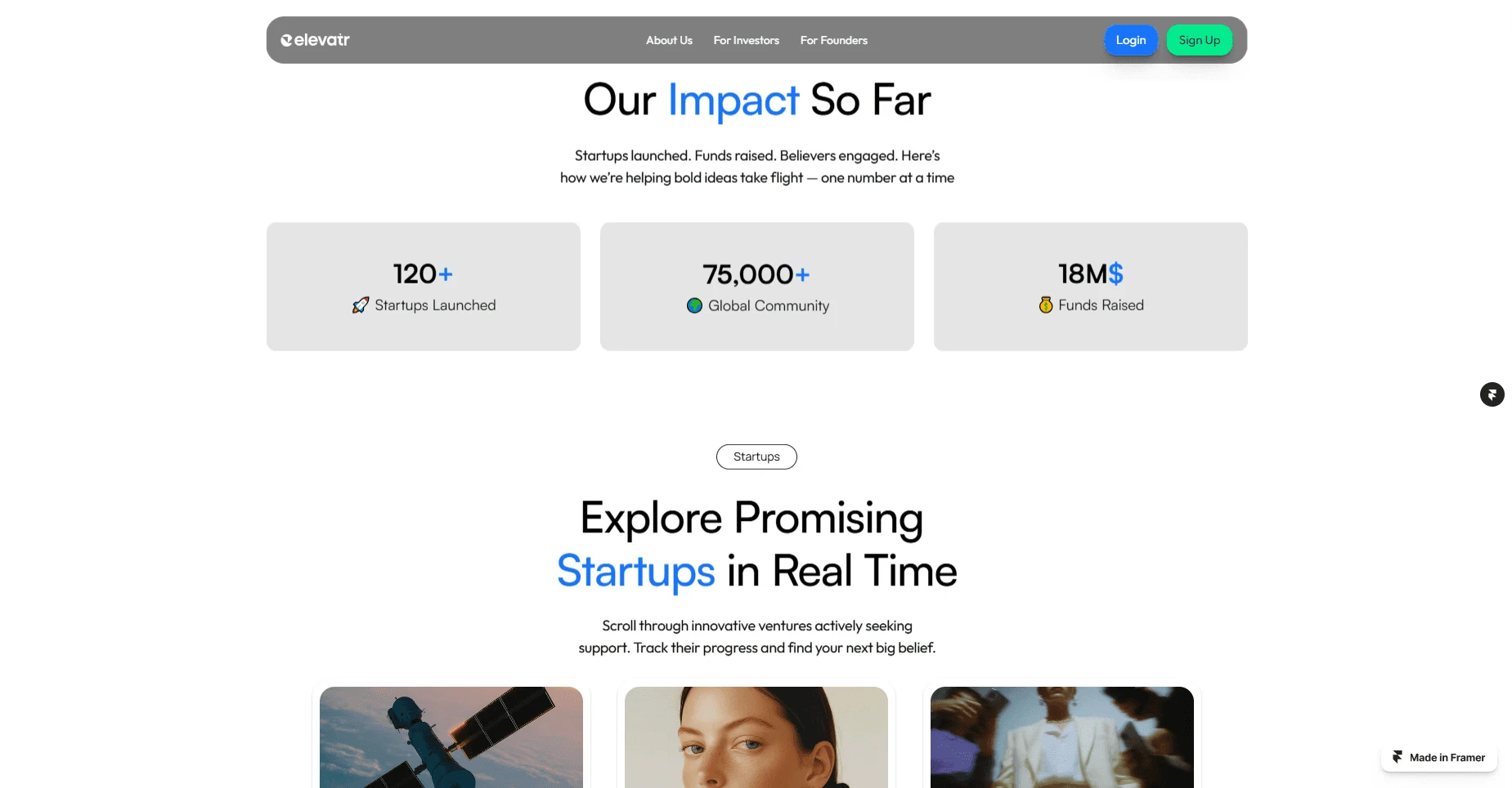 Elevatr is a bold and future-forward platform that connects promising university-backed startups with curious investors in real time. Designed to make venture discovery intuitive and inspiring, the platform helps early-stage projects raise funds, build credibility, and tell their story to the world. For this project, I crafted a high-impact interface in Framer, combining clean layouts with powerful typography and smart microinteractions. The design prioritizes usability for both founders and investors, while showcasing each startup's mission, team, roadmap, and funding milestones. I also developed modular pages for each venture, complete with investor perks, growth stats, and founder testimonials — all dynamically structured for scalability. The result is a seamless experience that supports Elevatr's mission: to elevate belief in the next generation of innovation. This was one of my most dynamic builds — a beautiful intersection of branding, interaction, and conversion strategy.