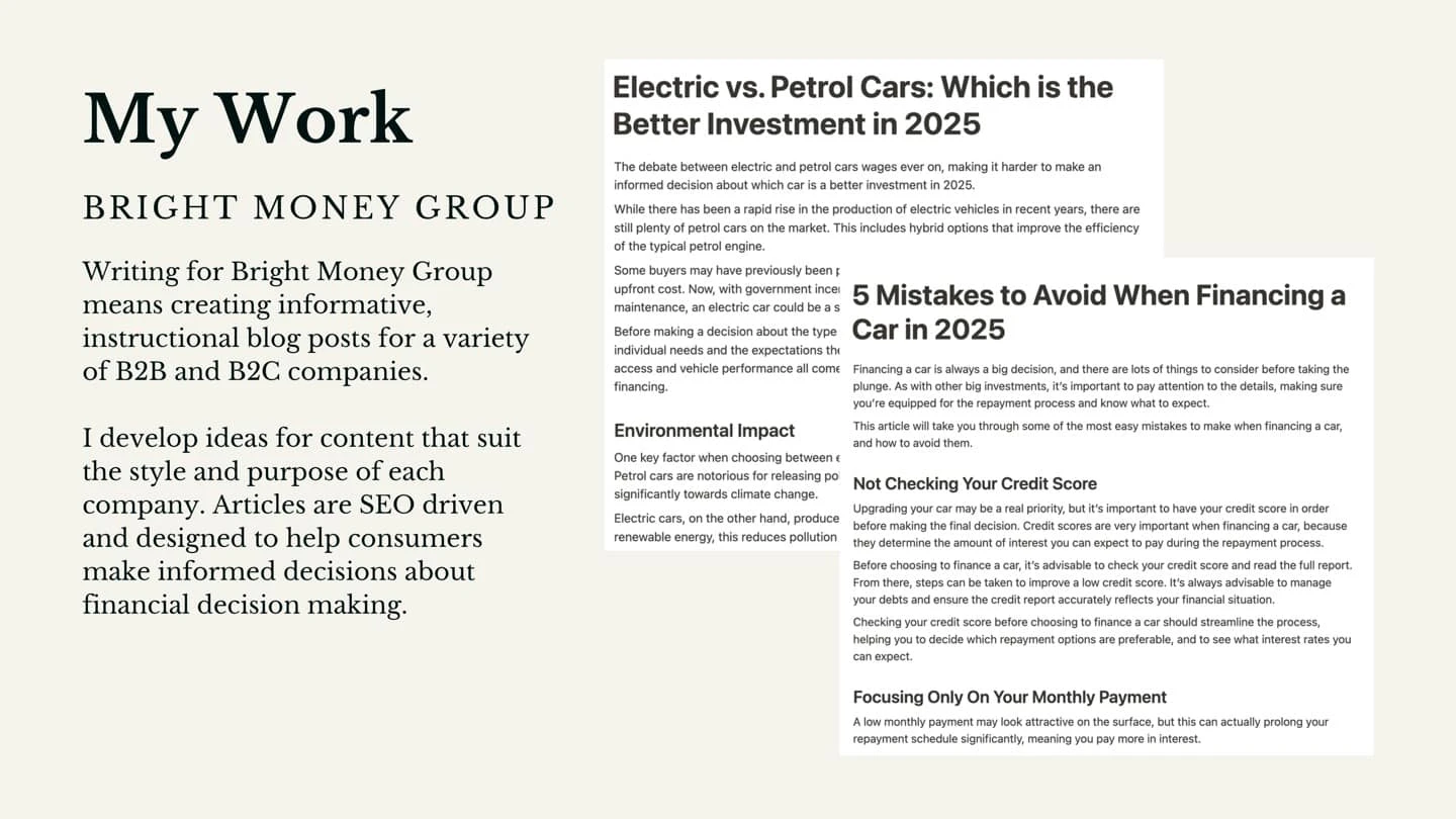 Writing SEO specialised articles about a variety of topics concerning financial services for B2B and B2C audiences.