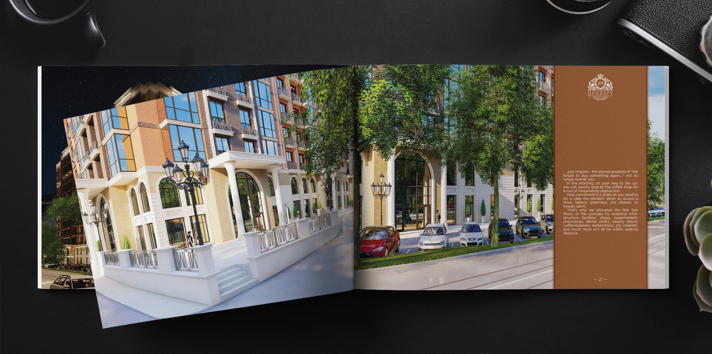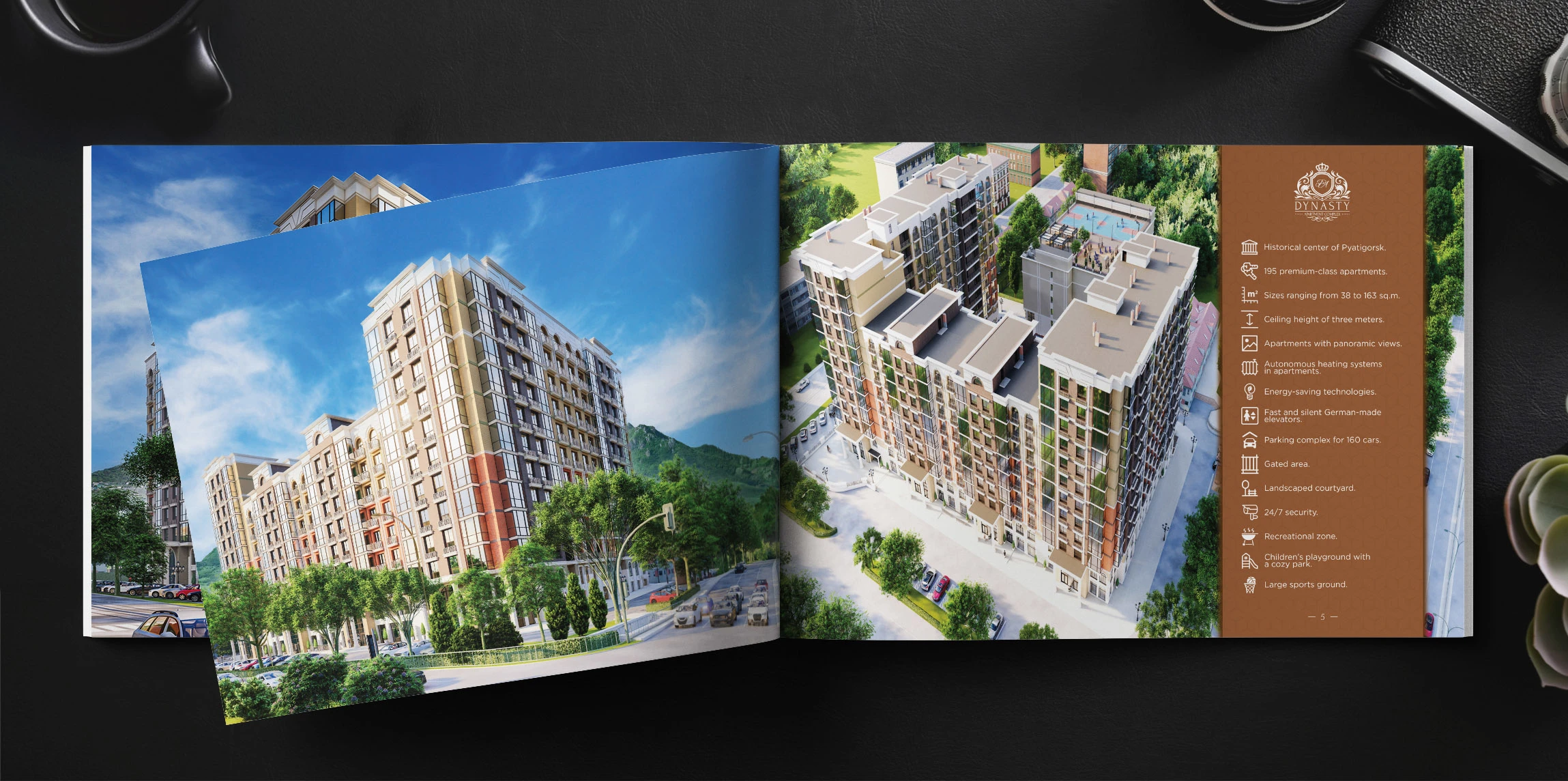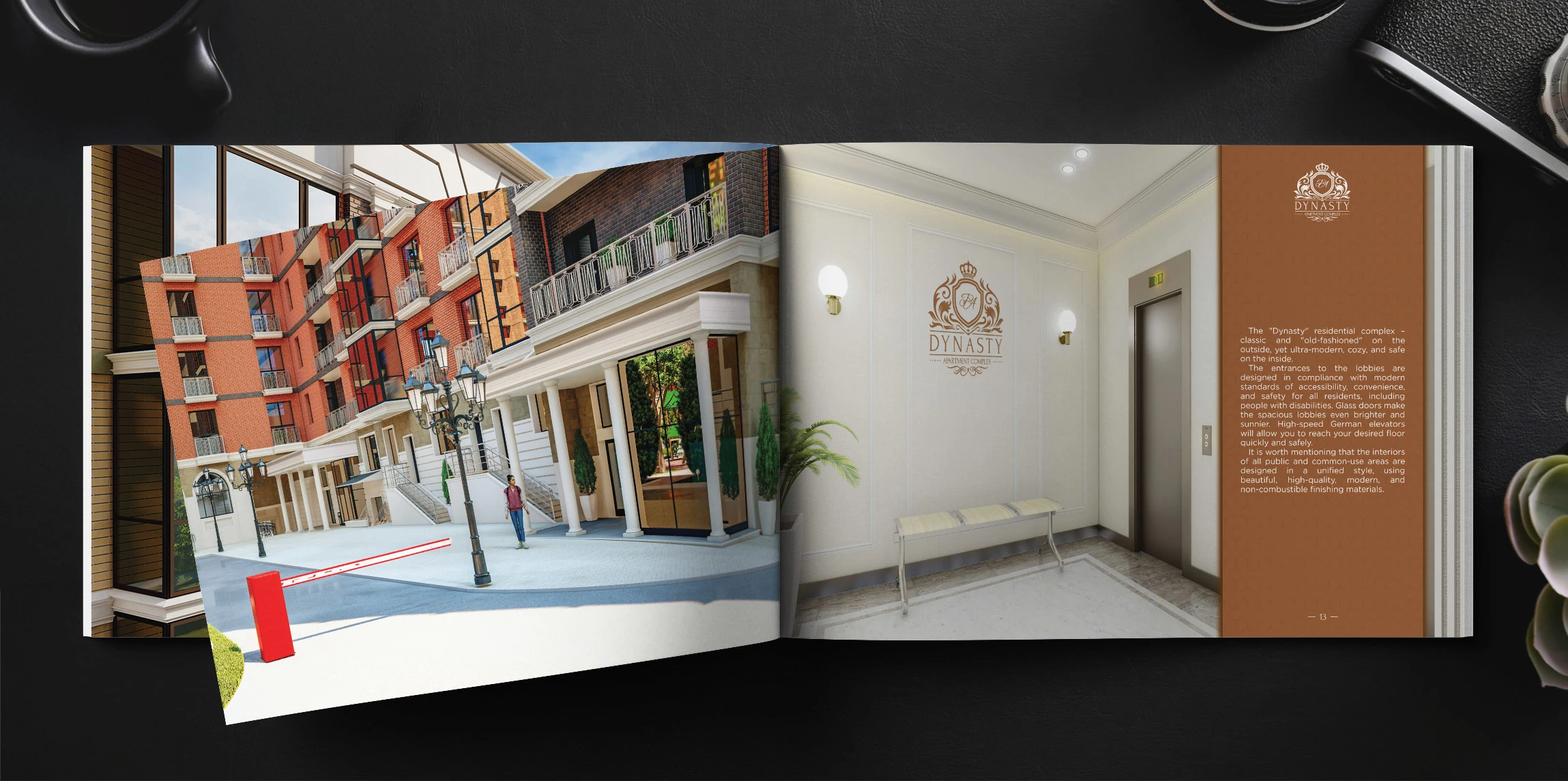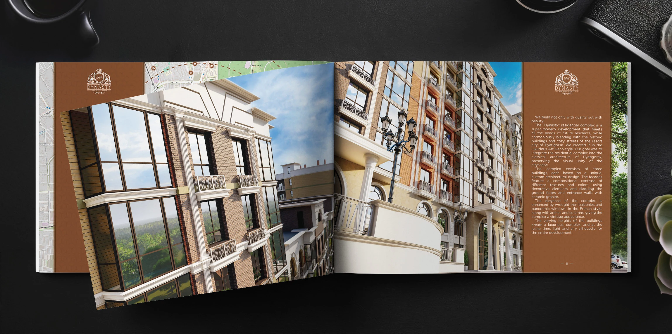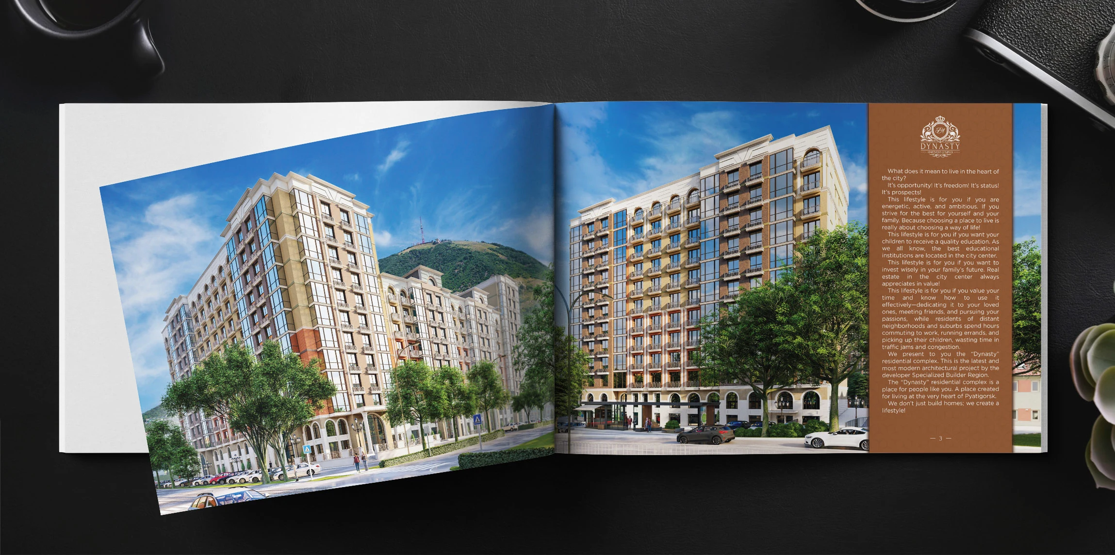 The "Dynasty" apartment complex project began with the creation of a logotype. Next, 3D renders were developed in collaboration with a designer and refined to seamlessly integrate the buildings into the existing landscape. A presentation brochure was then designed, with attention to clean layout and elegant typography.