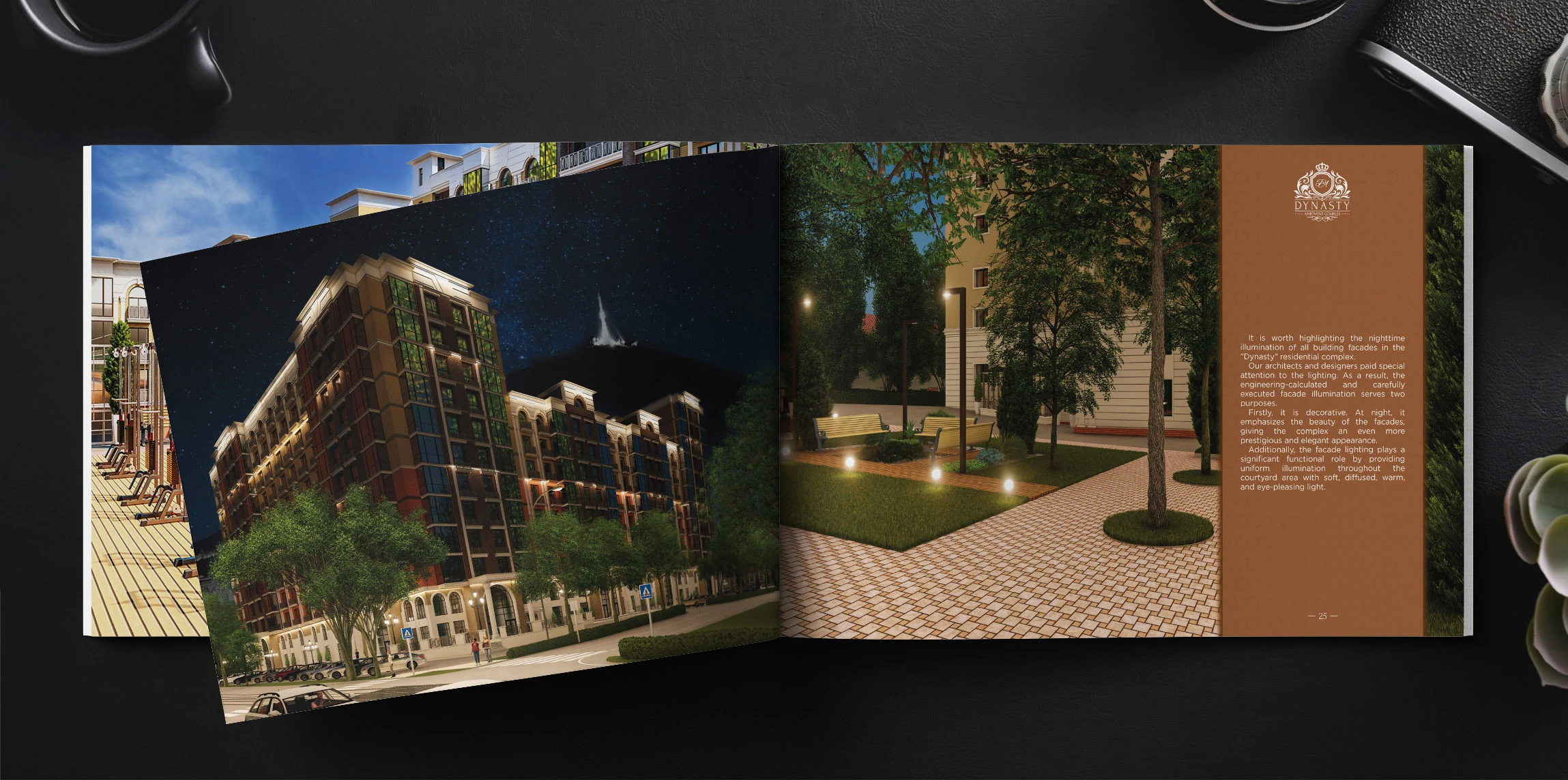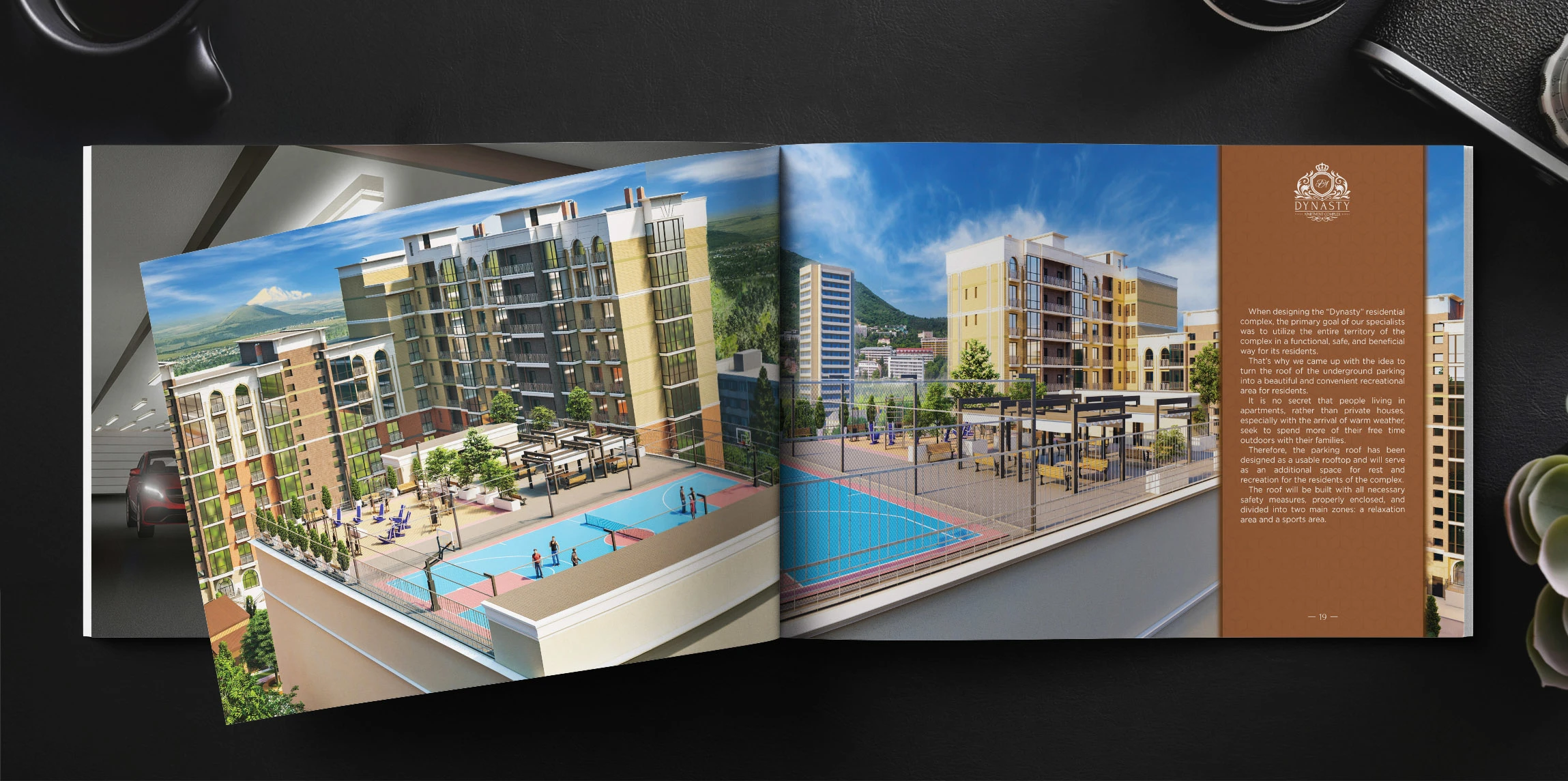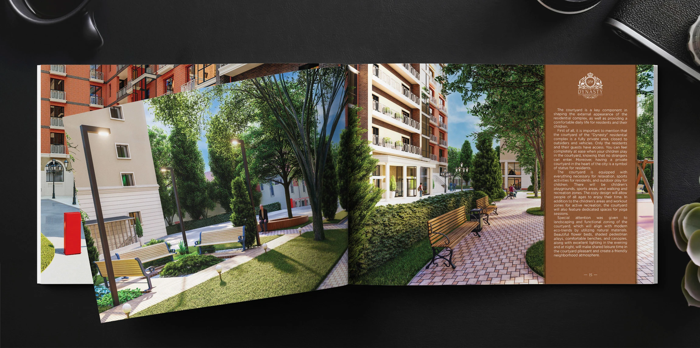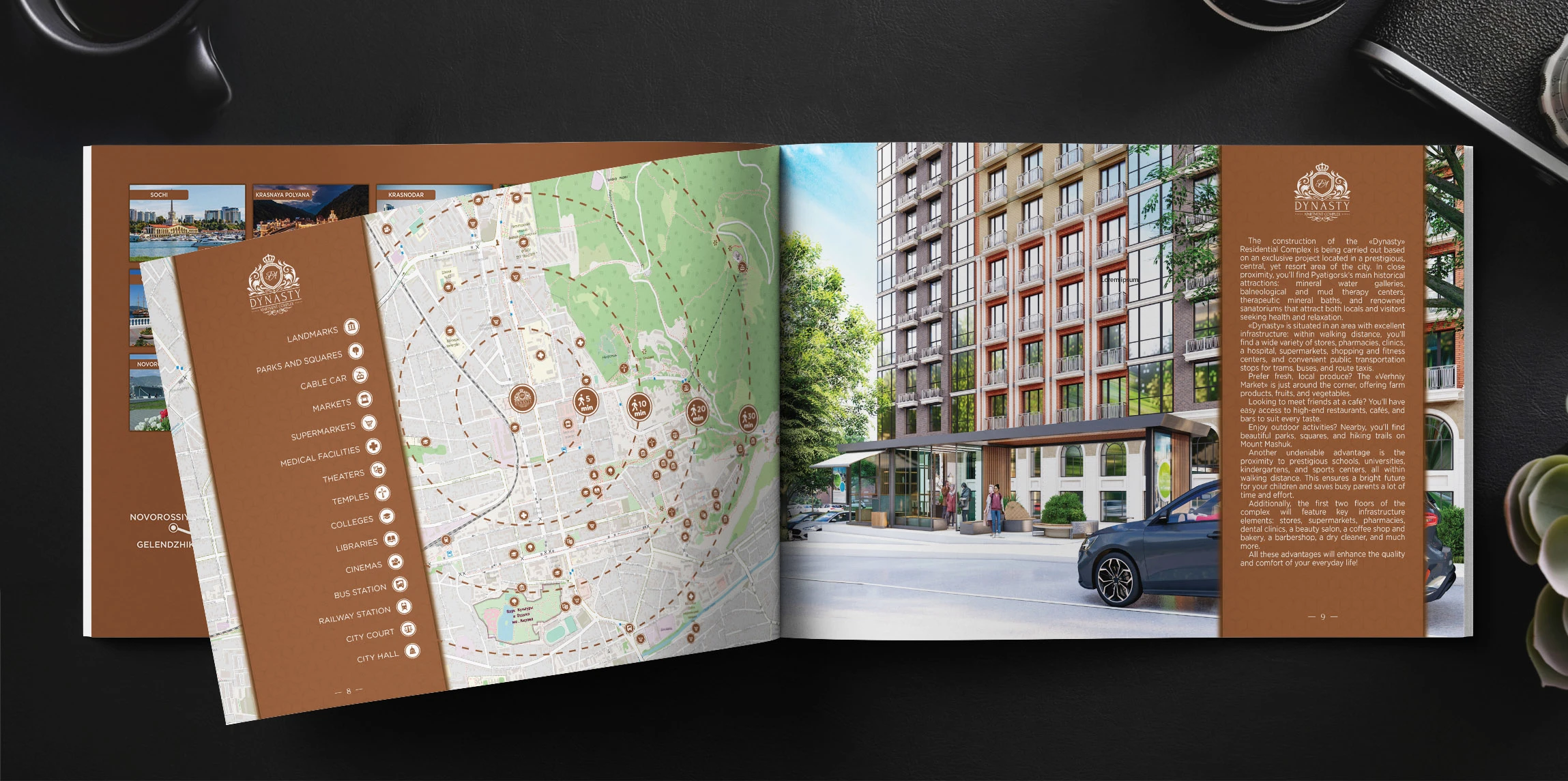 The "Dynasty" apartment complex project began with the creation of a logotype. Next, 3D renders were developed in collaboration with a designer and refined to seamlessly integrate the buildings into the existing landscape. A presentation brochure was then designed, with attention to clean layout and elegant typography.
