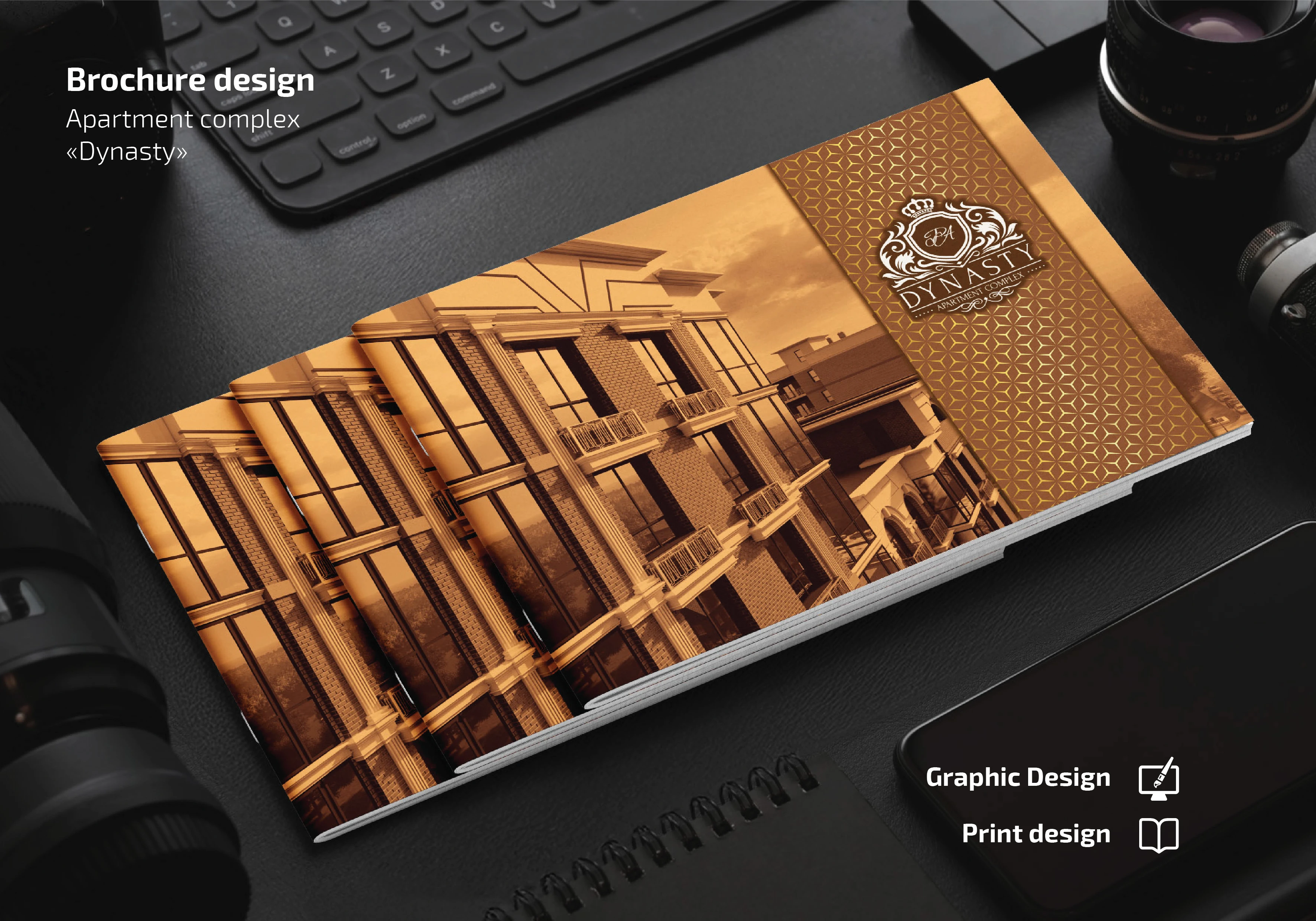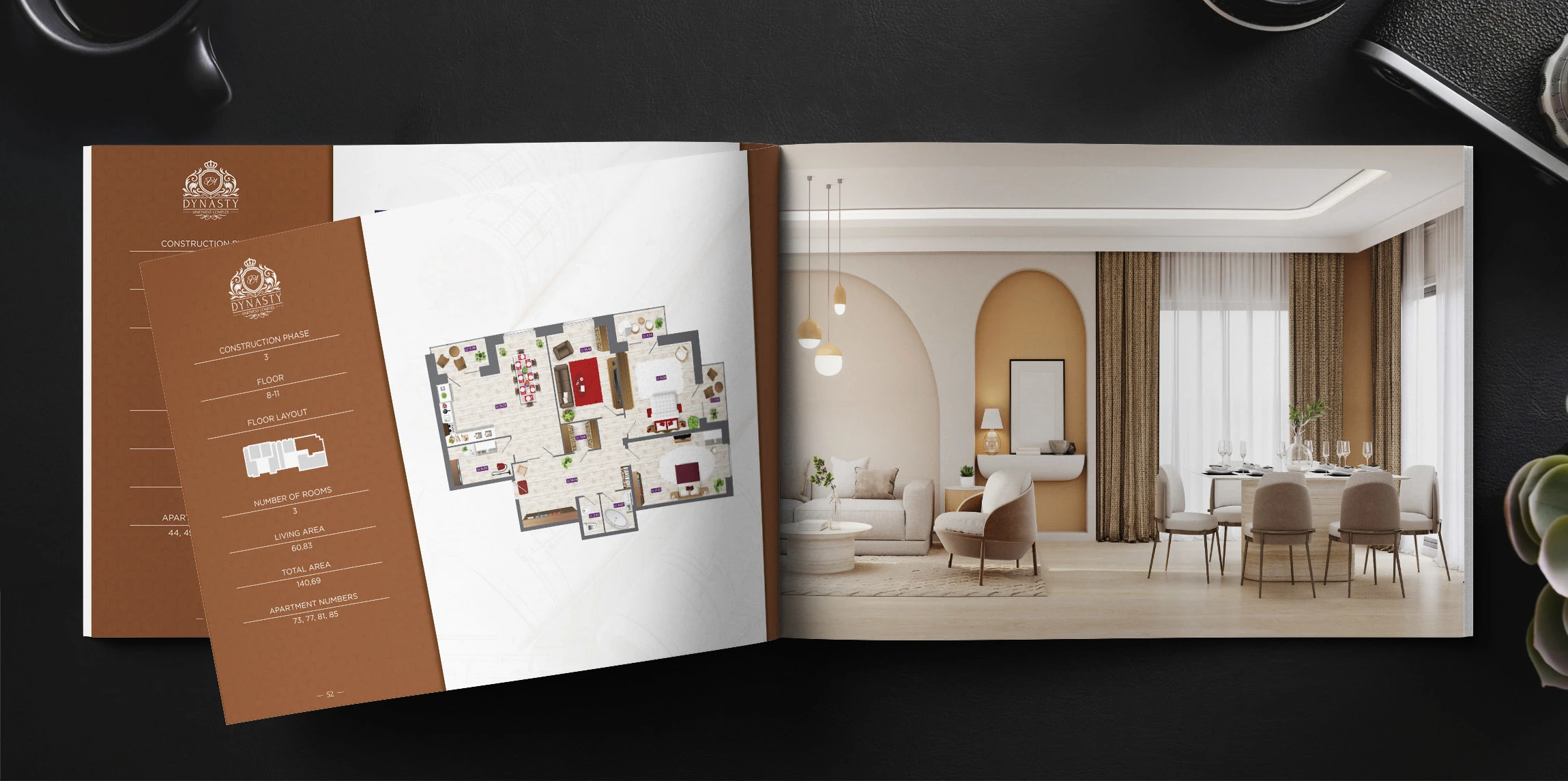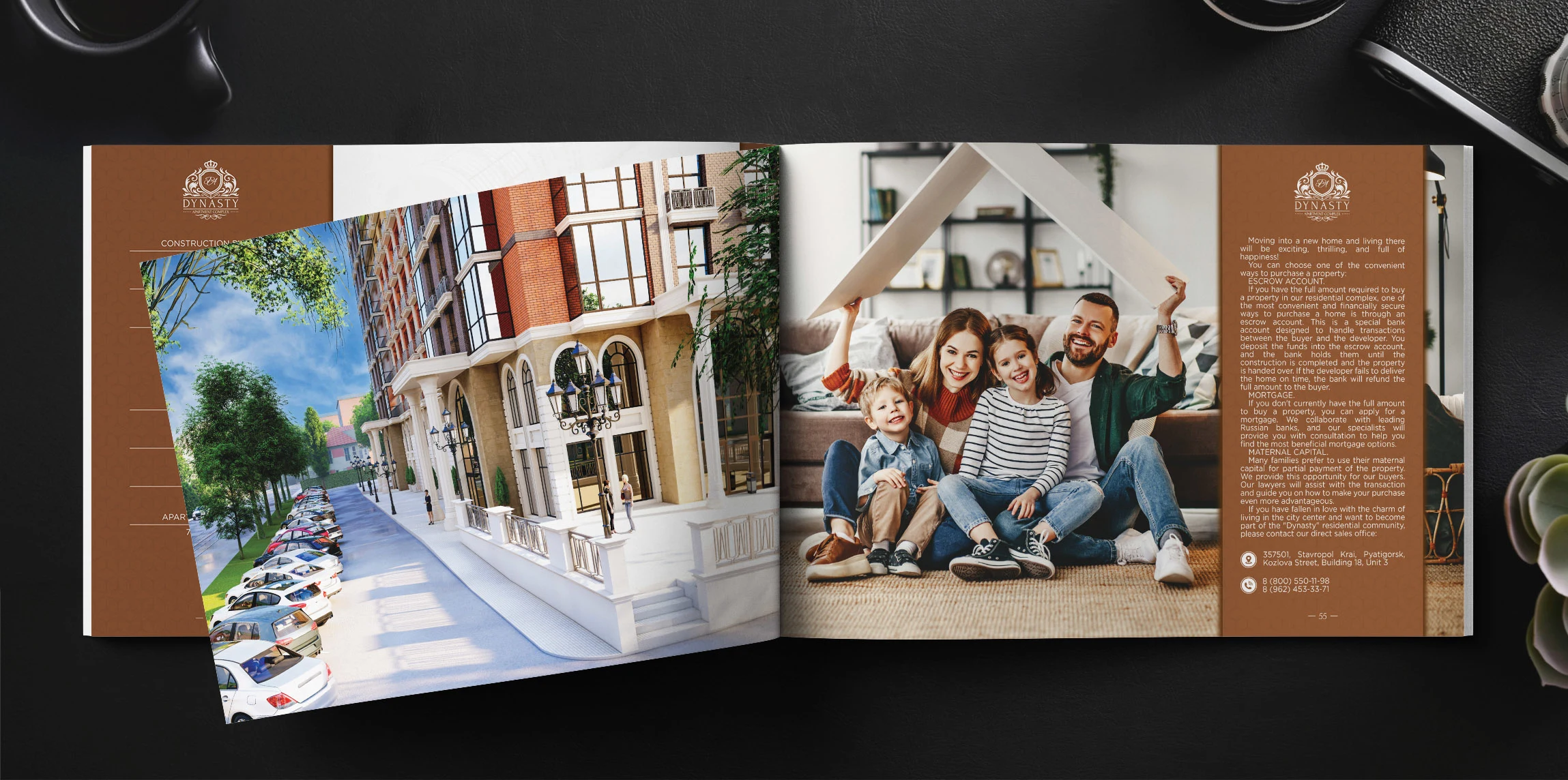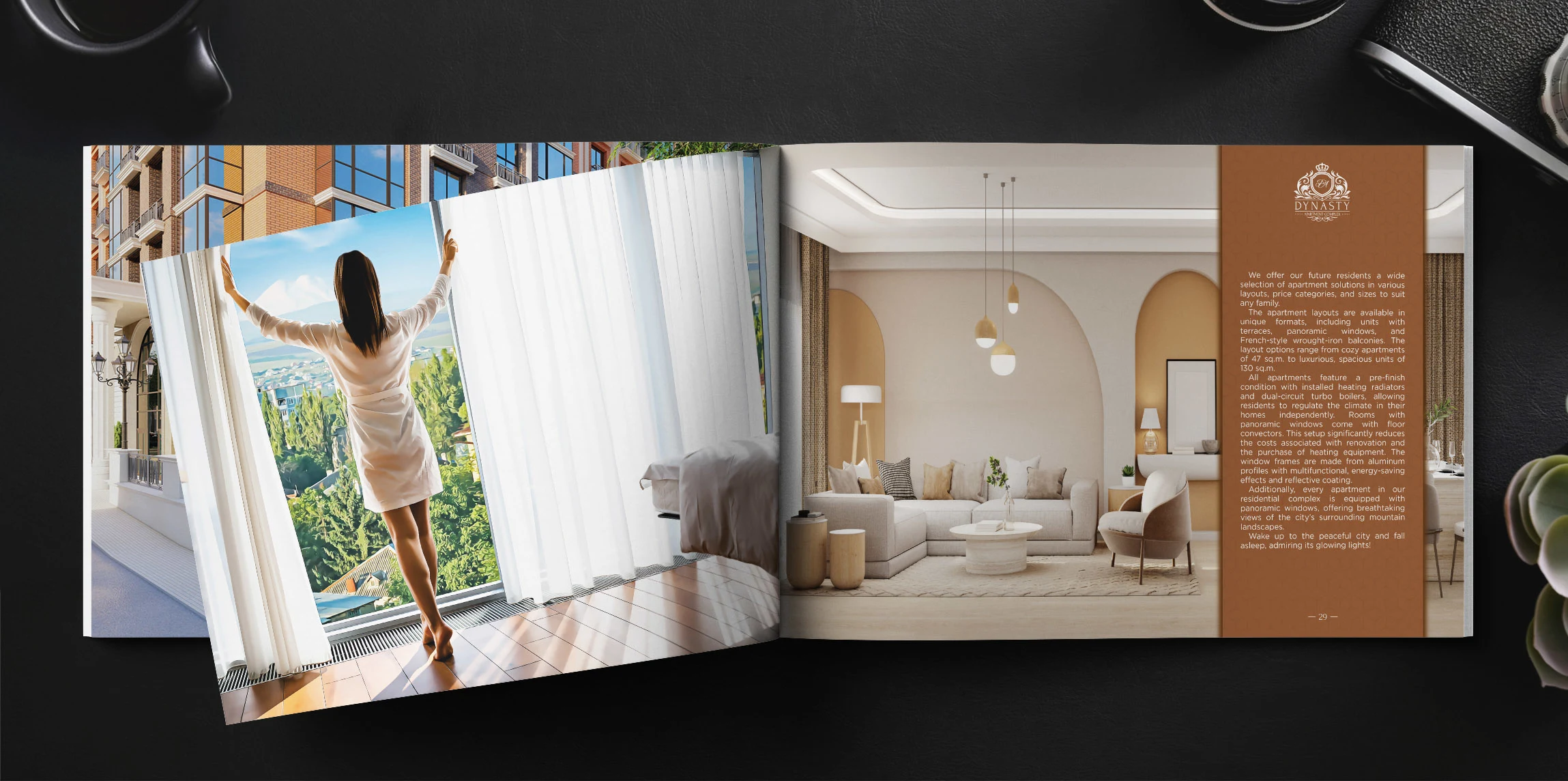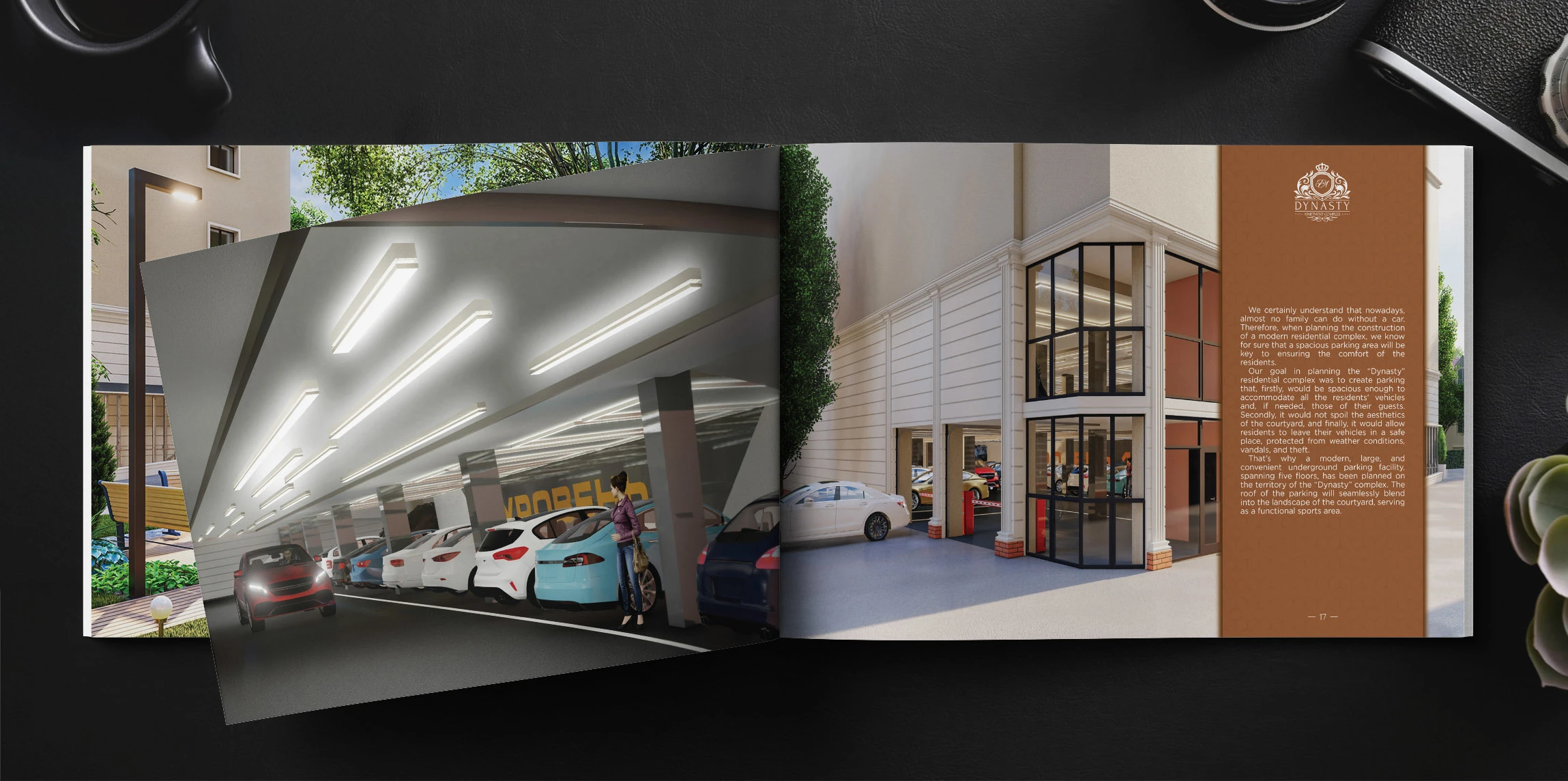 The "Dynasty" apartment complex project began with the creation of a logotype. Next, 3D renders were developed in collaboration with a designer and refined to seamlessly integrate the buildings into the existing landscape. A presentation brochure was then designed, with attention to clean layout and elegant typography.
