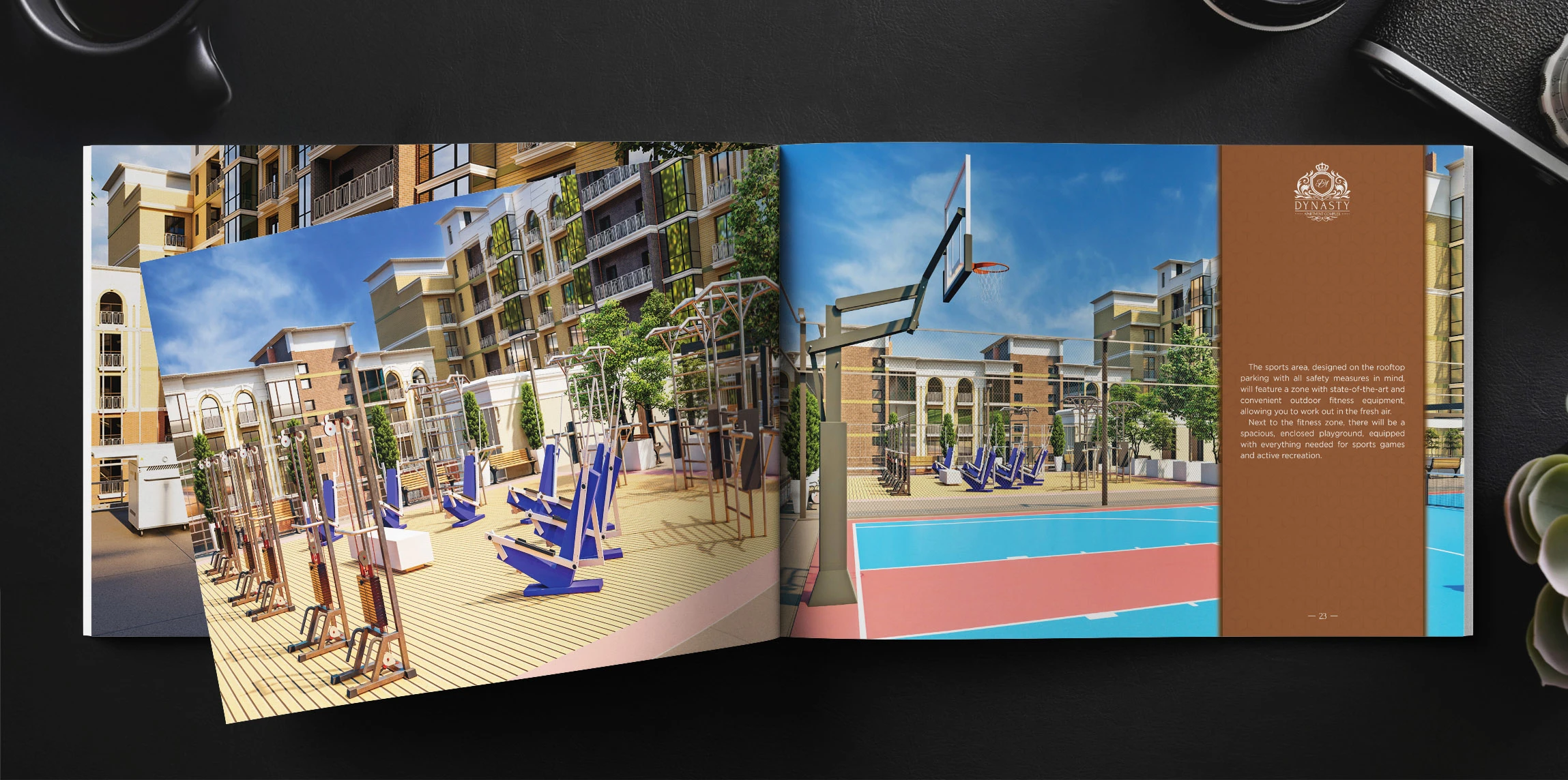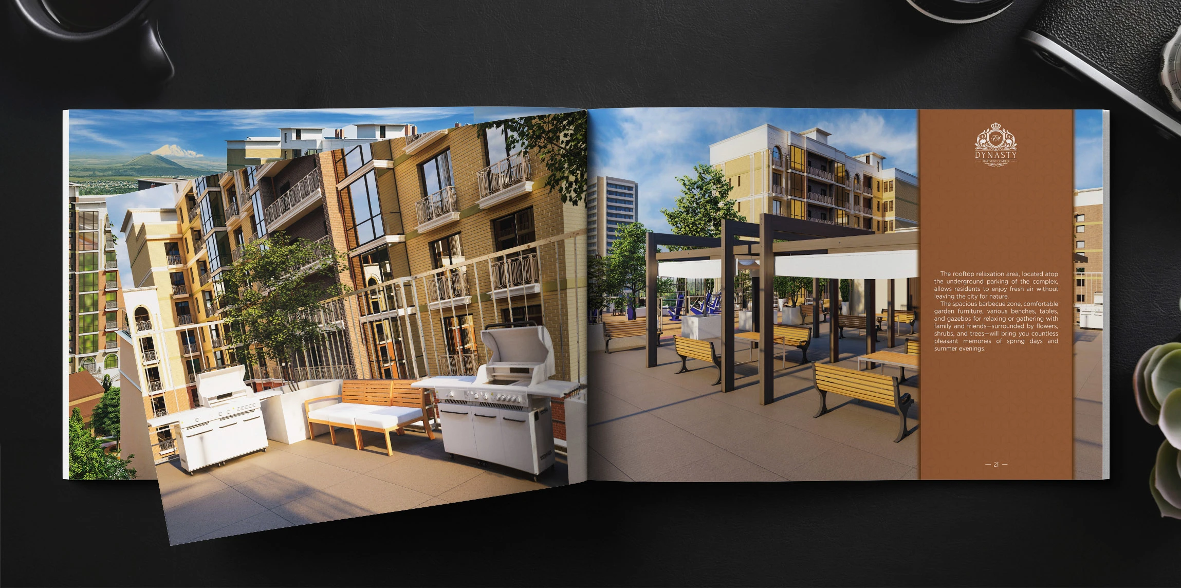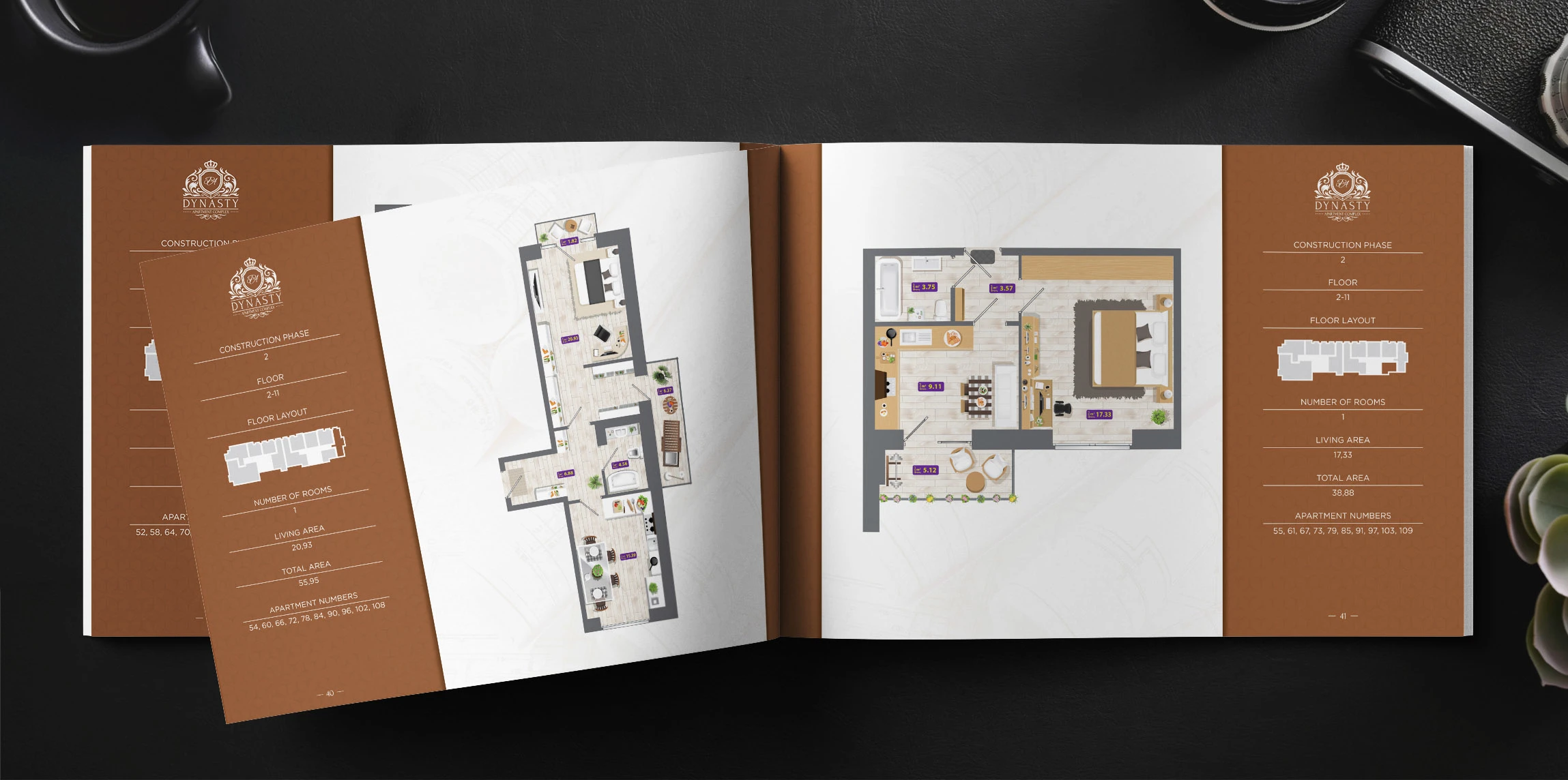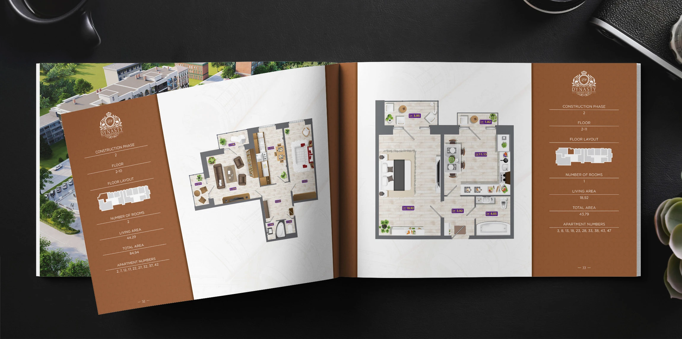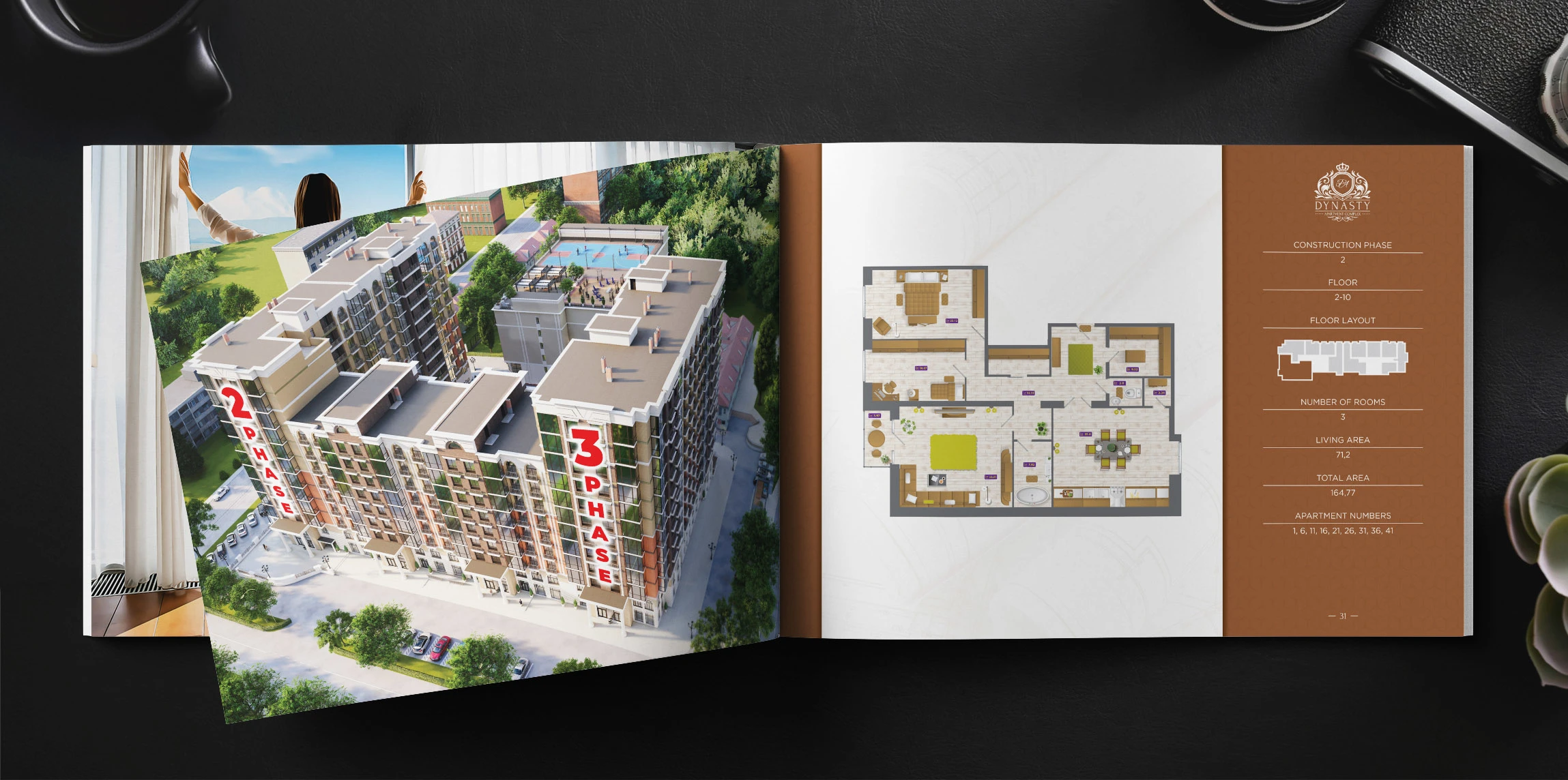 The "Dynasty" apartment complex project began with the creation of a logotype. Next, 3D renders were developed in collaboration with a designer and refined to seamlessly integrate the buildings into the existing landscape. A presentation brochure was then designed, with attention to clean layout and elegant typography.