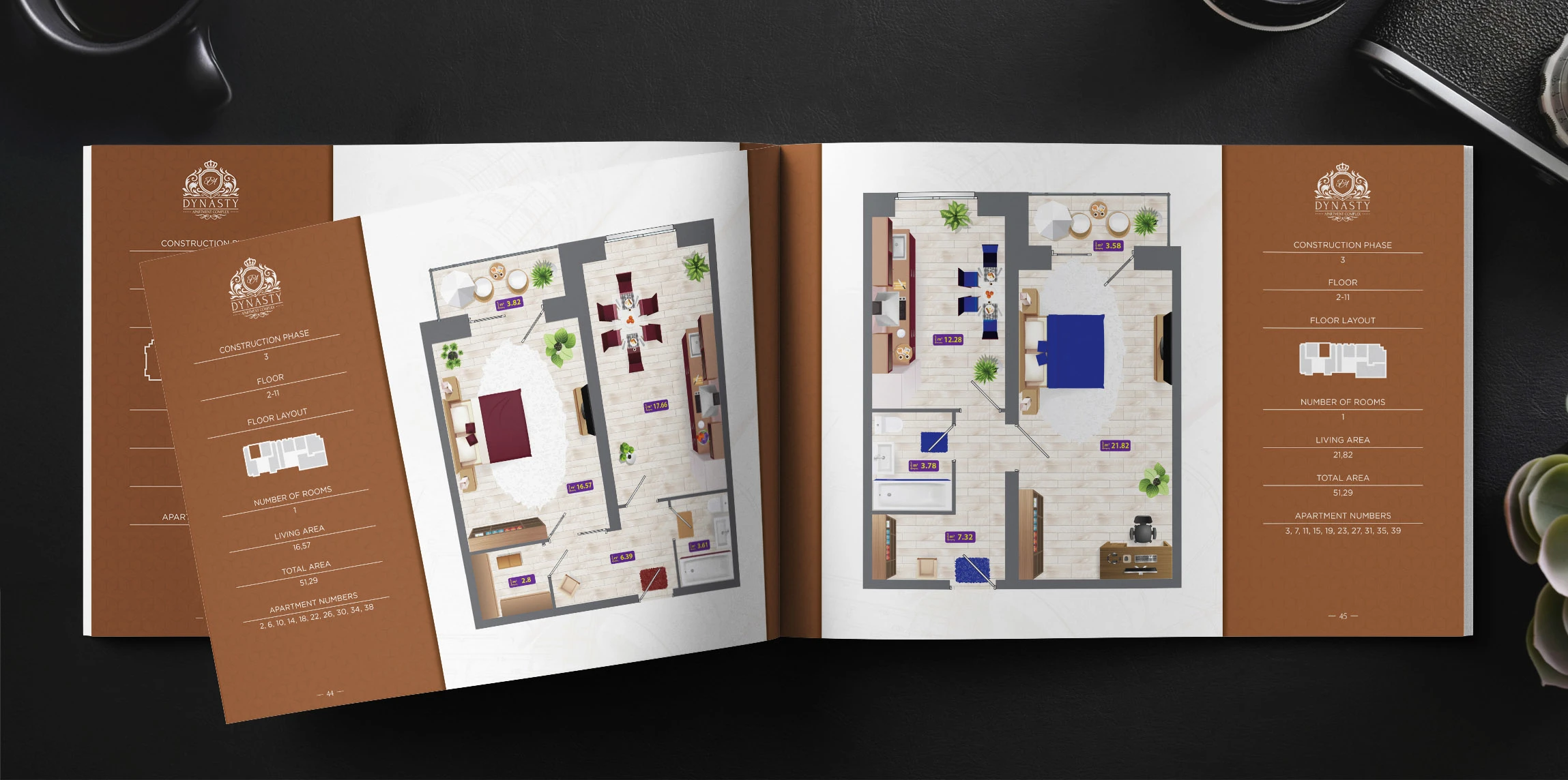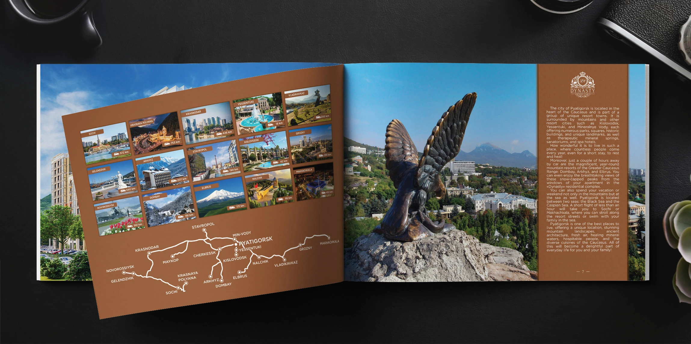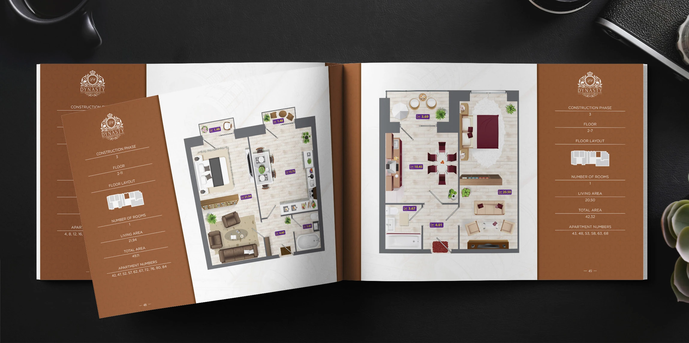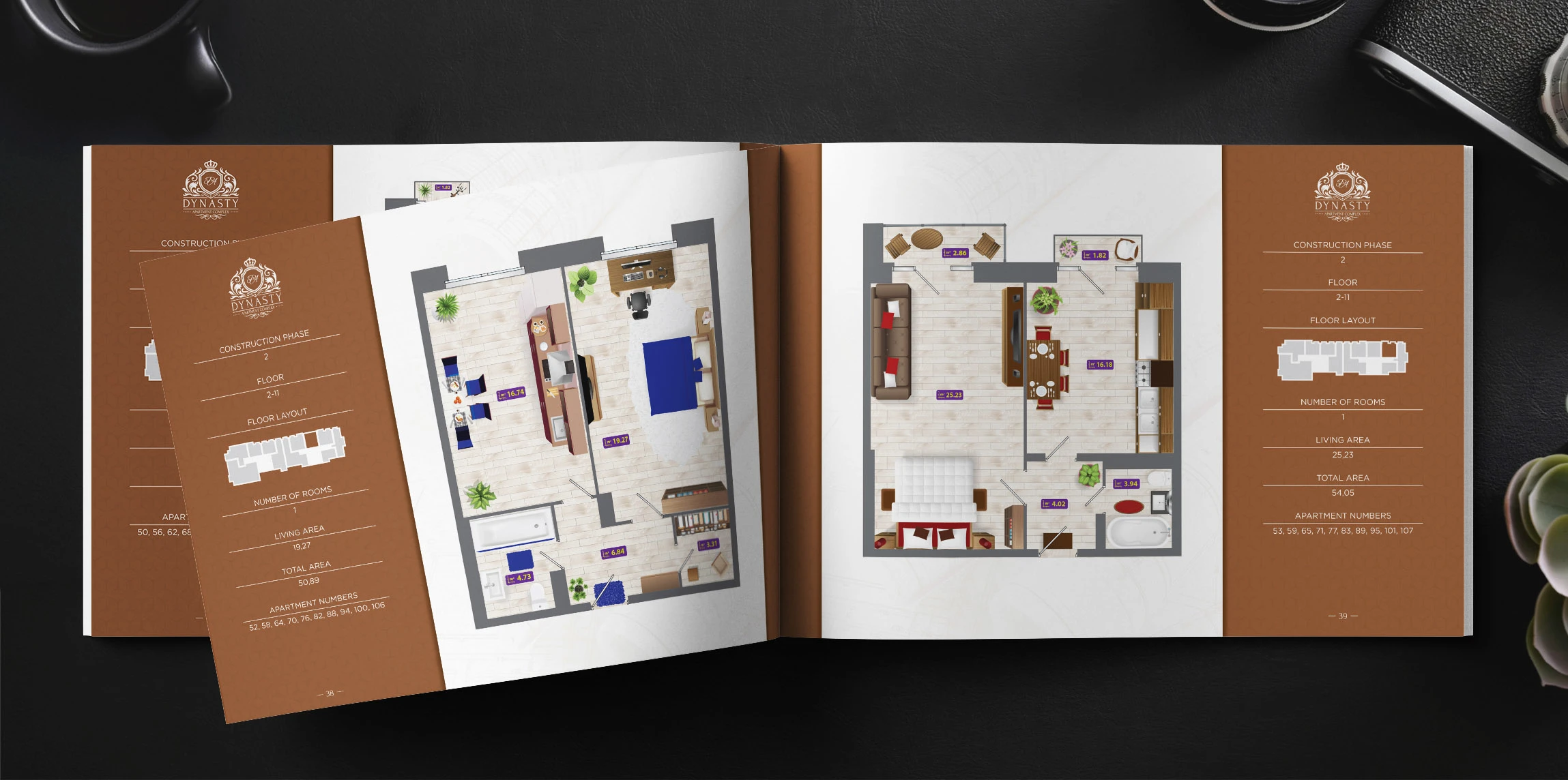The "Dynasty" apartment complex project began with the creation of a logotype. Next, 3D renders were developed in collaboration with a designer and refined to seamlessly integrate the buildings into the existing landscape. A presentation brochure was then designed, with attention to clean layout and elegant typography.
